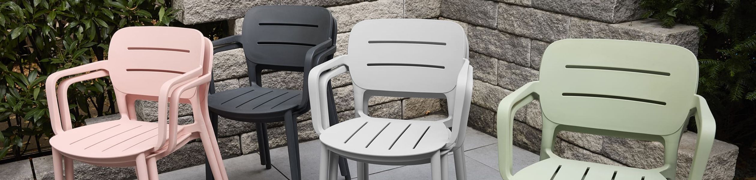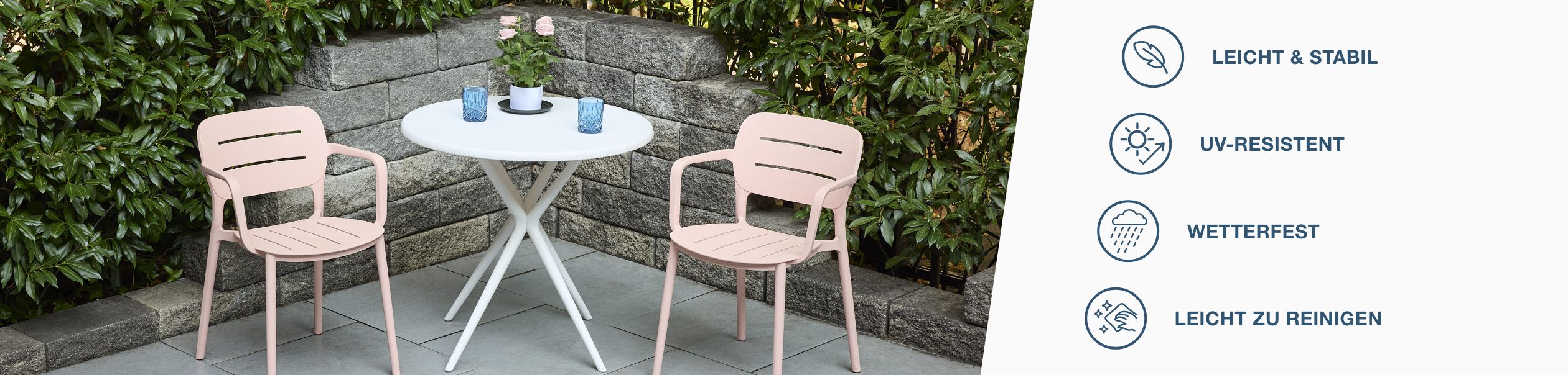 Die hochwertigen Kunststoffmöbel sind UV-beständig, wetterfest und besonders leicht zu reinigen.