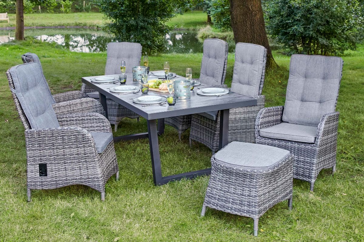 LC Garden »Bailado« Gartenset 200cm Esstisch V-Fuß Keramik Tischplatte grau + 6 Gartenstühle omega-grau verstellbar