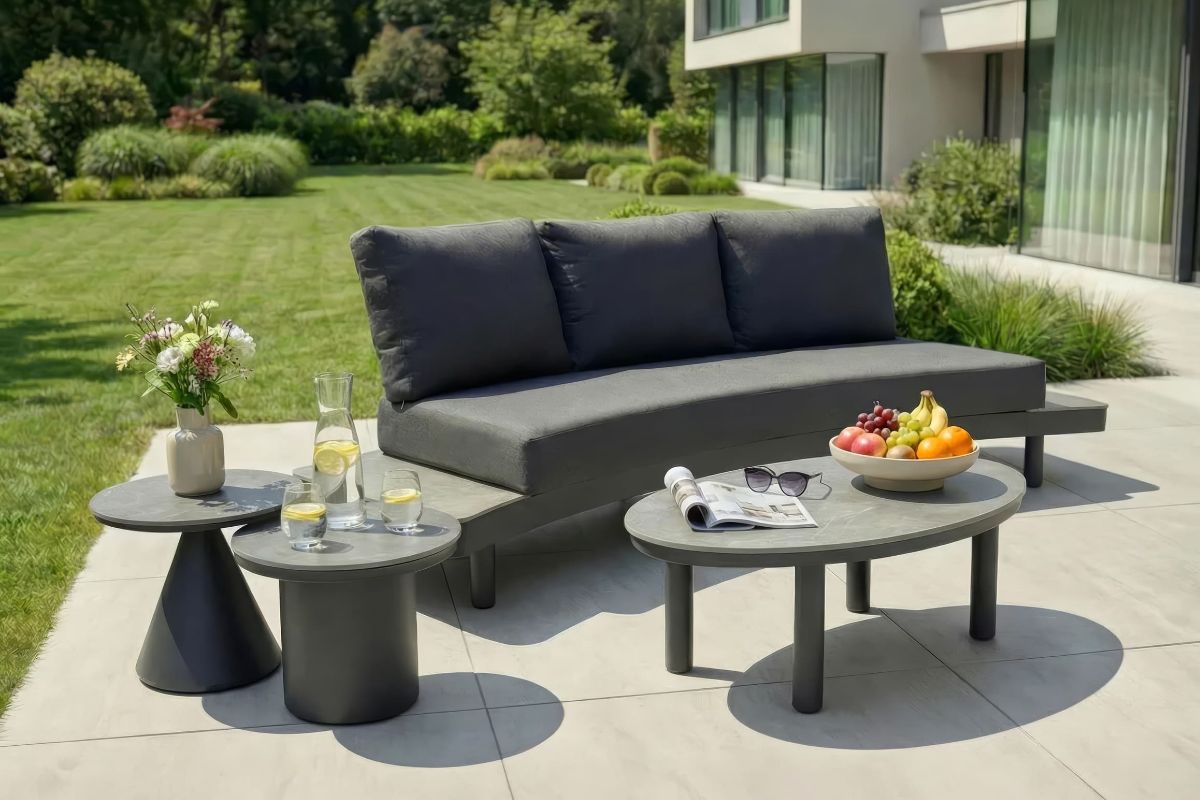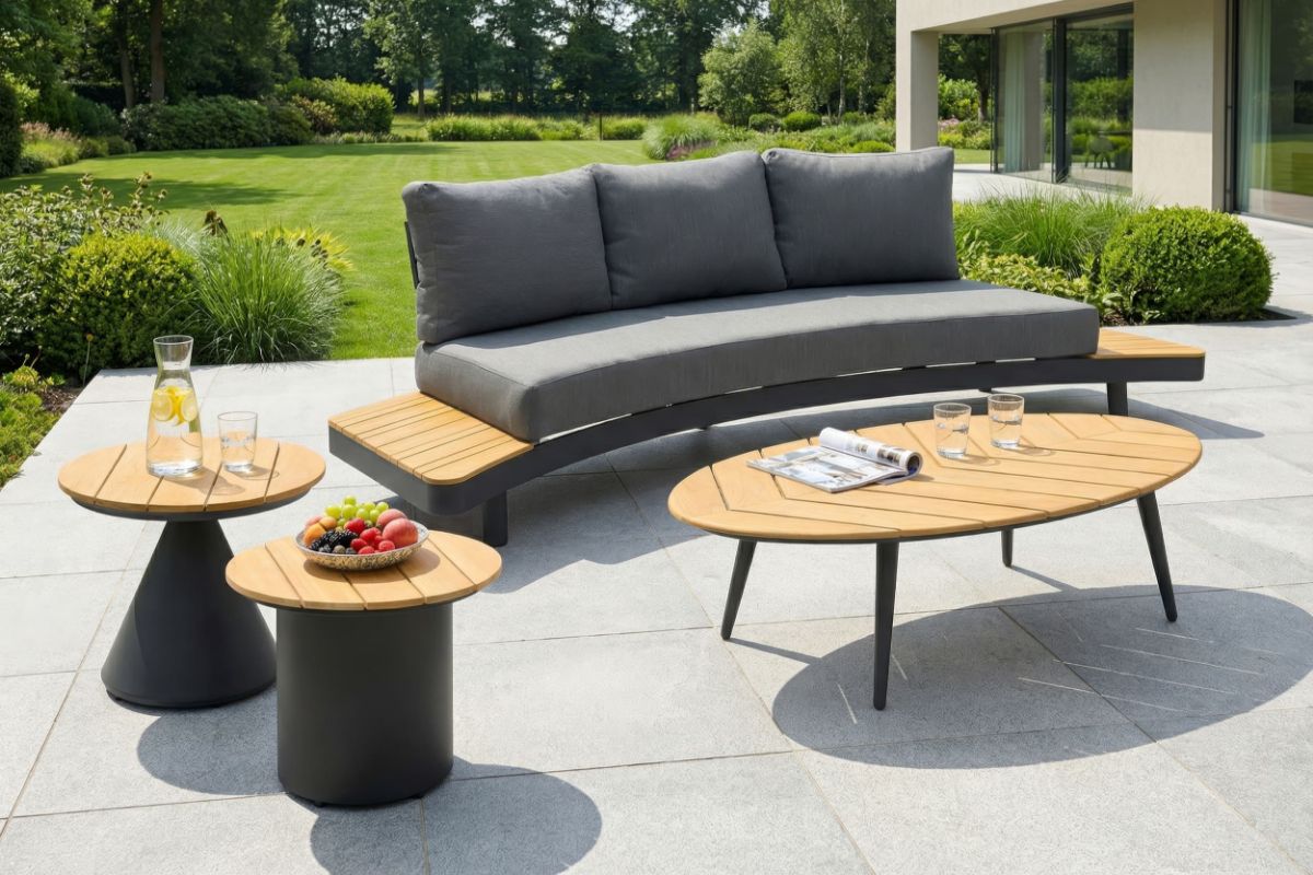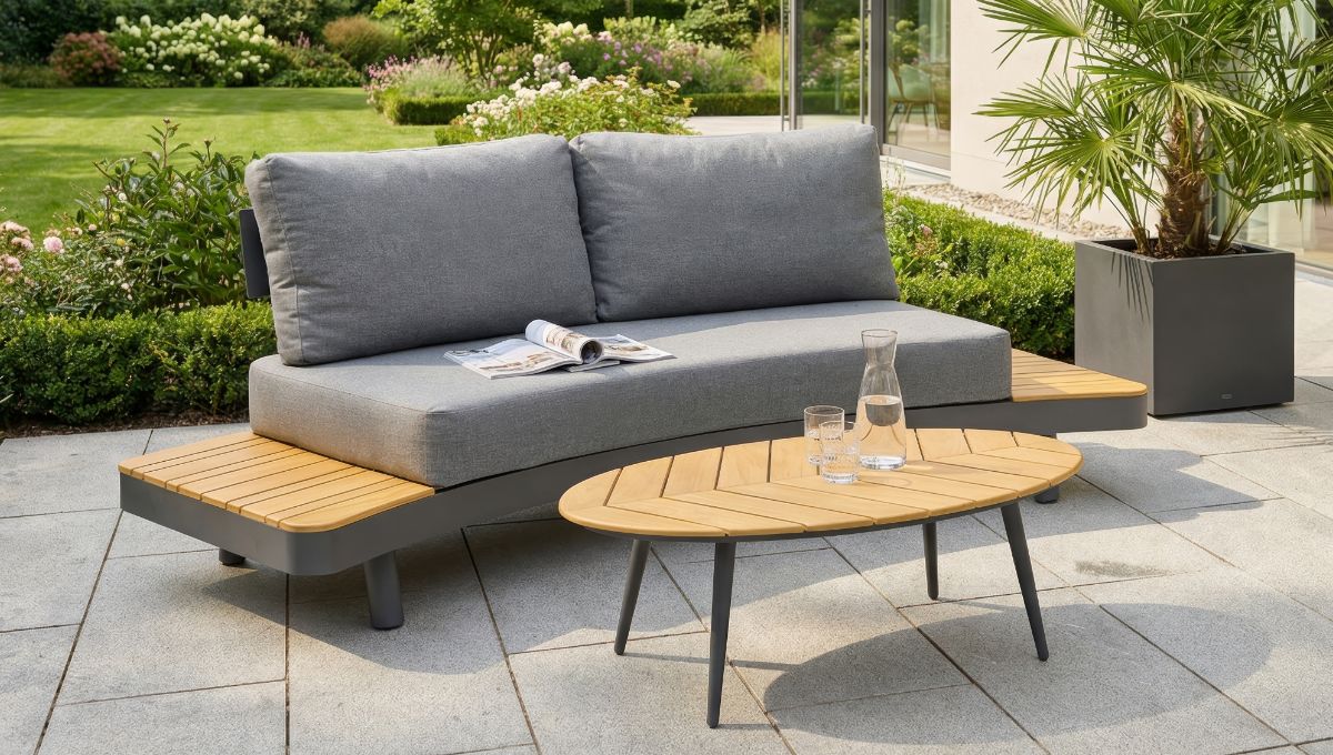 Dunkles Aluminium trifft auf warme Holz-Akzente und kühle Beton-Optik – ein modernes Lounge-Ensemble mit cleveren Details.