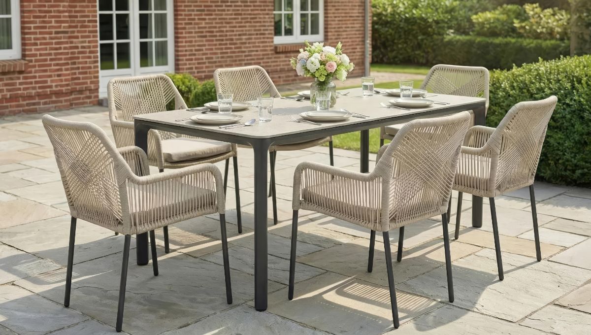 Luftiges Rope-Geflecht trifft auf eine langlebige Tischplatte in Stein-Optik – ein elegantes Ensemble für modernes Outdoor-Dining.