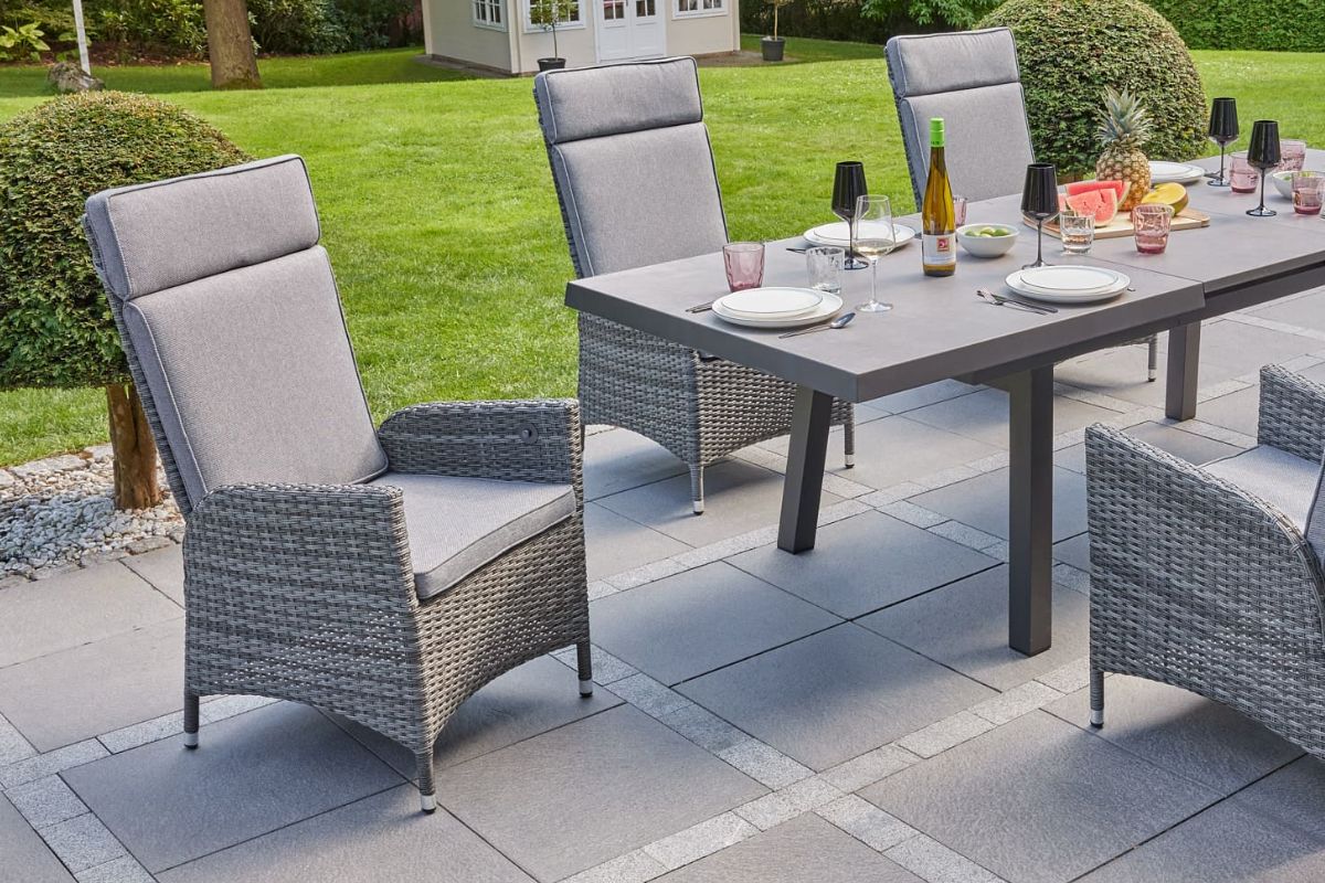 Hochwertiges Geflecht trifft auf stufenlose Verstellbarkeit – ein gemütlicher Hochlehner für entspannte Stunden in Ihrem Außenbereich.