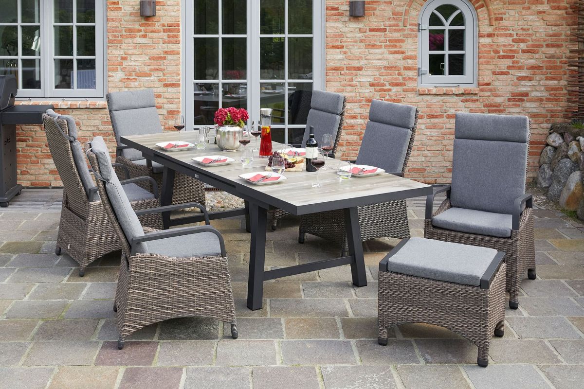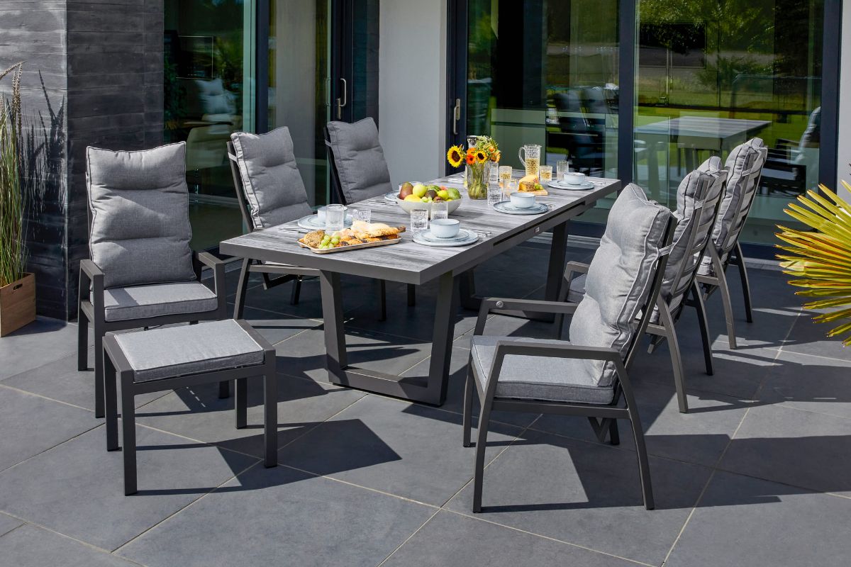 Die Konstruktion aus spezialbehandeltem Aluminium macht diese Sets zu extrem langlebigen Begleitern, die trotz ihrer Größe leicht zu arrangieren sind. Hochwertige Fasern und Gewebe sind so veredelt, dass sie Nässe und starker Sonneneinstrahlung mühelos trotzen, ohne an Spannkraft oder Farbintensität zu verlieren. Die unkomplizierte Pflege ermöglicht es Ihnen, selbst bei einer großen Anzahl an Sitzplätzen den Reinigungsaufwand minimal zu halten. Dank der präzisen Verarbeitung und belastbarer Bodengleiter bleibt die gesamte Gruppe auch bei häufiger Nutzung standsicher und schont dabei dauerhaft die Oberflächen Ihrer Terrasse.