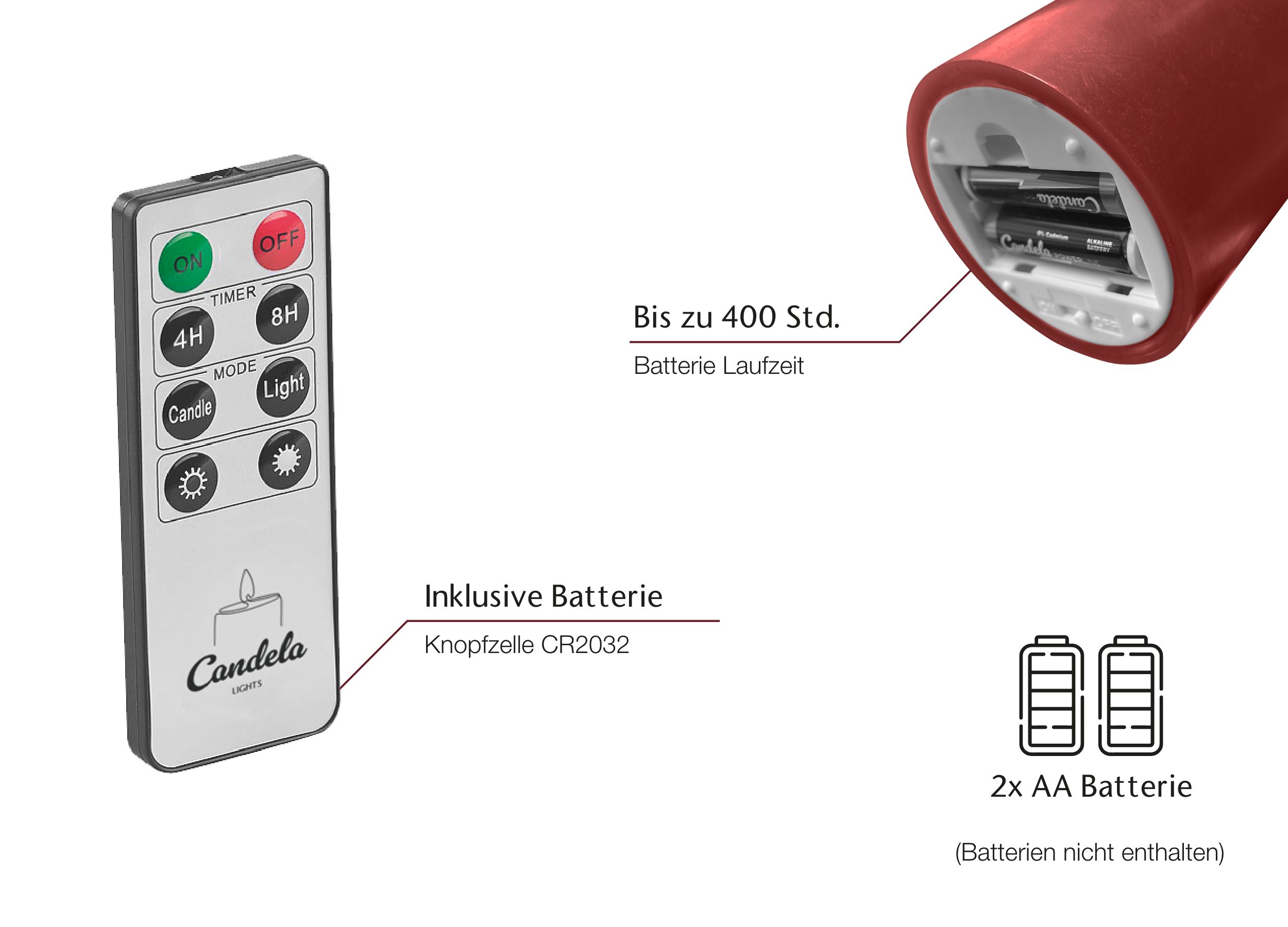 Sie benötigen für den Betrieb pro Kerze 2xAA Batterien. Bitte beachten Sie unsere Batterie-, Entsorgungs- sowie Elektrohinweise für die Produkte von LC Home.