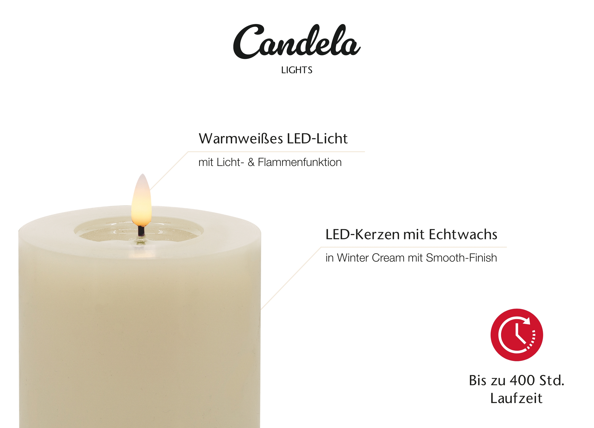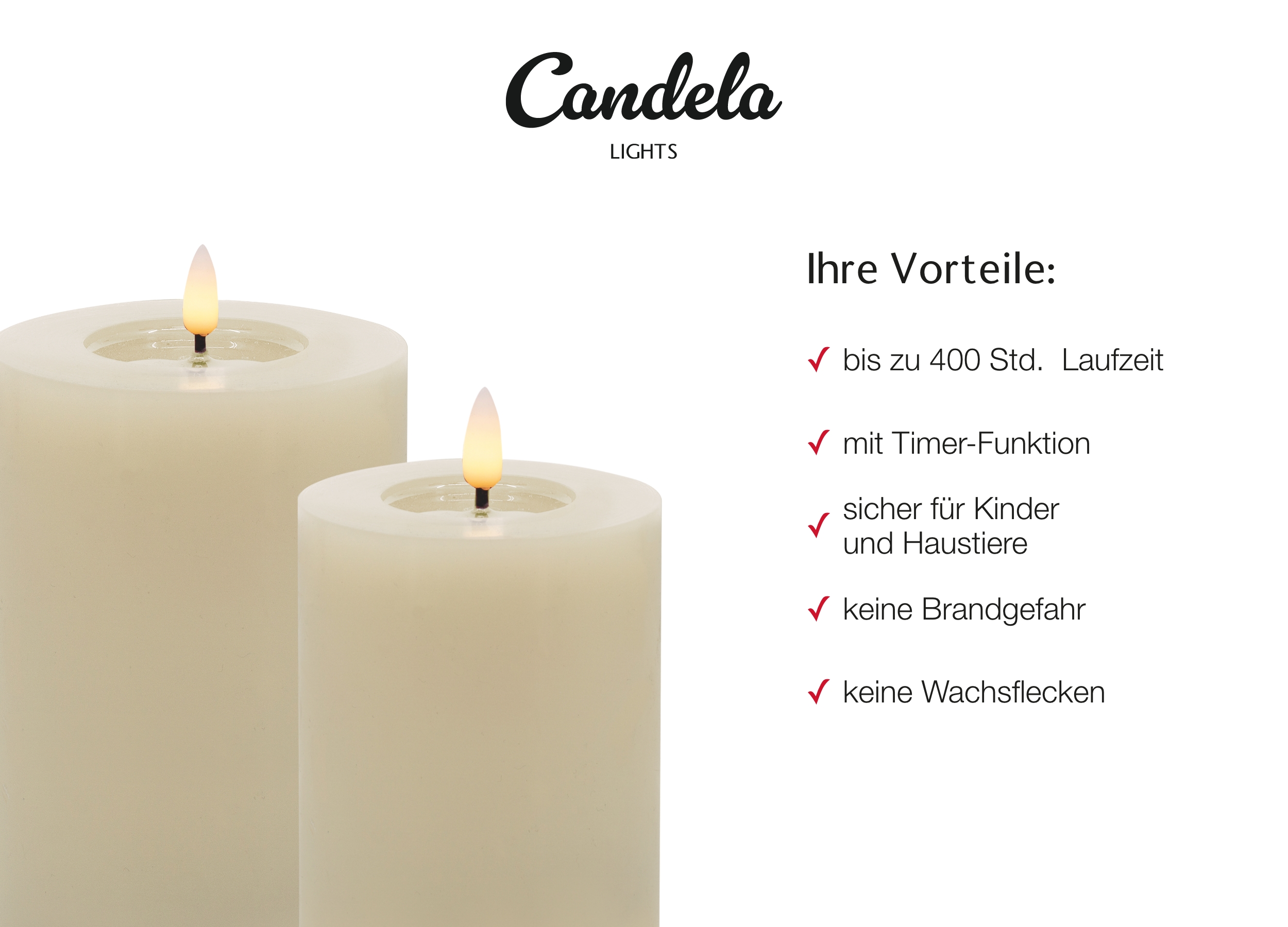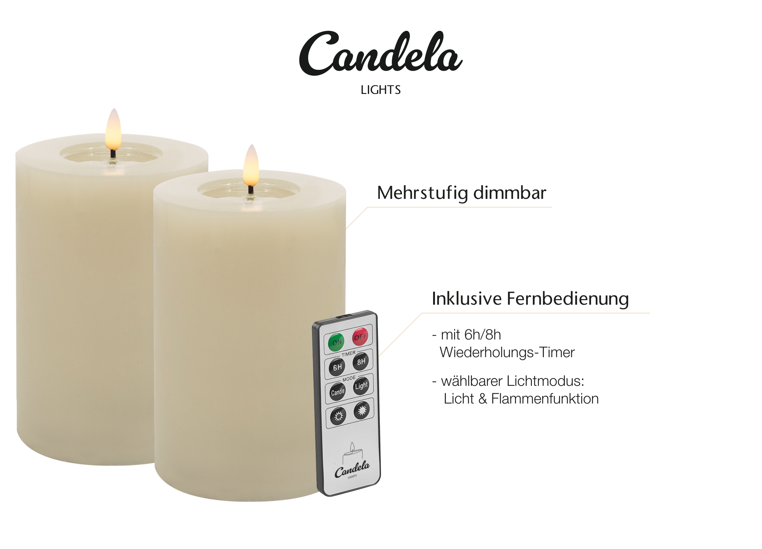 Candela LED Kerzen 2er Set H:15xØ10cm Winter creme glatt Echtwachs mit Fernbedienung Timer Funktion & mehrstufig dimmbar flammenlos Echtwachskerzen Stumpenkerze