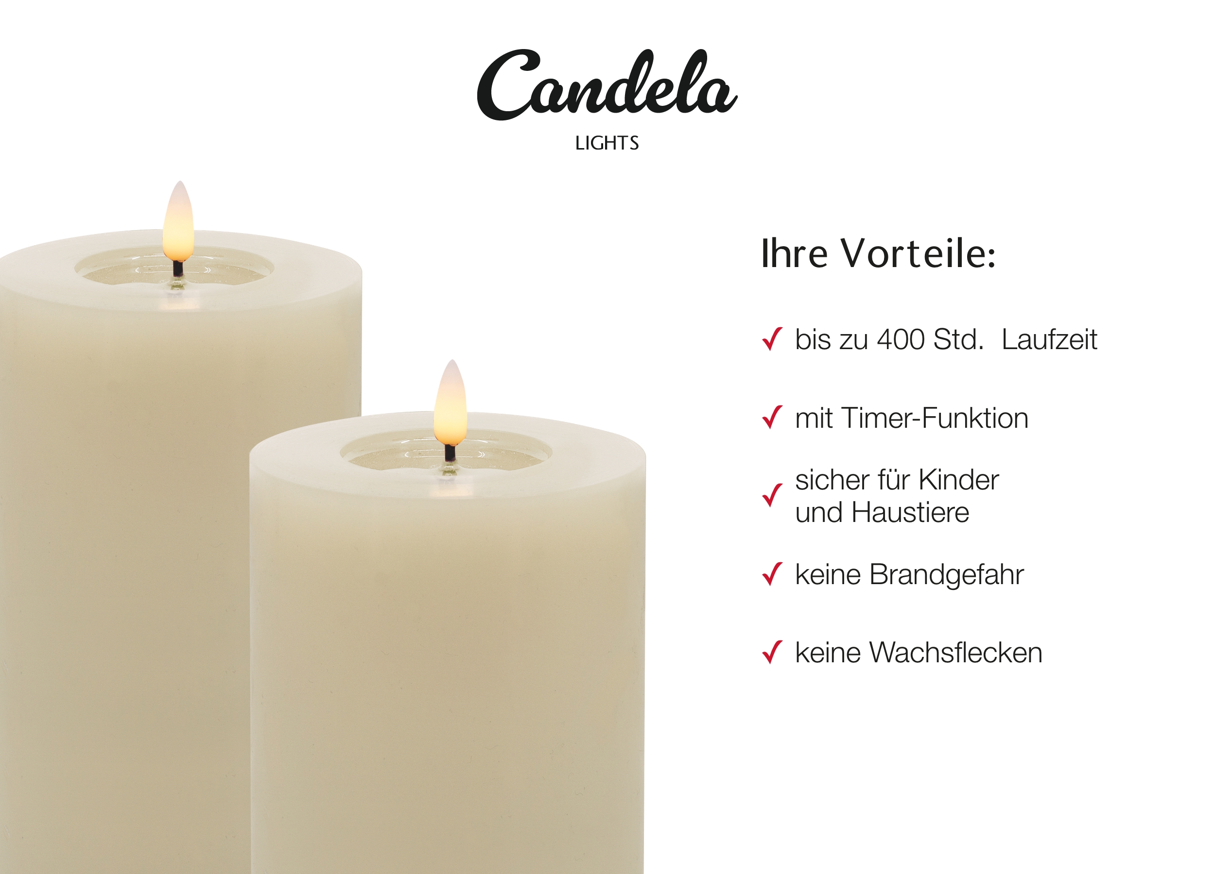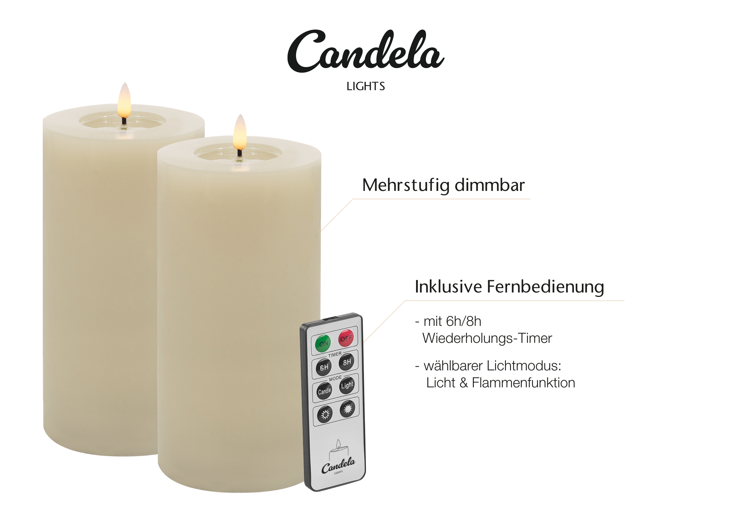 Candela LED Kerzen 2er Set H:20xØ10cm Winter creme glatt Echtwachs mit Fernbedienung Timer Funktion & mehrstufig dimmbar flammenlos Echtwachskerzen Stumpenkerze