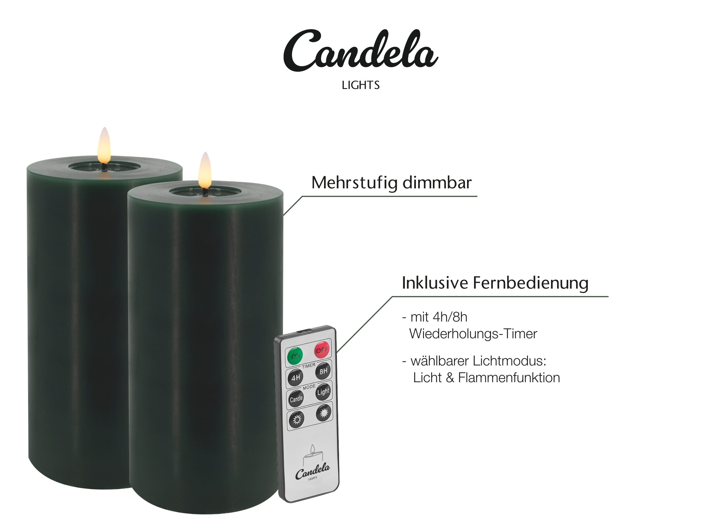 Candela LED Kerzen 2er Set H:20xØ10cm Winter Green Smooth-Finish Echtwachs mit Fernbedienung Timer Funktion & mehrstufig dimmbar flammenlos Echtwachskerzen Stumpenkerze