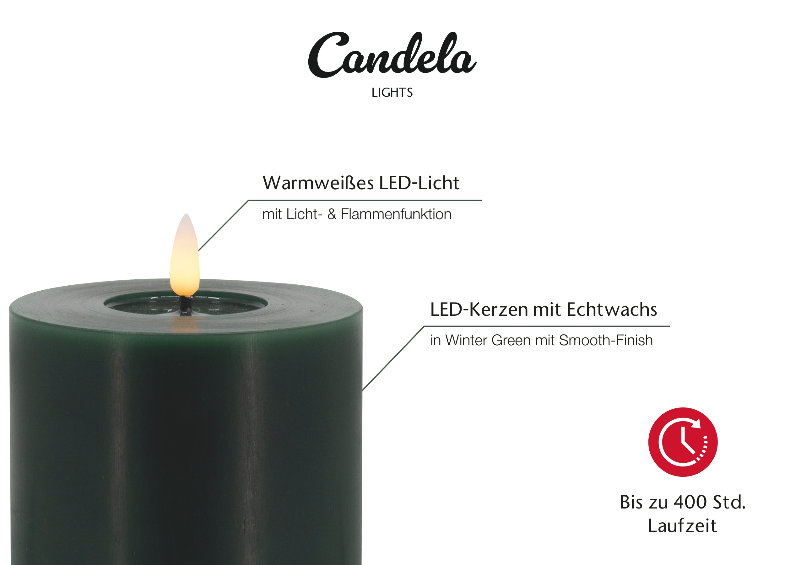 - LED-Technologie: energiesparende LED-Technologie, Flammeneffekt und feste Flamme (Dauerlicht)