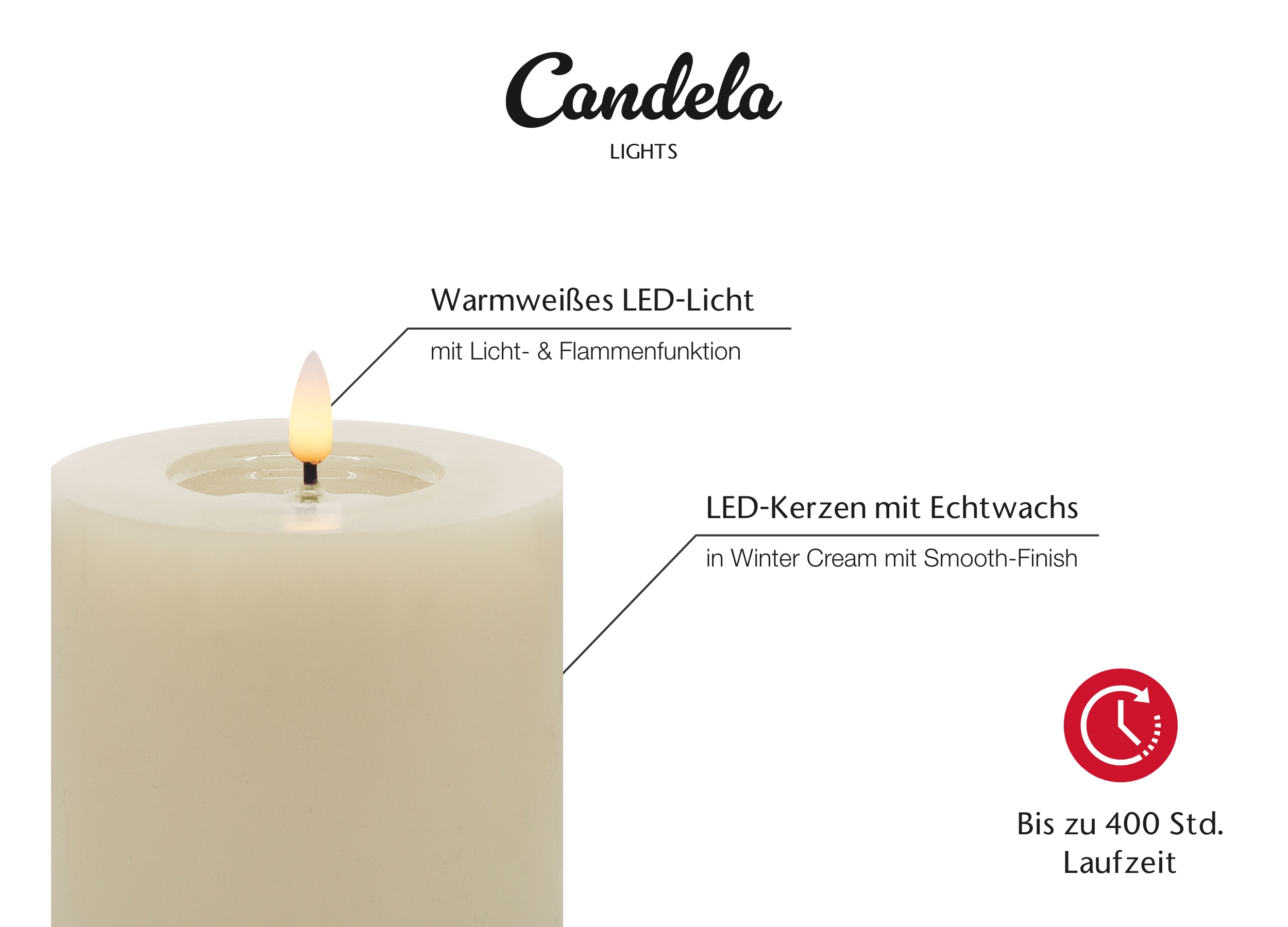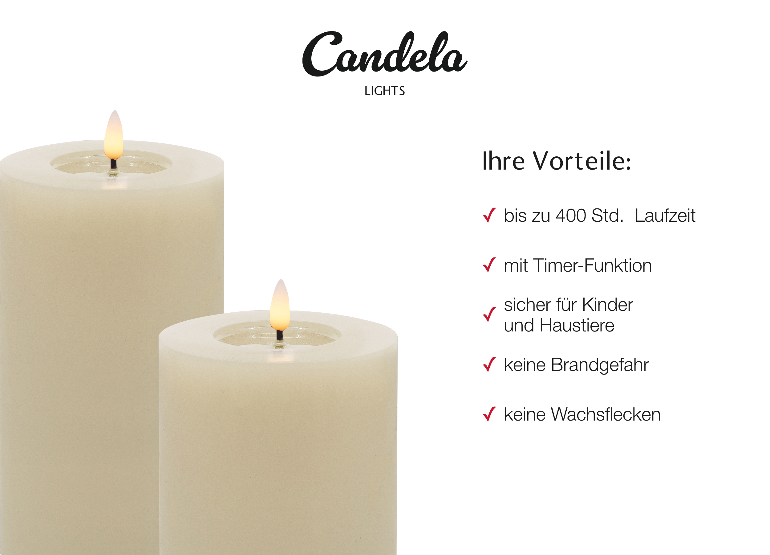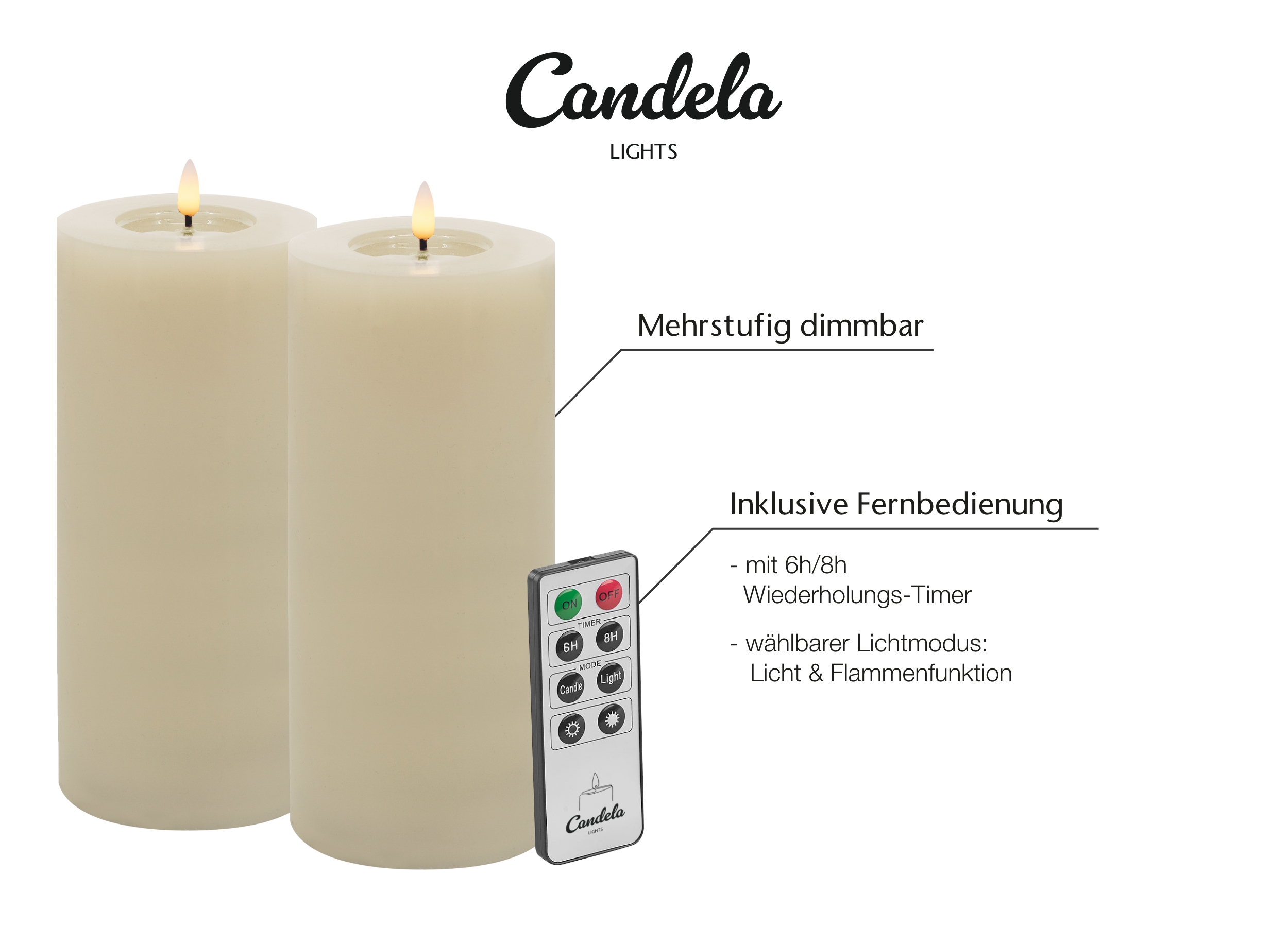 Candela LED Kerzen 2er Set H:25xØ10cm Winter creme glatt Echtwachs mit Fernbedienung Timer Funktion & mehrstufig dimmbar flammenlos Echtwachskerzen Stumpenkerze