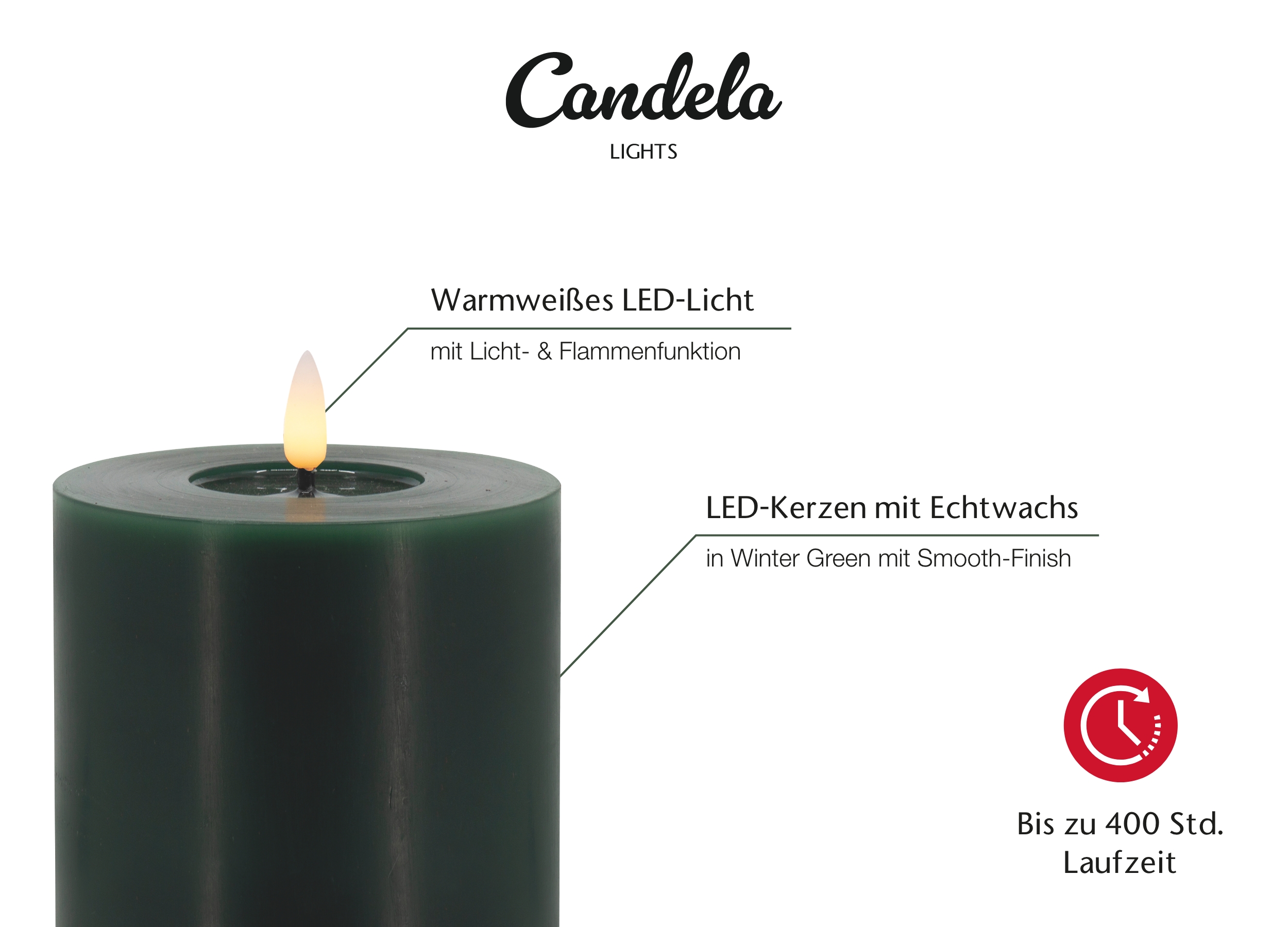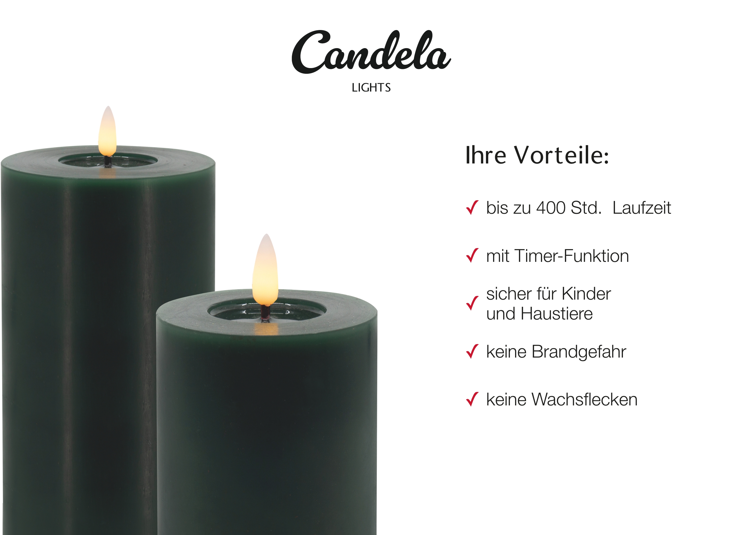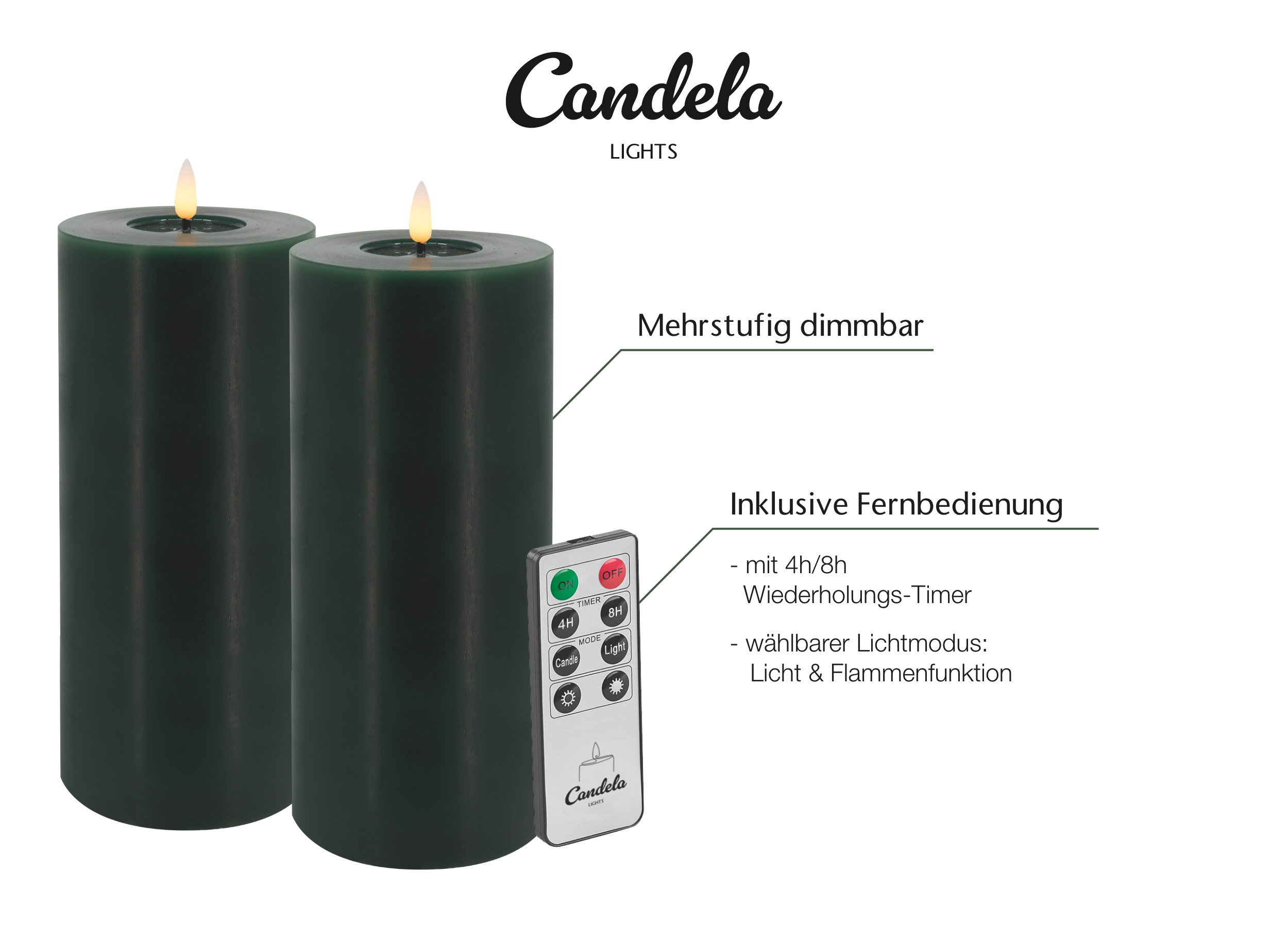 Candela LED Kerzen 2er Set H:25xØ10cm Winter Green Smooth-Finish Echtwachs mit Fernbedienung Timer Funktion & mehrstufig dimmbar flammenlos Echtwachskerzen Stumpenkerze