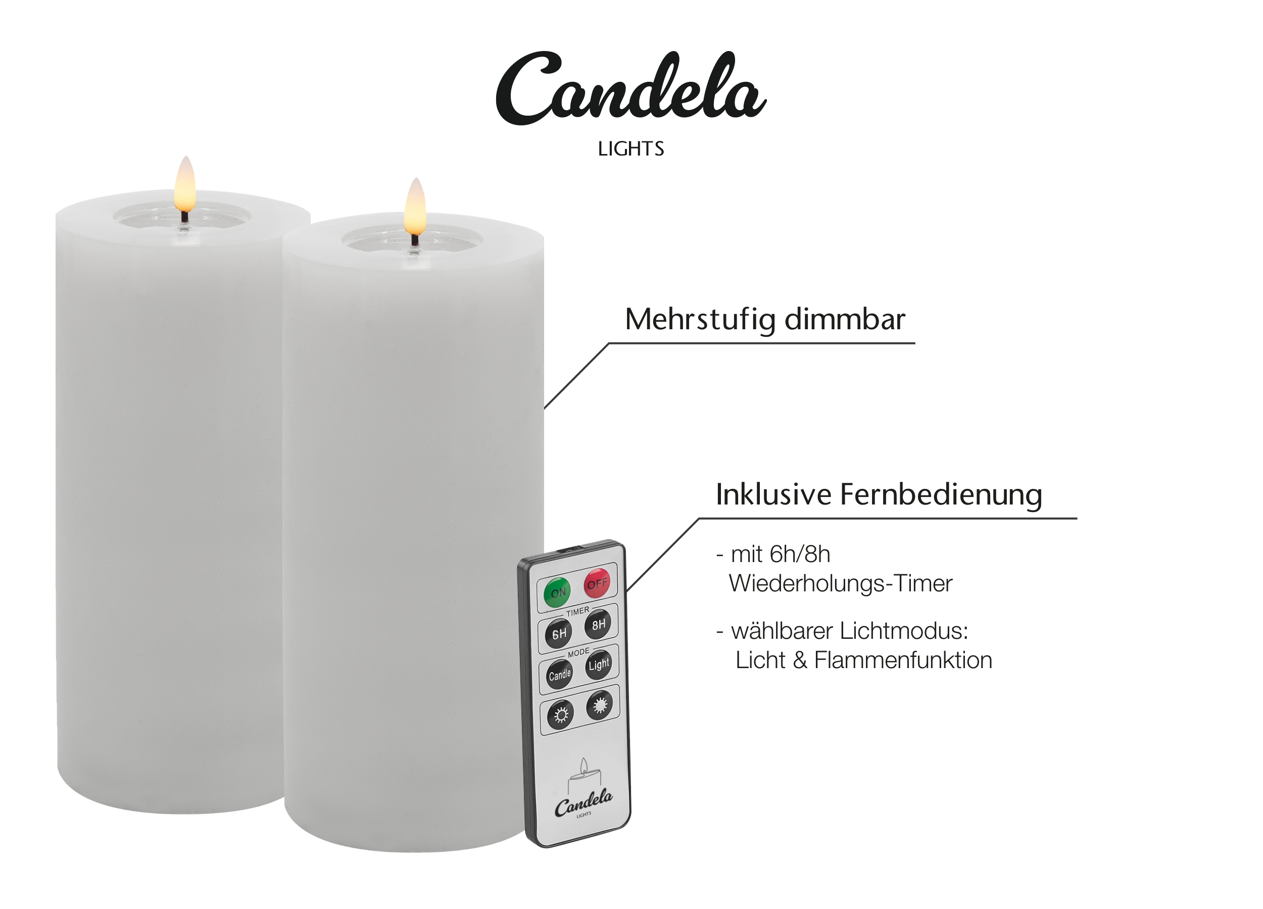 Candela Lights by LC Home sind hochwertige und handgefertigte Echtwachs LED Kerzen, die vor allem durch Ihre Qualität und Funktionalität zu beeindrucken wissen. Diese Echtwachskerzen mit LED Licht sind eine innovative und sichere Alternative zu herkömmlichen Wachskerzen und wirken so realistisch, dass die praktisch nicht von normal brennenden Kerzen zu unterscheiden sind.