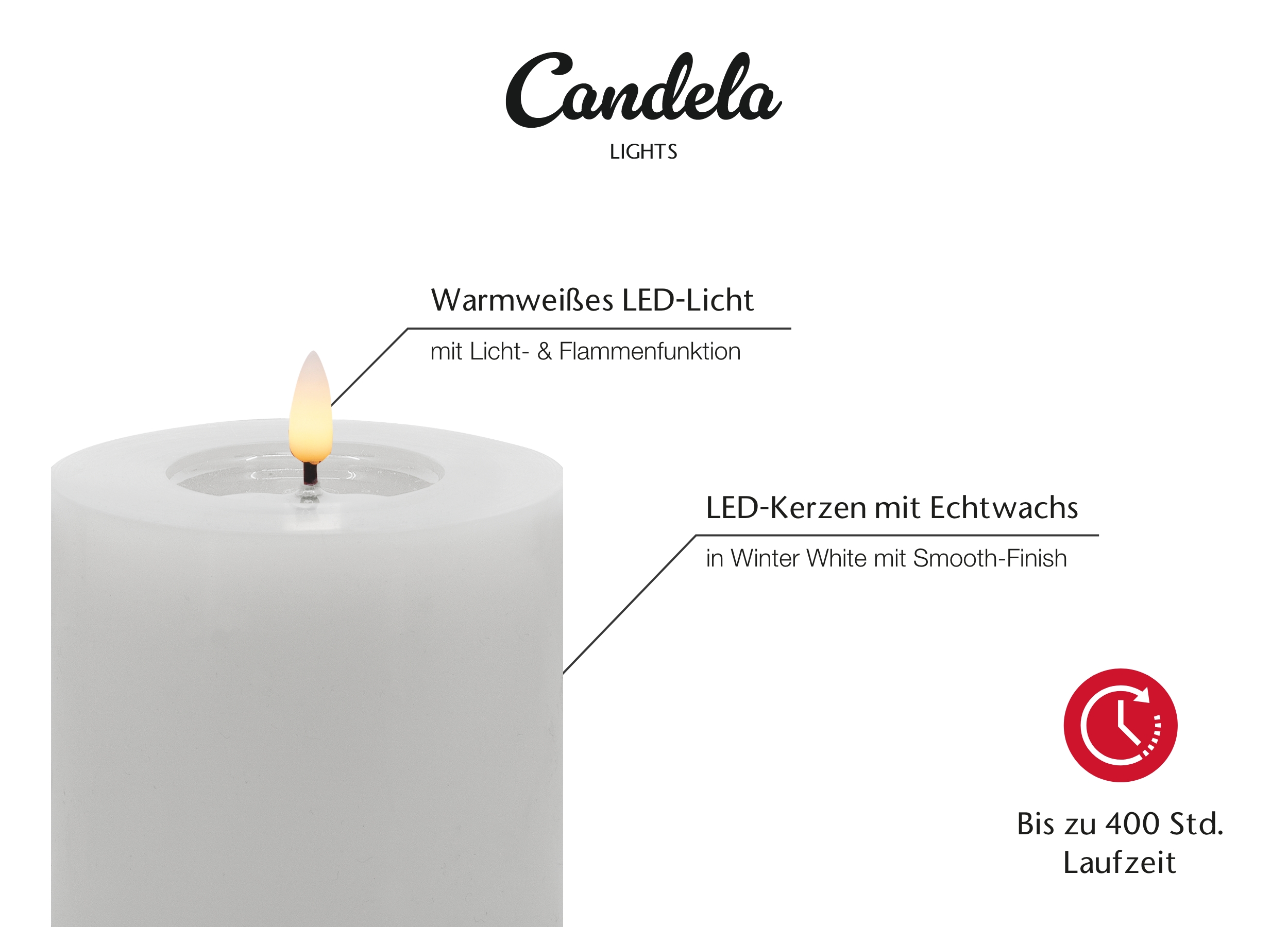 - LED-Technologie: energiesparende LED-Technologie, Flammeneffekt und feste Flamme (Dauerlicht)