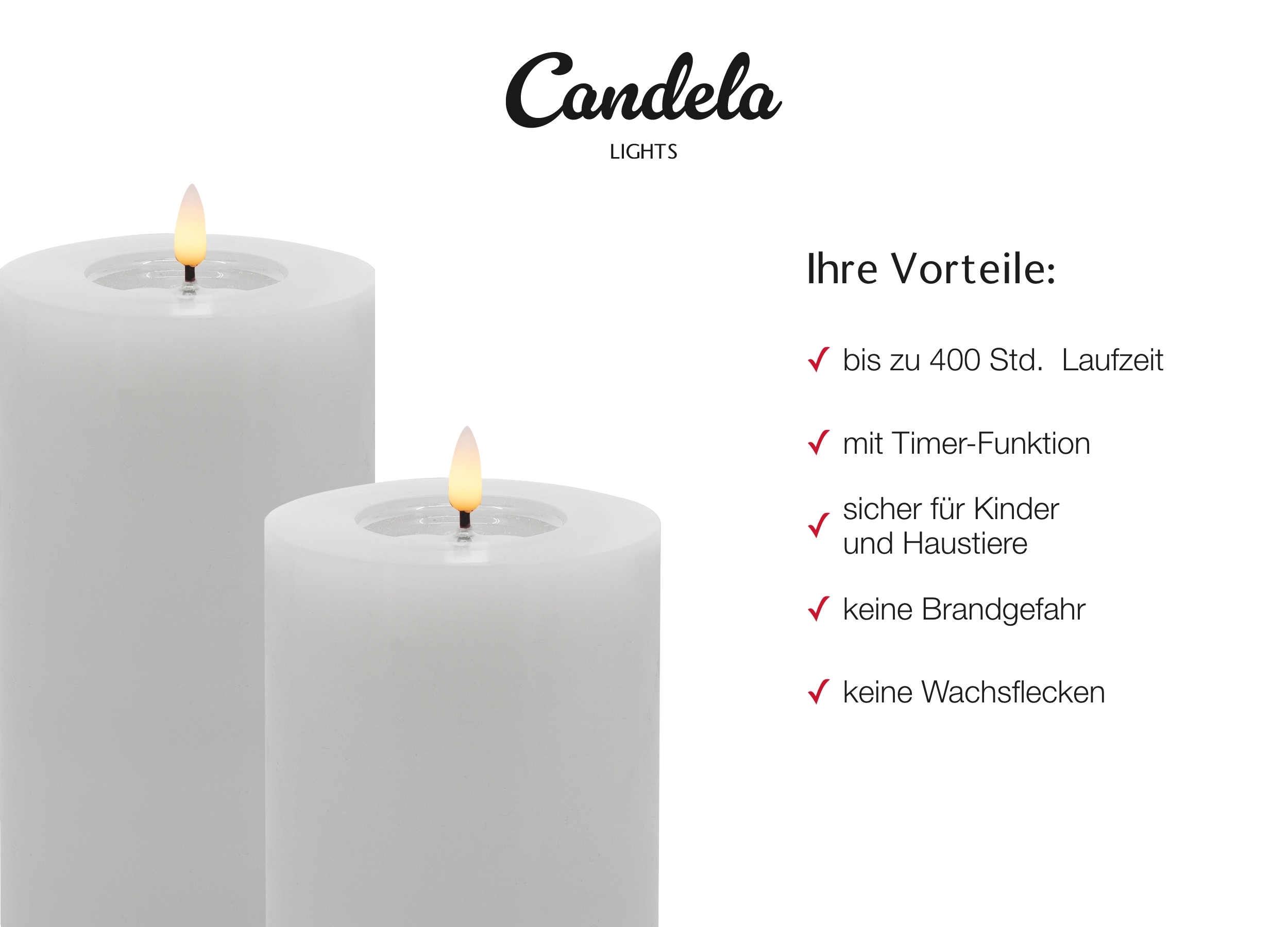 - Sicherheit: keine Brandgefahr, ideal für Haushalte mit Haustieren und kleinen Kindern