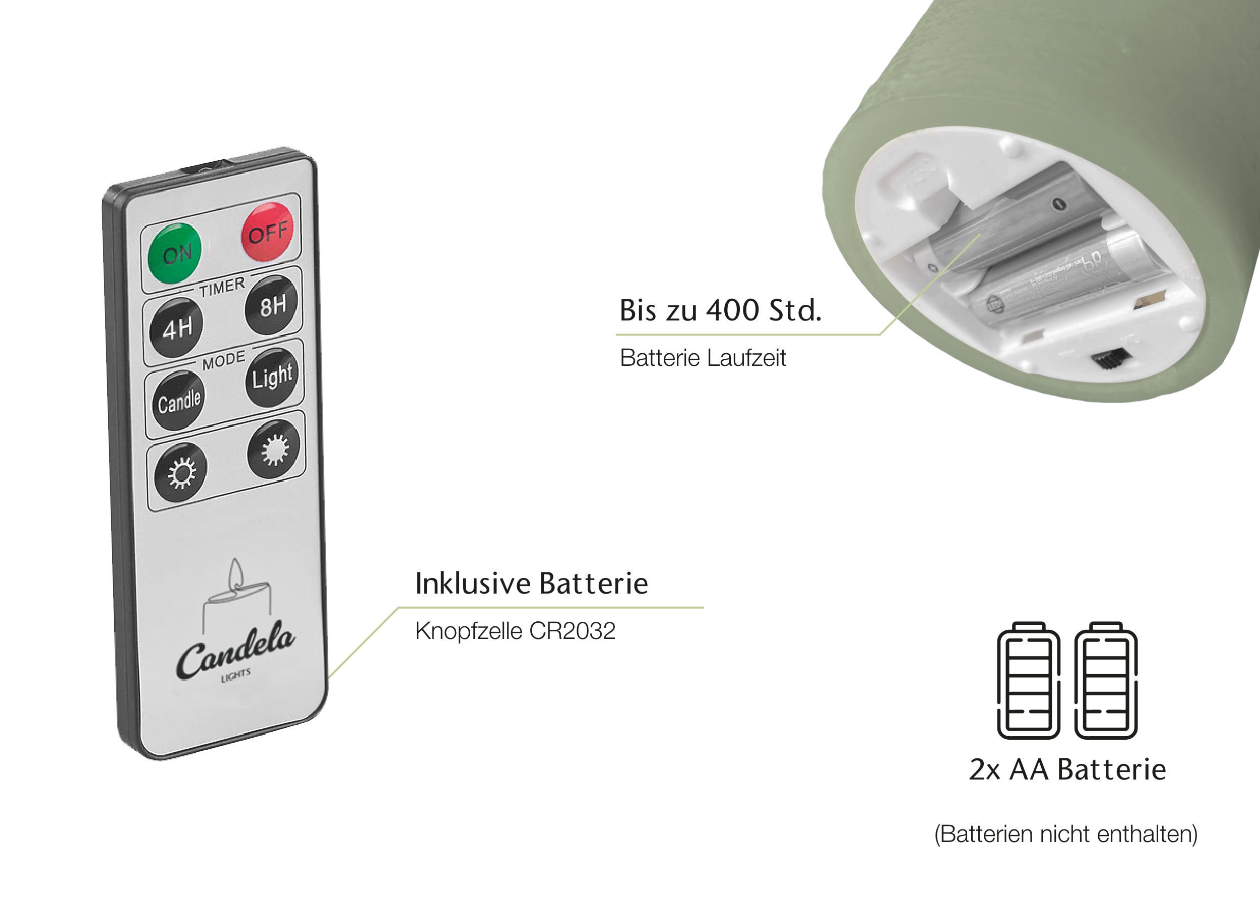 Sie benötigen für den Betrieb pro Kerze 2xAA Batterien. Bitte beachten Sie unsere Batterie-, Entsorgungs- sowie Elektrohinweise für die Produkte von LC Home.