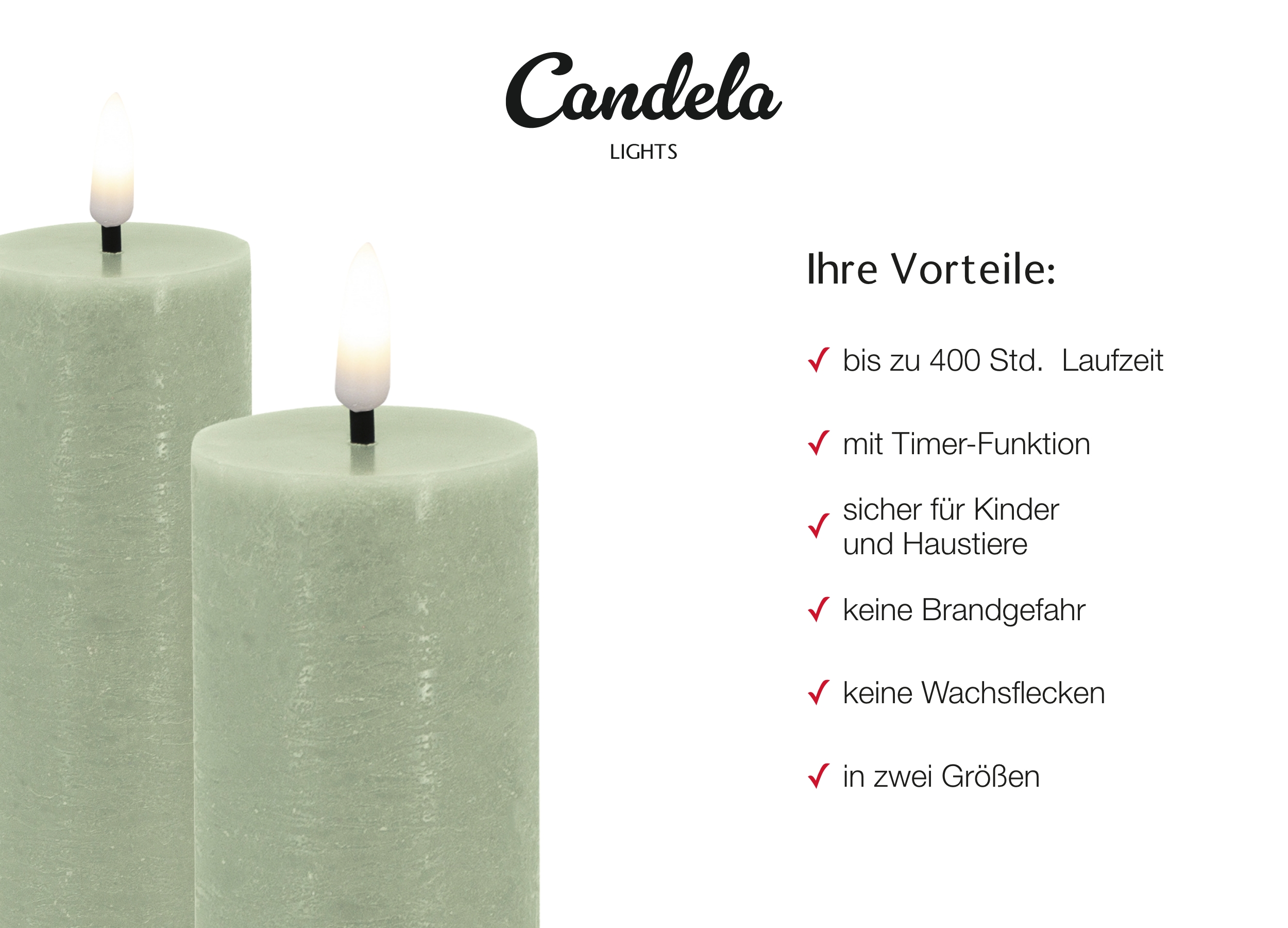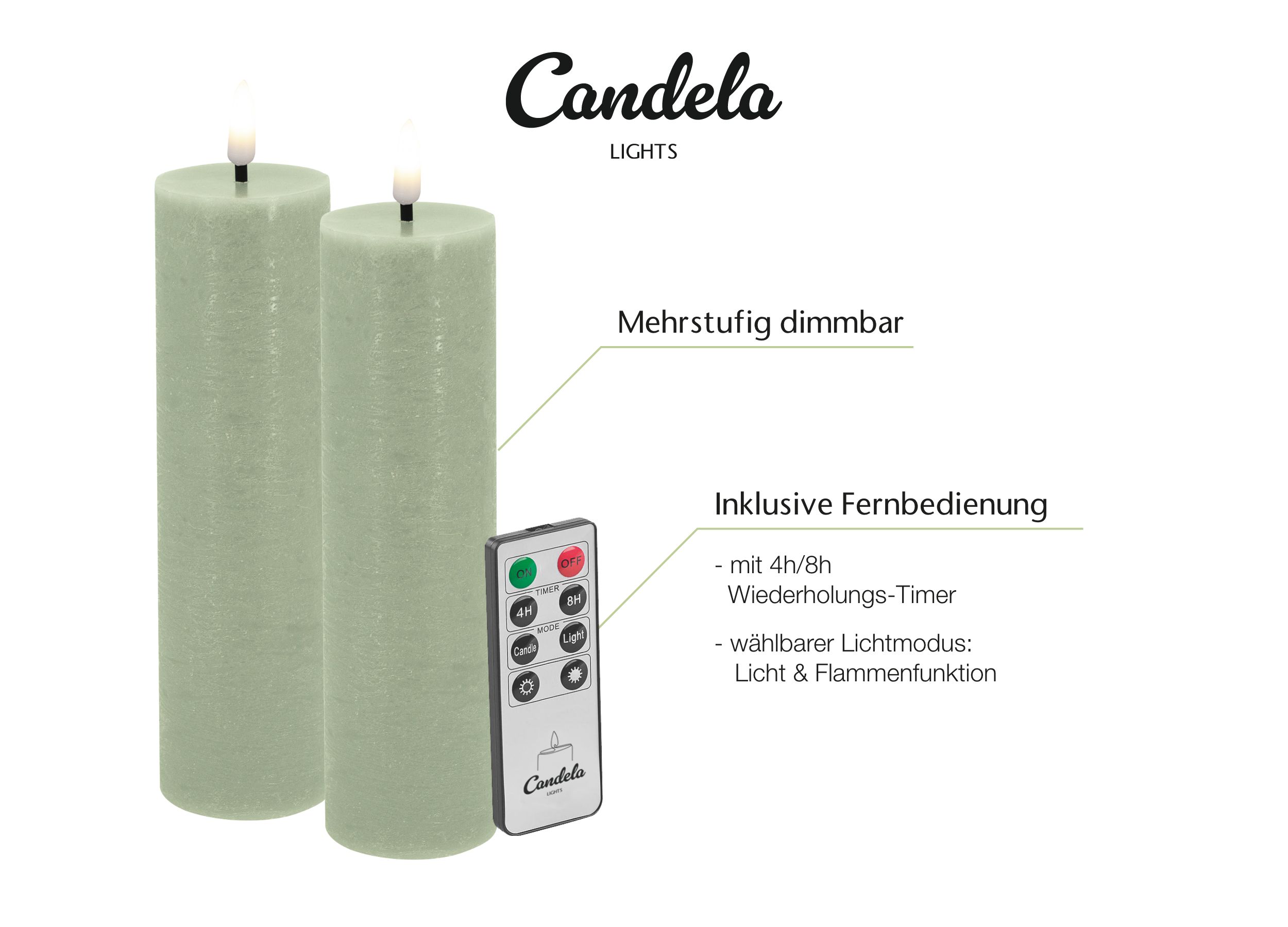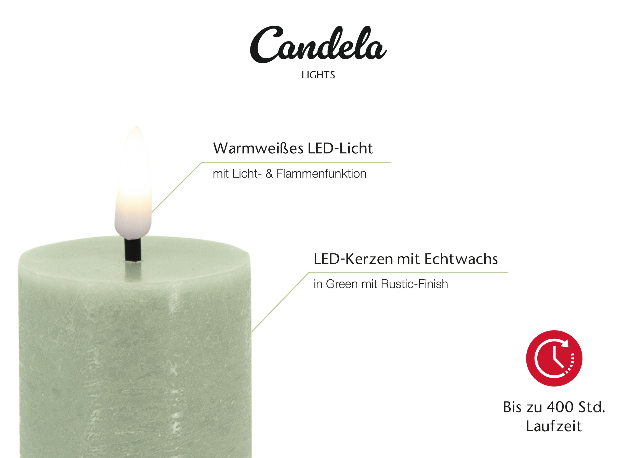 Candela LED Kerzen 4er Set H:17,5xØ5cm Green rustic Echtwachs mit Fernbedienung Timer Funktion & mehrstufig dimmbar flammenlos Echtwachskerzen Stumpenkerze