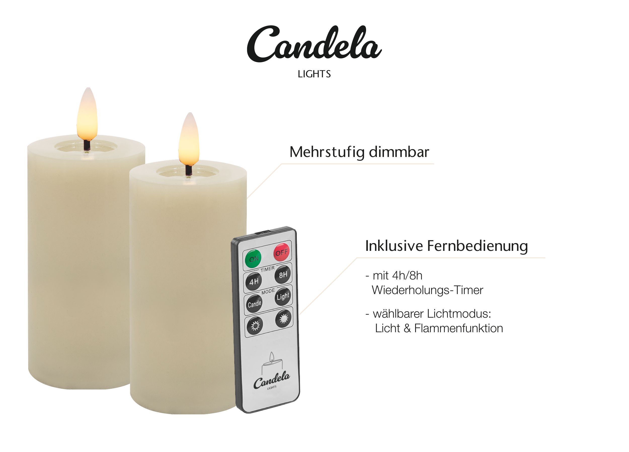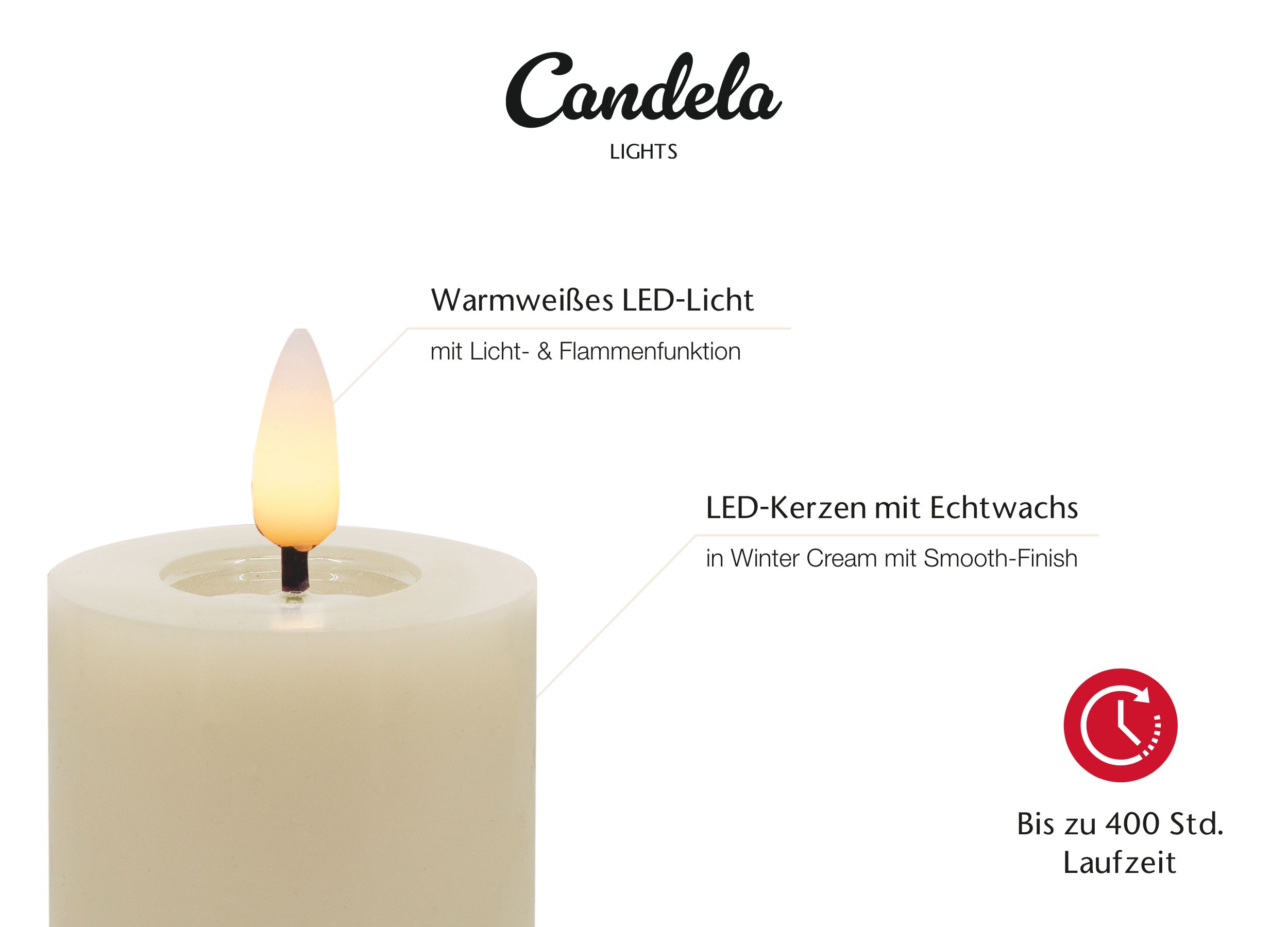 Candela LED Kerzen 4er Set H:10xØ5cm Winter creme glatt Echtwachs mit Fernbedienung Timer Funktion & mehrstufig dimmbar flammenlos Echtwachskerzen Stumpenkerze