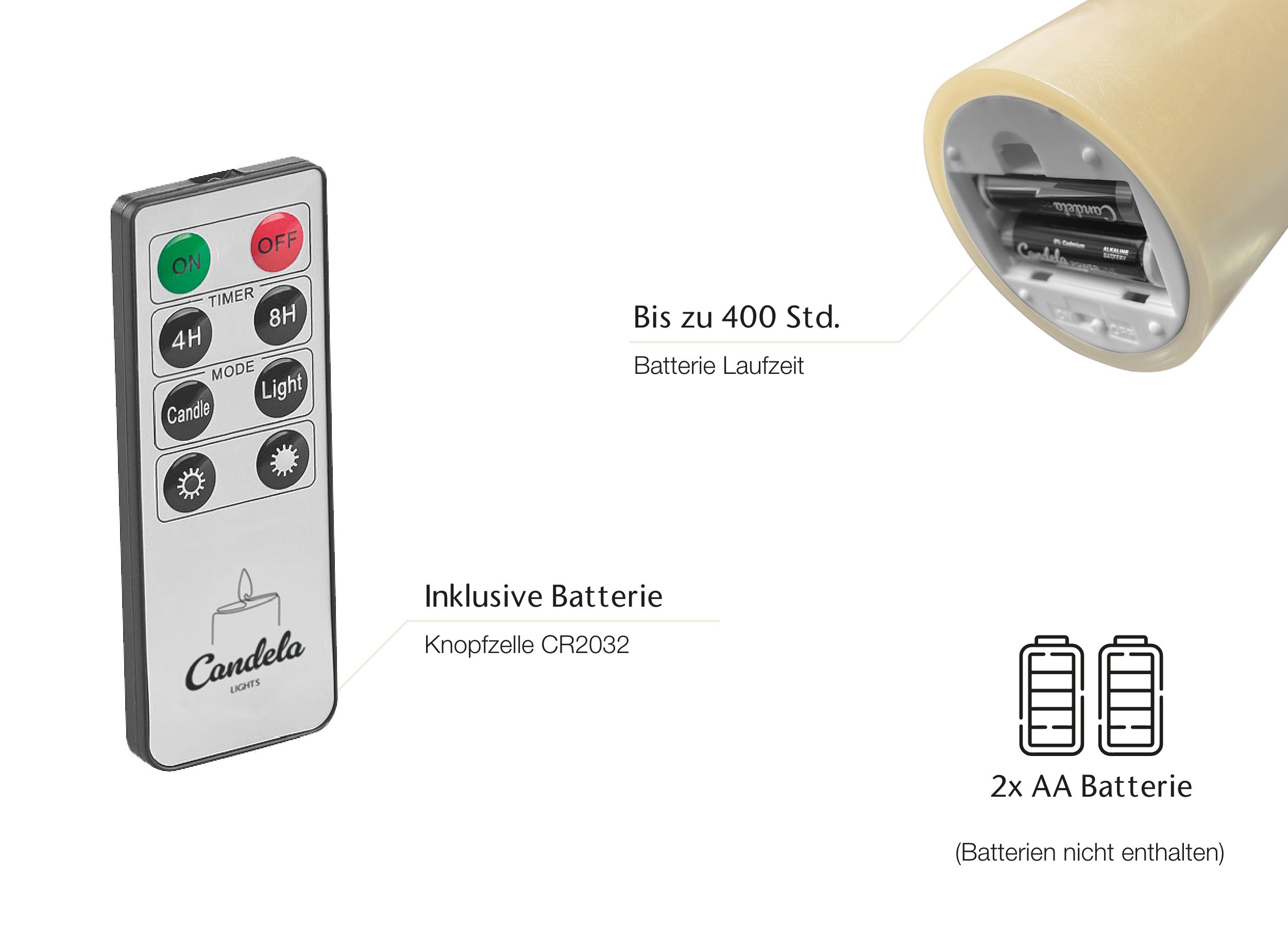 Sie benötigen für den Betrieb pro Kerze 2xAA Batterien. Bitte beachten Sie unsere Batterie-, Entsorgungs- sowie Elektrohinweise für die Produkte von LC Home.