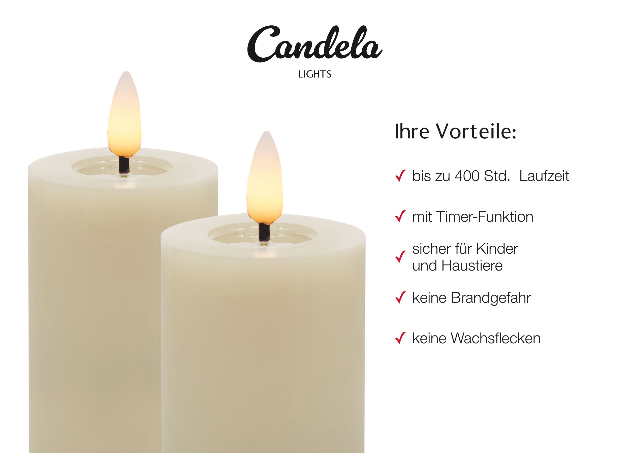 Candela Lights by LC Home sind hochwertige und handgefertigte Echtwachs LED Kerzen, die vor allem durch Ihre Qualität und Funktionalität zu beeindrucken wissen. Diese Echtwachskerzen mit LED Licht sind eine innovative und sichere Alternative zu herkömmlichen Wachskerzen und wirken so realistisch, dass die praktisch nicht von normal brennenden Kerzen zu unterscheiden sind.
