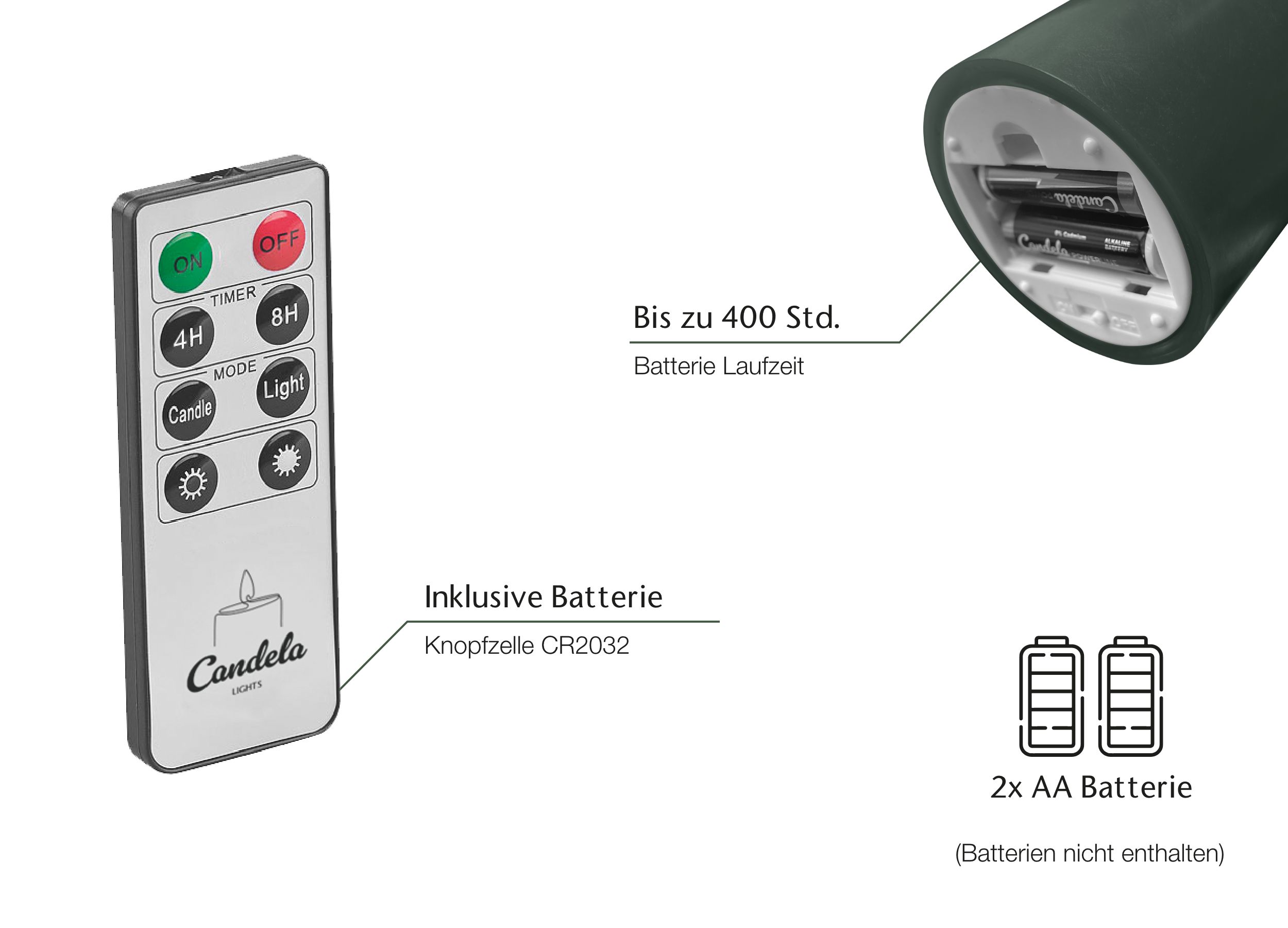 Sie benötigen für den Betrieb pro Kerze 2xAA Batterien. Bitte beachten Sie unsere Batterie-, Entsorgungs- sowie Elektrohinweise für die Produkte von LC Home.