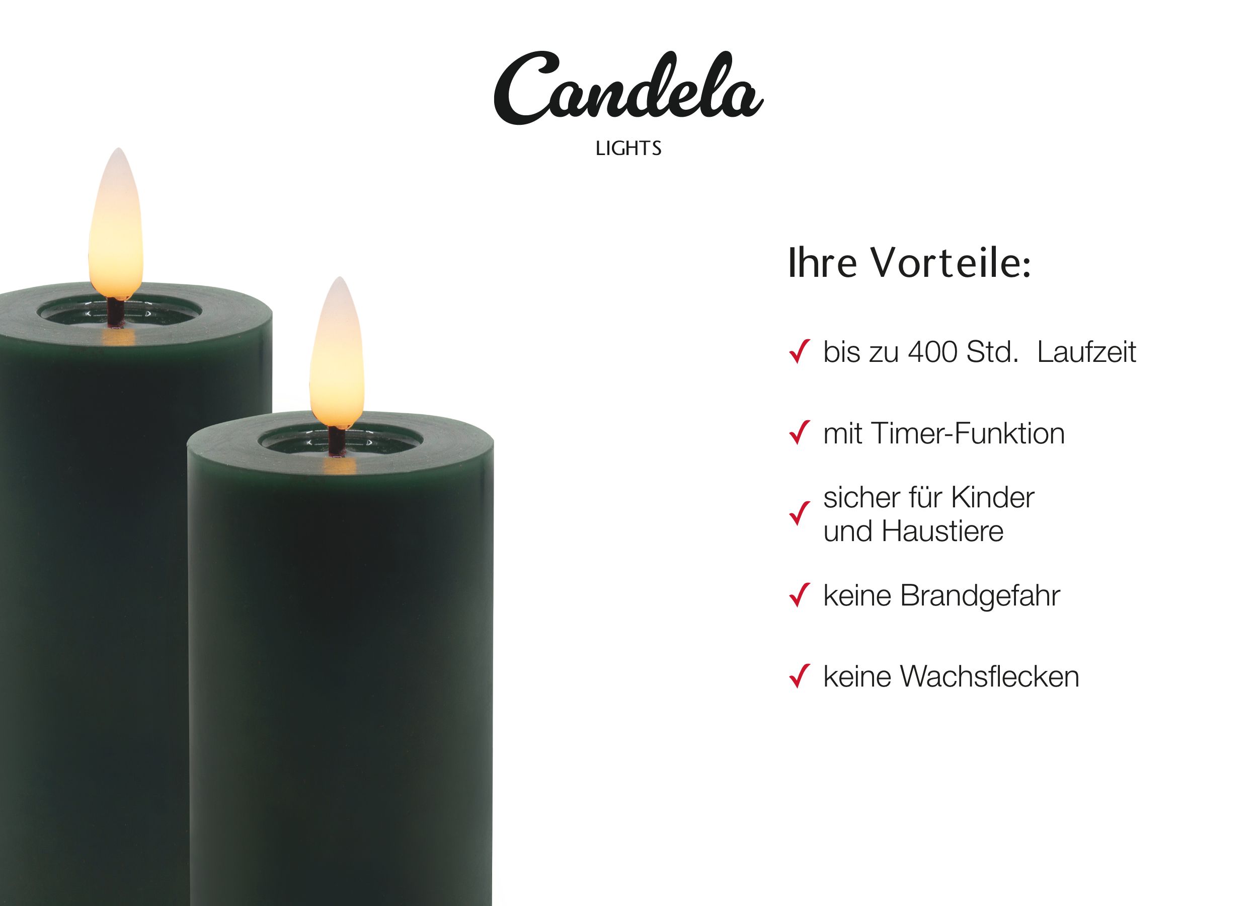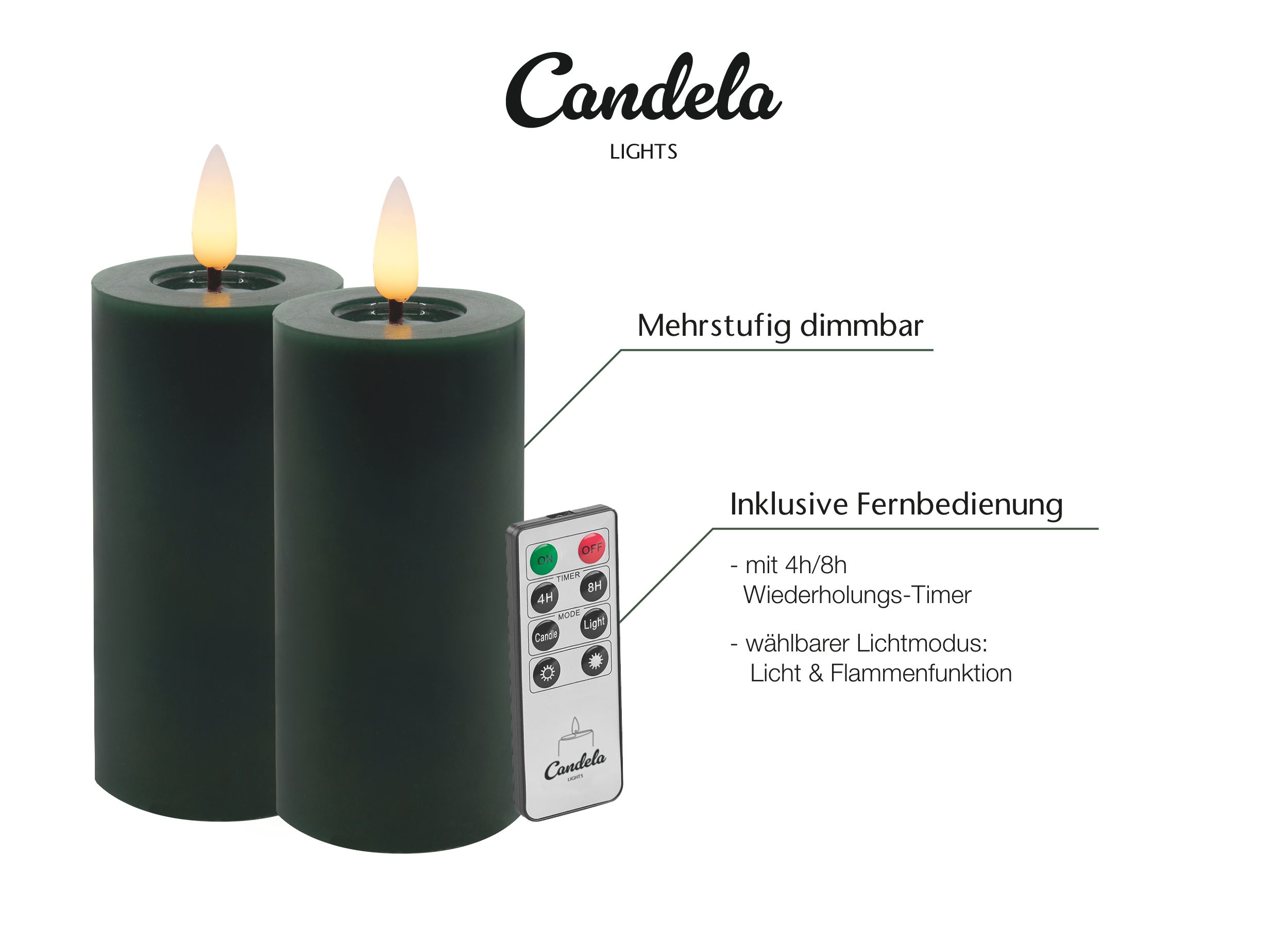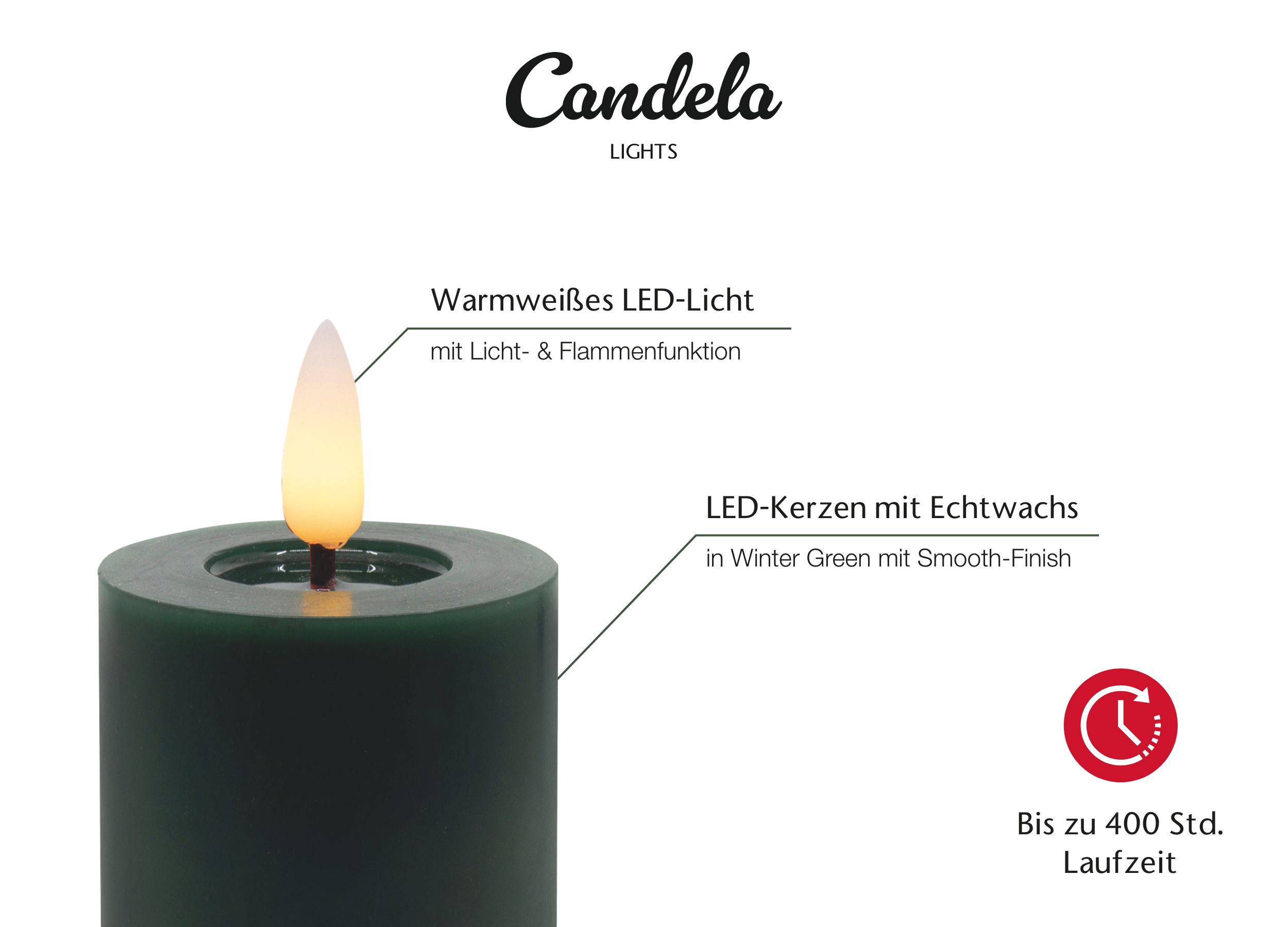 Candela LED Kerzen 4er Set H:10xØ5cm Winter grün glatt Echtwachs mit Fernbedienung Timer Funktion & mehrstufig dimmbar flammenlos Echtwachskerzen Stumpenkerze