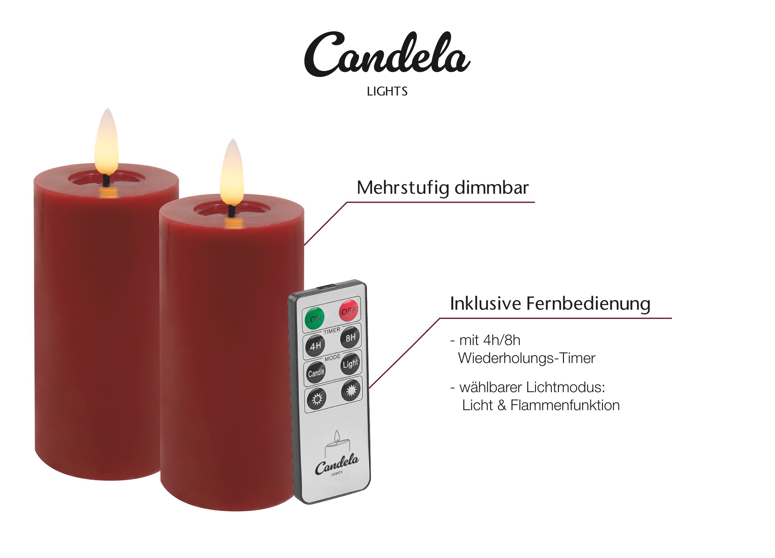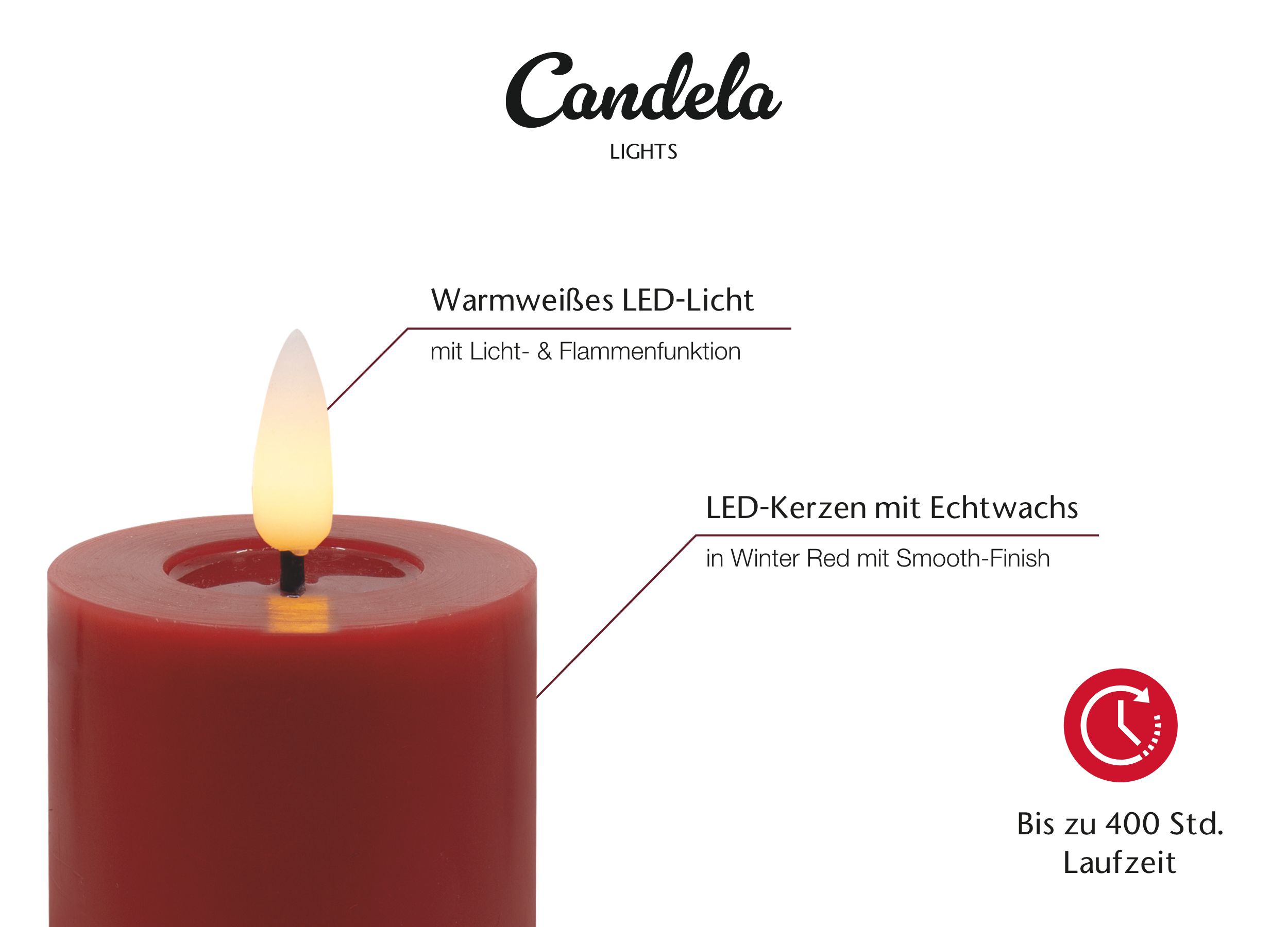 Candela LED Kerzen 4er Set H:10xØ5cm Winter rot glatt Echtwachs mit Fernbedienung Timer Funktion & mehrstufig dimmbar flammenlos Echtwachskerzen Stumpenkerze