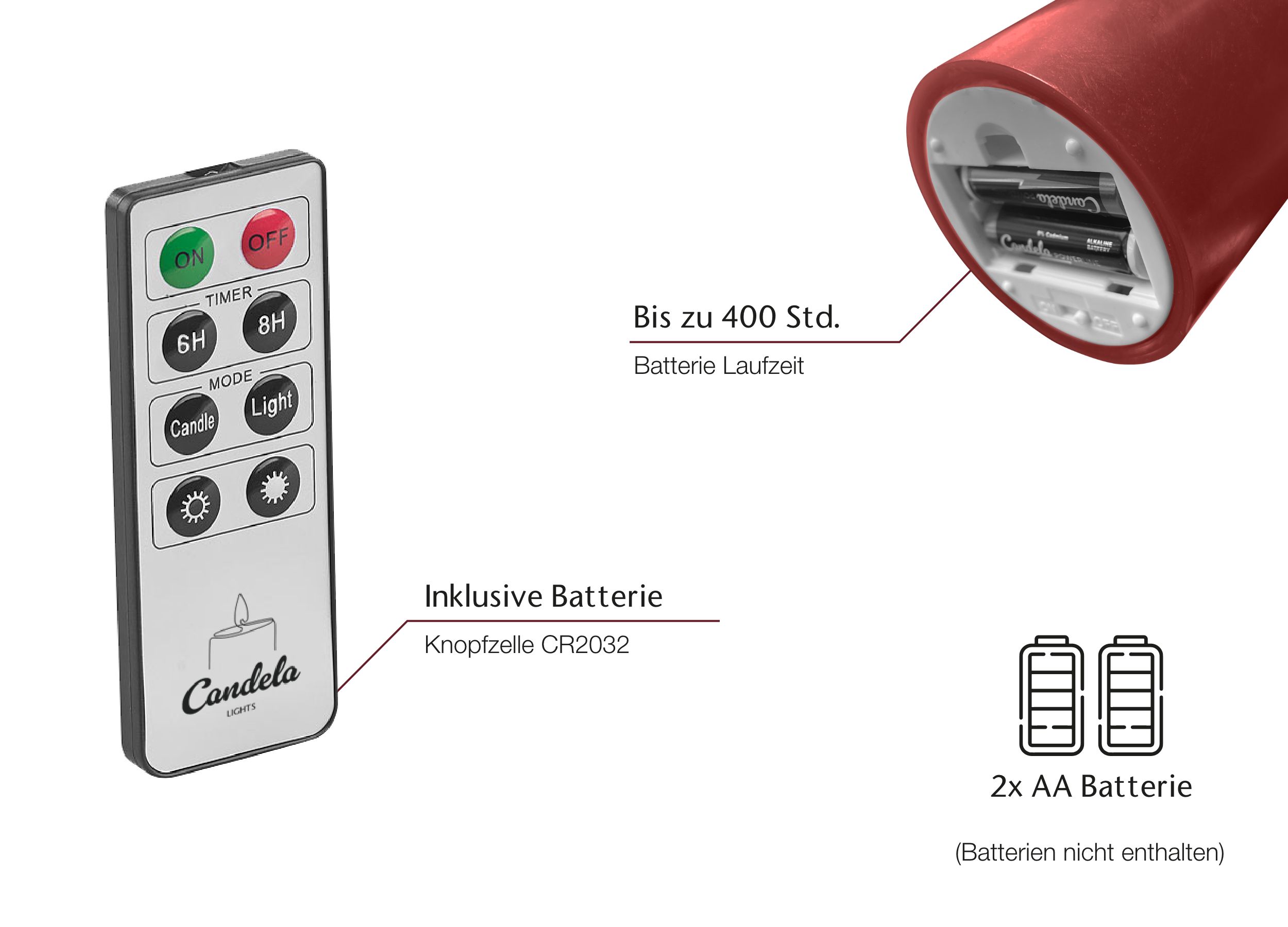 Sie benötigen für den Betrieb pro Kerze 2xAA Batterien. Bitte beachten Sie unsere Batterie-, Entsorgungs- sowie Elektrohinweise für die Produkte von LC Home.