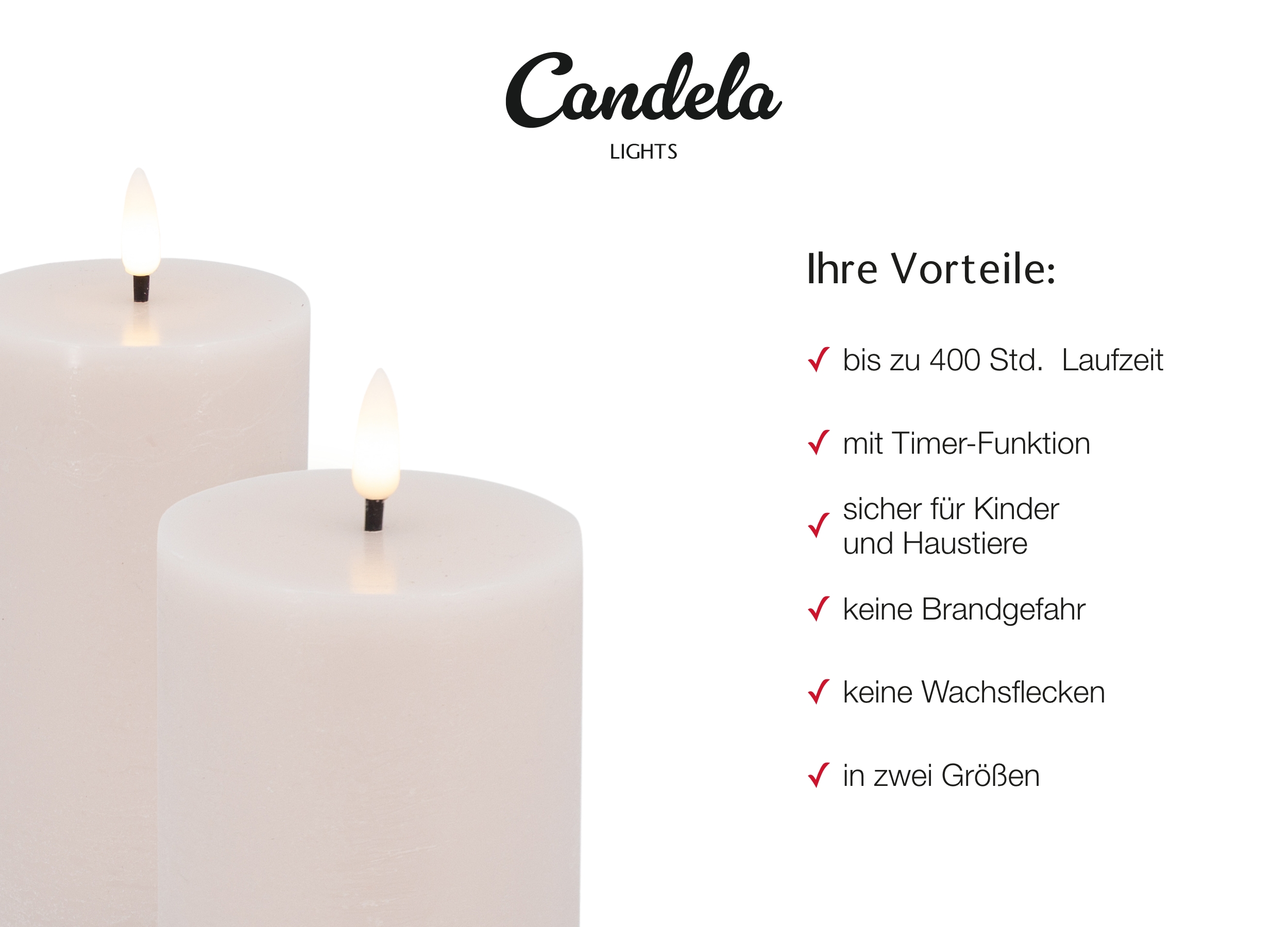 Candela Lights by LC Home sind hochwertige und handgefertigte Echtwachs LED Kerzen, die vor allem durch Ihre Qualität und Funktionalität zu beeindrucken wissen. Diese Echtwachskerzen mit LED Licht sind eine innovative und sichere Alternative zu herkömmlichen Wachskerzen und wirken so realistisch, dass die praktisch nicht von normal brennenden Kerzen zu unterscheiden sind.