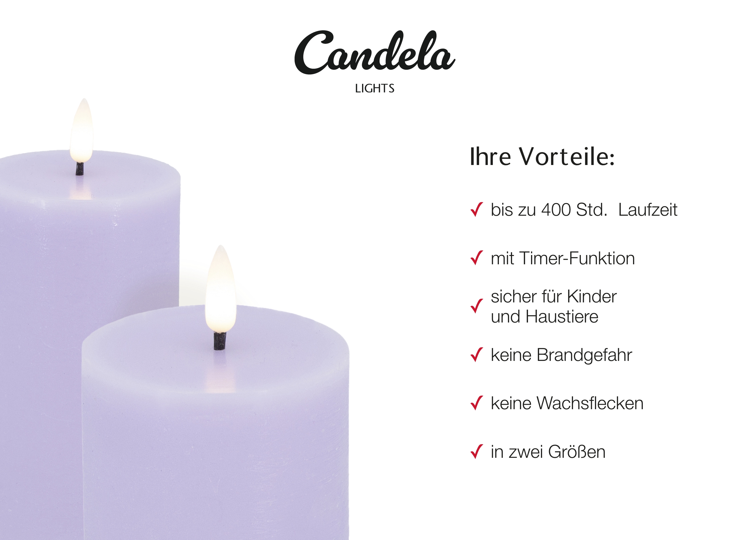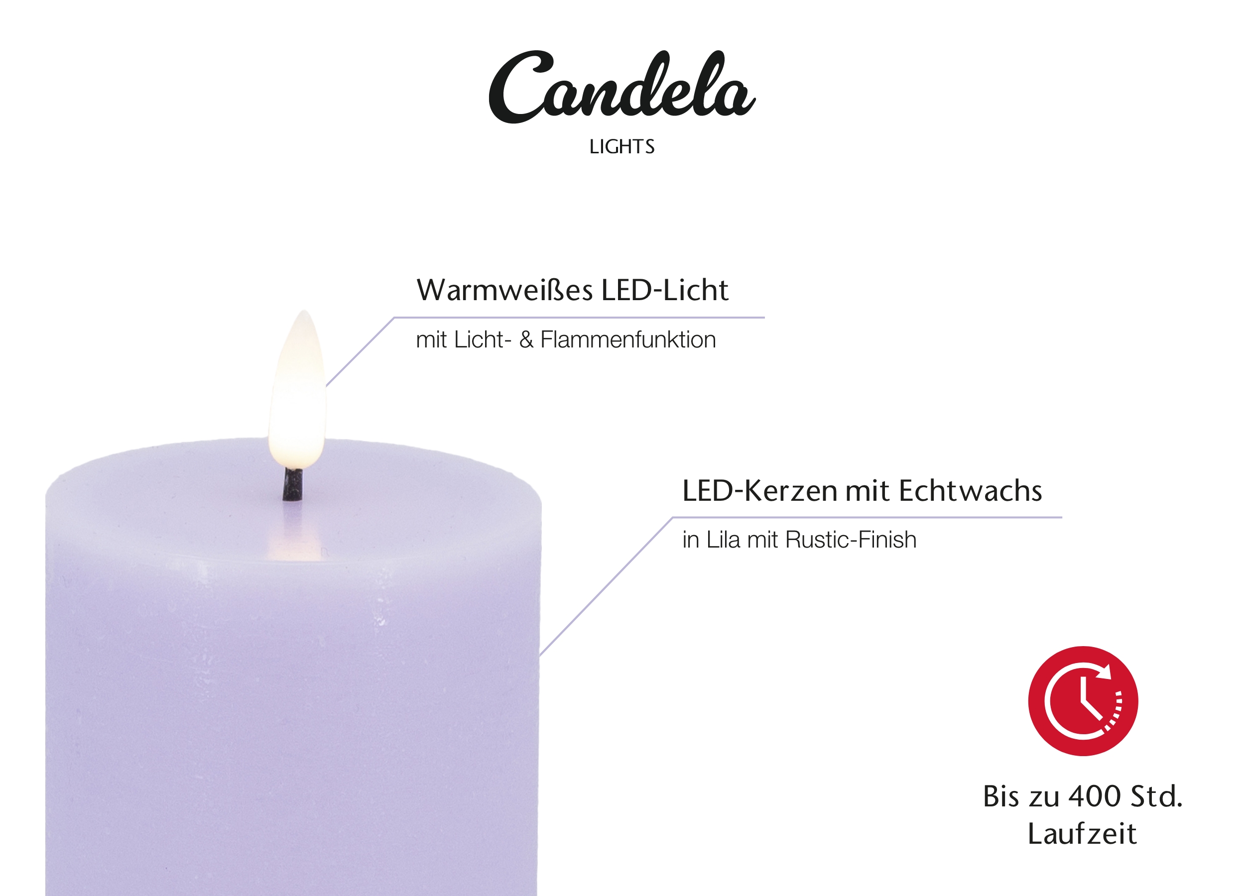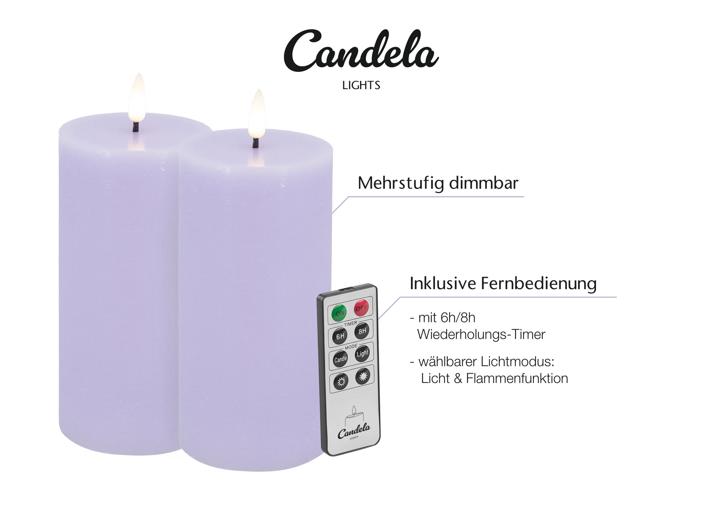 Candela LED Kerzen 4er Set H:15xØ7,5cm Summer Purple rustic Echtwachs mit Fernbedienung Timer Funktion & mehrstufig dimmbar flammenlos Echtwachskerzen Stumpenkerze