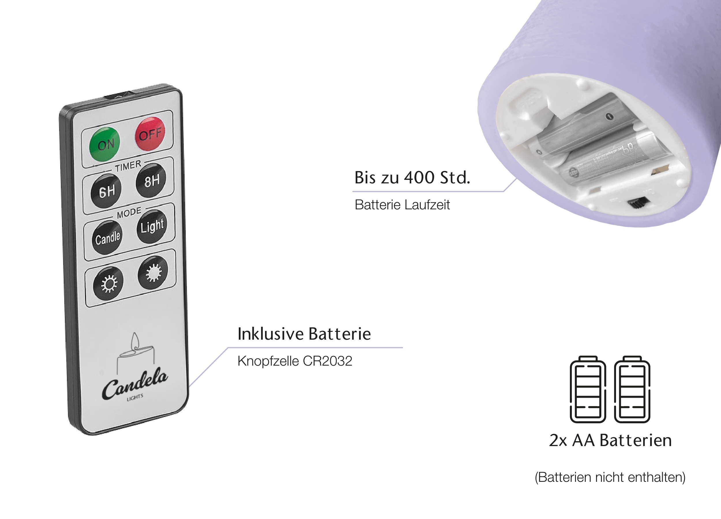 Sie benötigen für den Betrieb pro Kerze 2xAA Batterien. Bitte beachten Sie unsere Batterie-, Entsorgungs- sowie Elektrohinweise für die Produkte von LC Home.