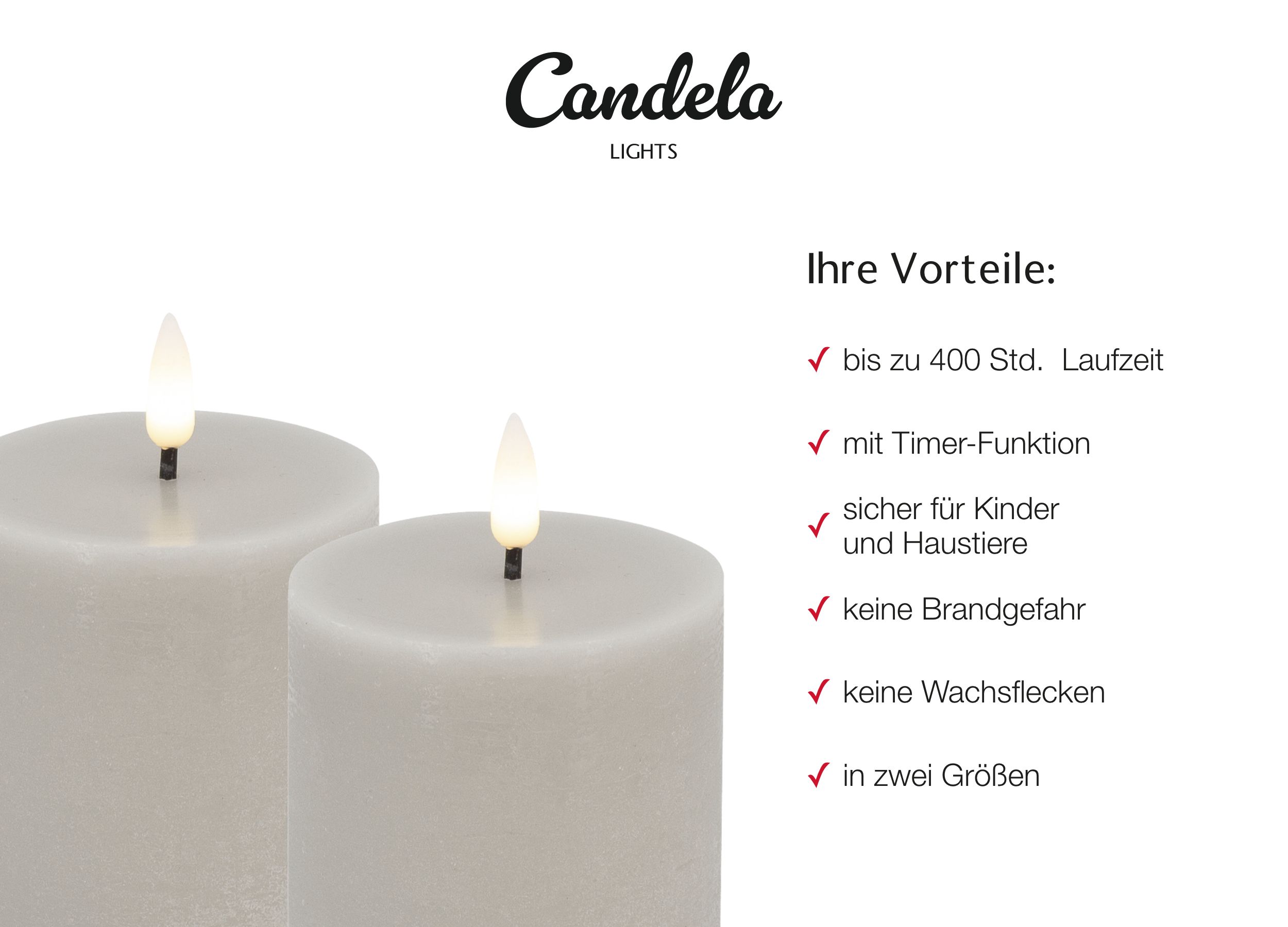 Candela Lights by LC Home sind hochwertige und handgefertigte Echtwachs LED Kerzen, die vor allem durch Ihre Qualität und Funktionalität zu beeindrucken wissen. Diese Echtwachskerzen mit LED Licht sind eine innovative und sichere Alternative zu herkömmlichen Wachskerzen und wirken so realistisch, dass die praktisch nicht von normal brennenden Kerzen zu unterscheiden sind.