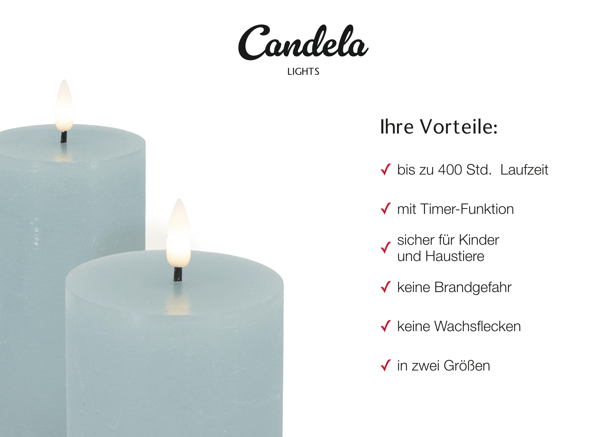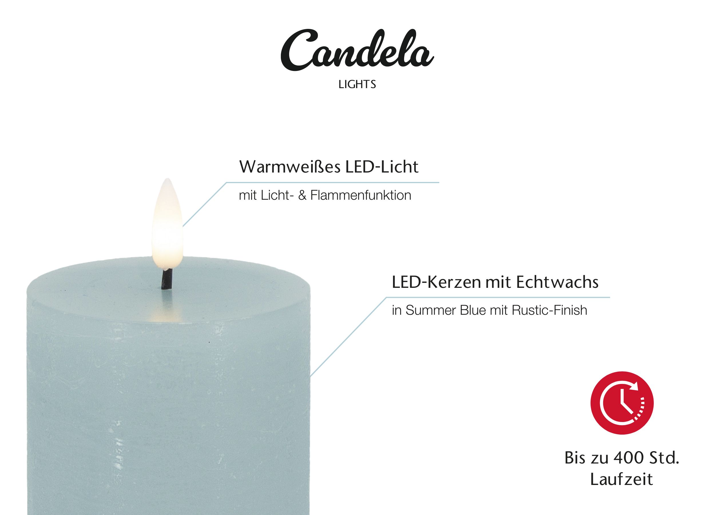 Candela LED Kerzen 4er Set H:15xØ7,5cm Summer Blue rustic Echtwachs mit Fernbedienung Timer Funktion & mehrstufig dimmbar flammenlos Echtwachskerzen Stumpenkerze
