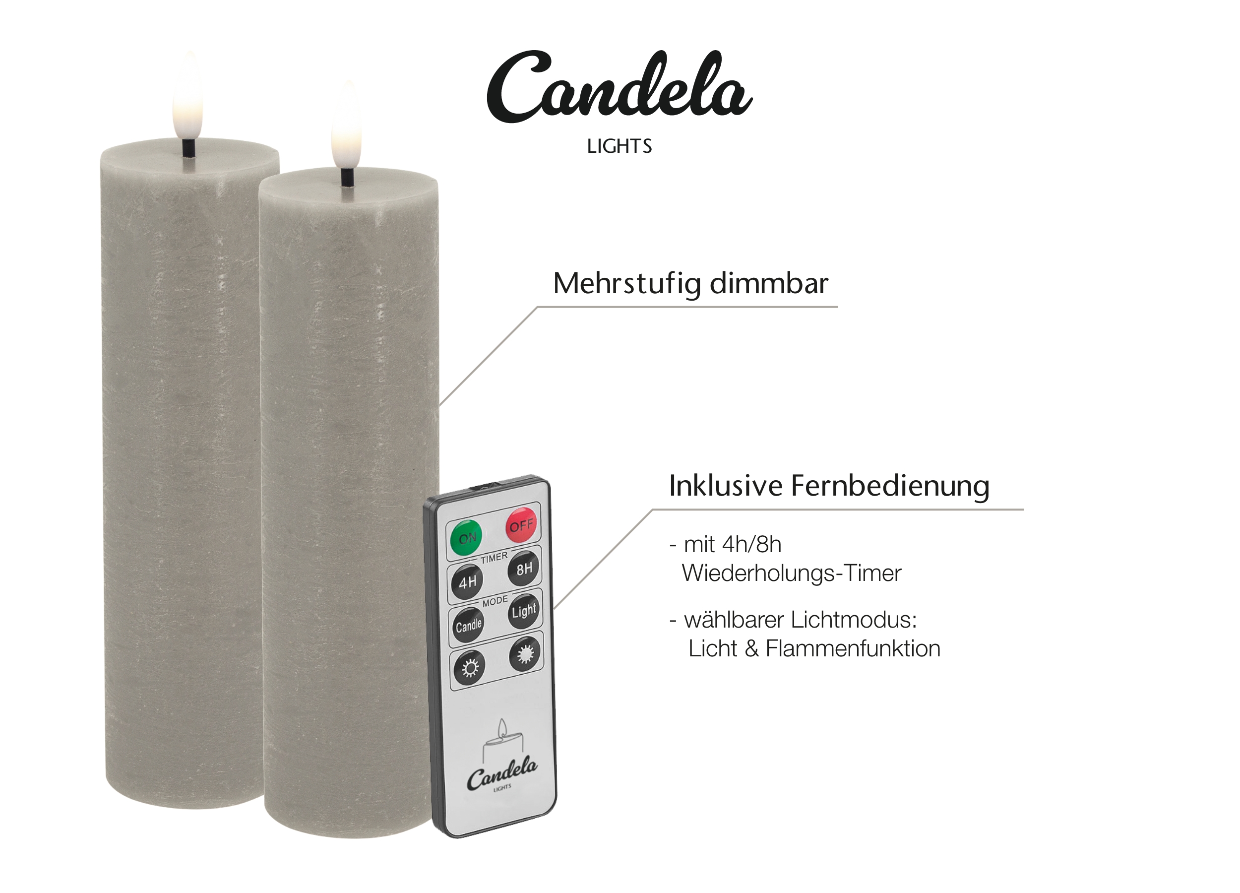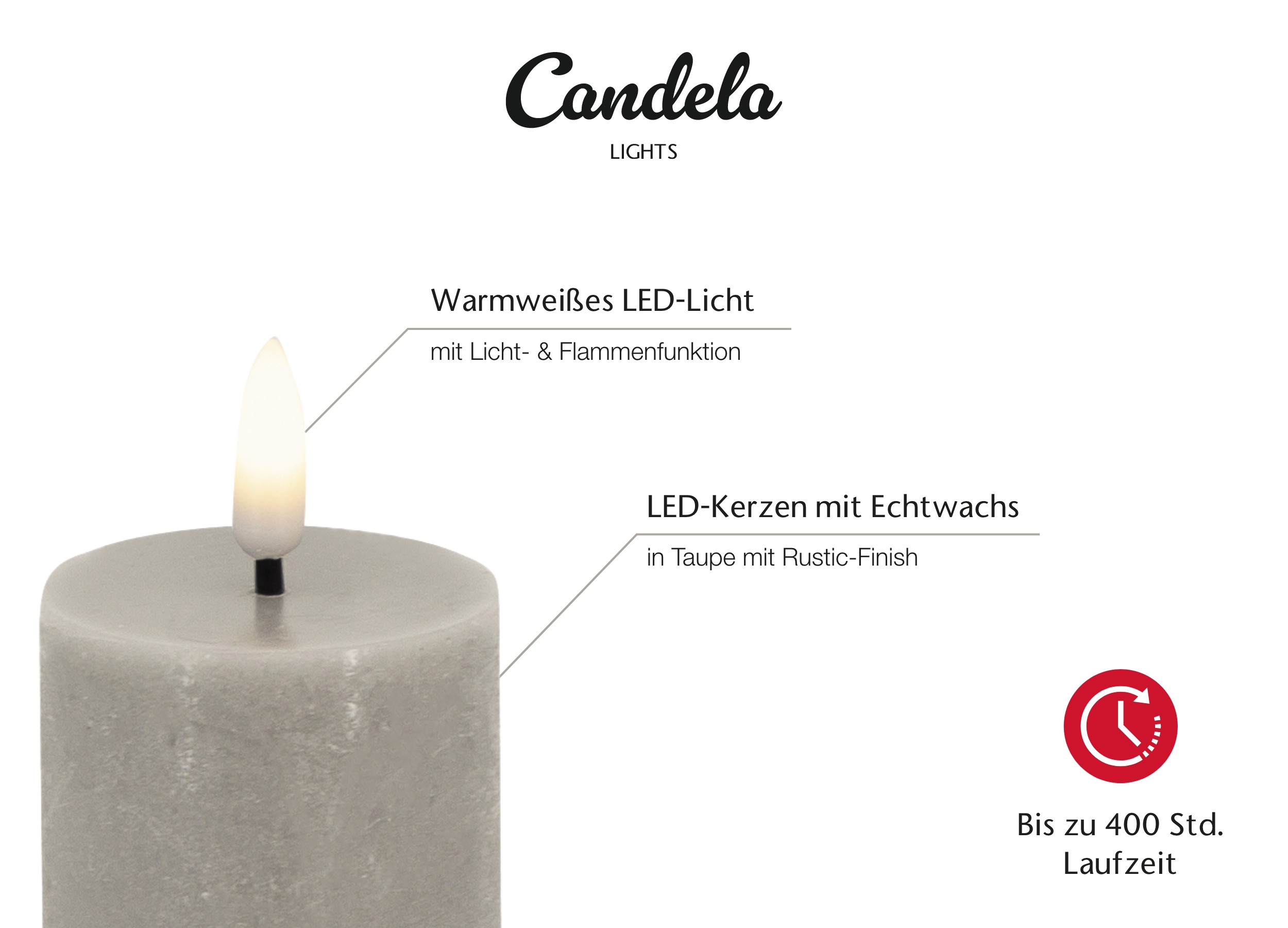 Candela LED Kerzen 4er Set H:17,5xØ5cm taupe rustic Echtwachs mit Fernbedienung Timer Funktion & mehrstufig dimmbar flammenlos Echtwachskerzen Stumpenkerze