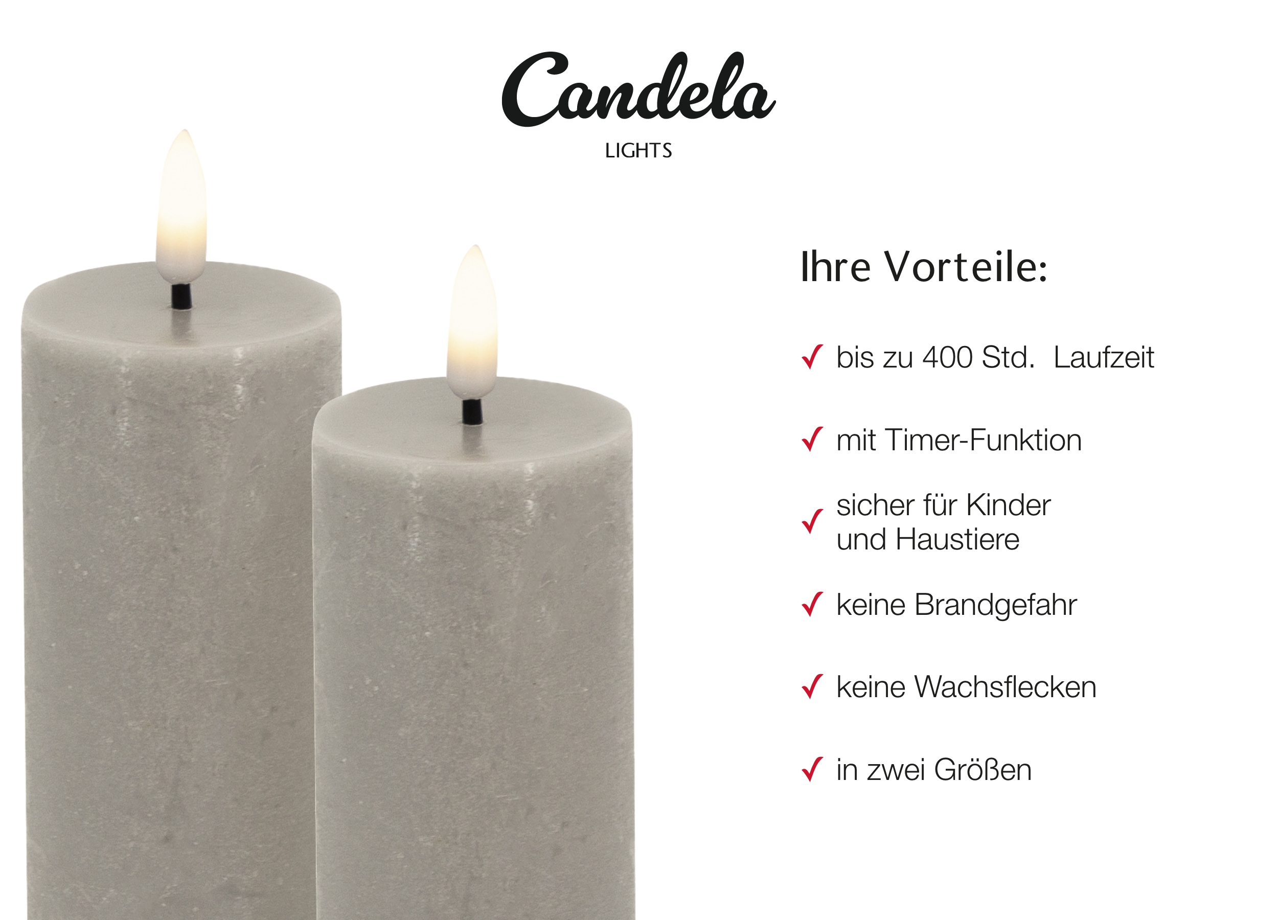 Candela Lights by LC Home sind hochwertige und handgefertigte Echtwachs LED Kerzen, die vor allem durch Ihre Qualität und Funktionalität zu beeindrucken wissen. Diese Echtwachskerzen mit LED Licht sind eine innovative und sichere Alternative zu herkömmlichen Wachskerzen und wirken so realistisch, dass die praktisch nicht von normal brennenden Kerzen zu unterscheiden sind.