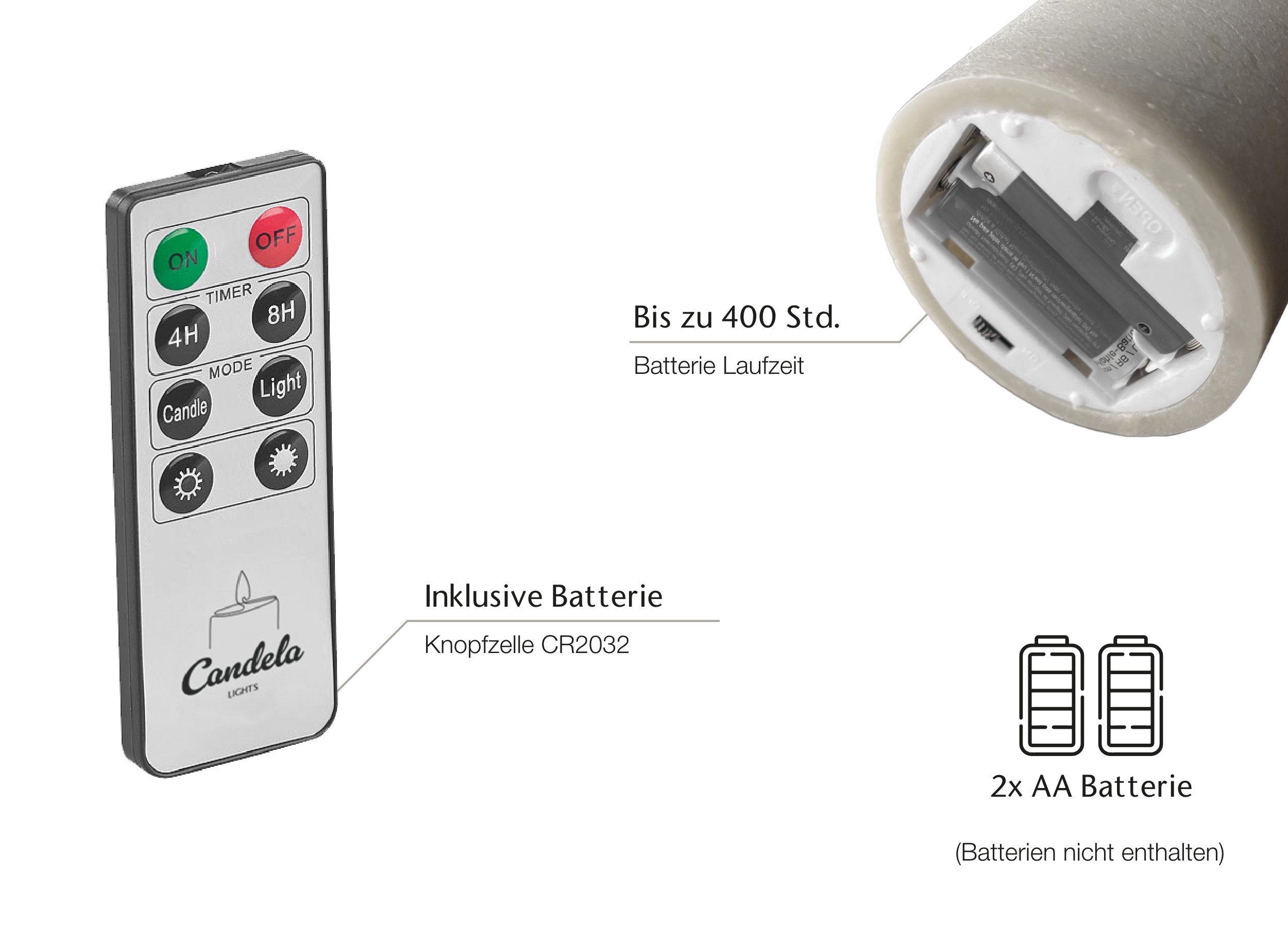 Sie benötigen für den Betrieb pro Kerze 2xAA Batterien. Bitte beachten Sie unsere Batterie-, Entsorgungs- sowie Elektrohinweise für die Produkte von LC Home.