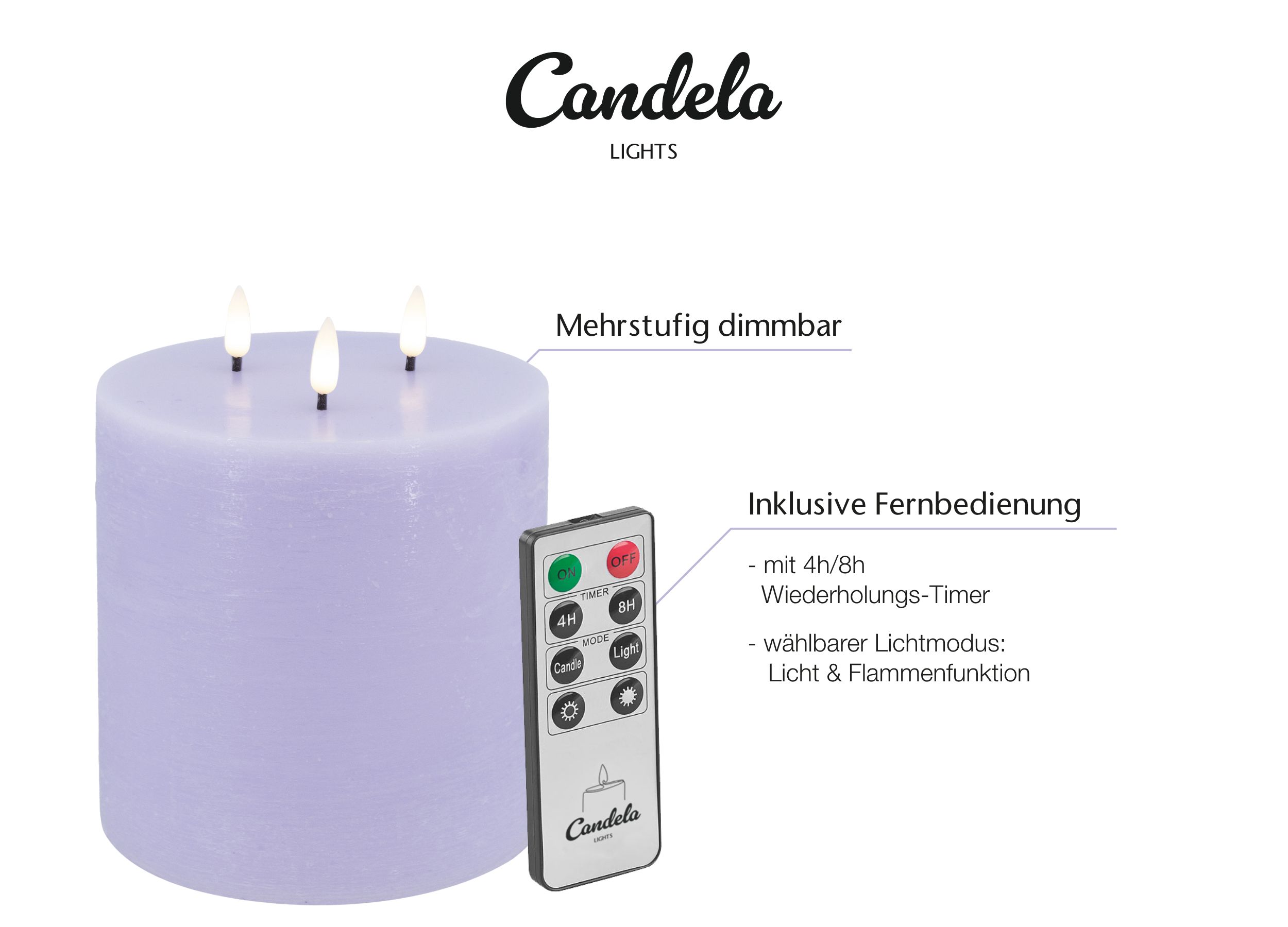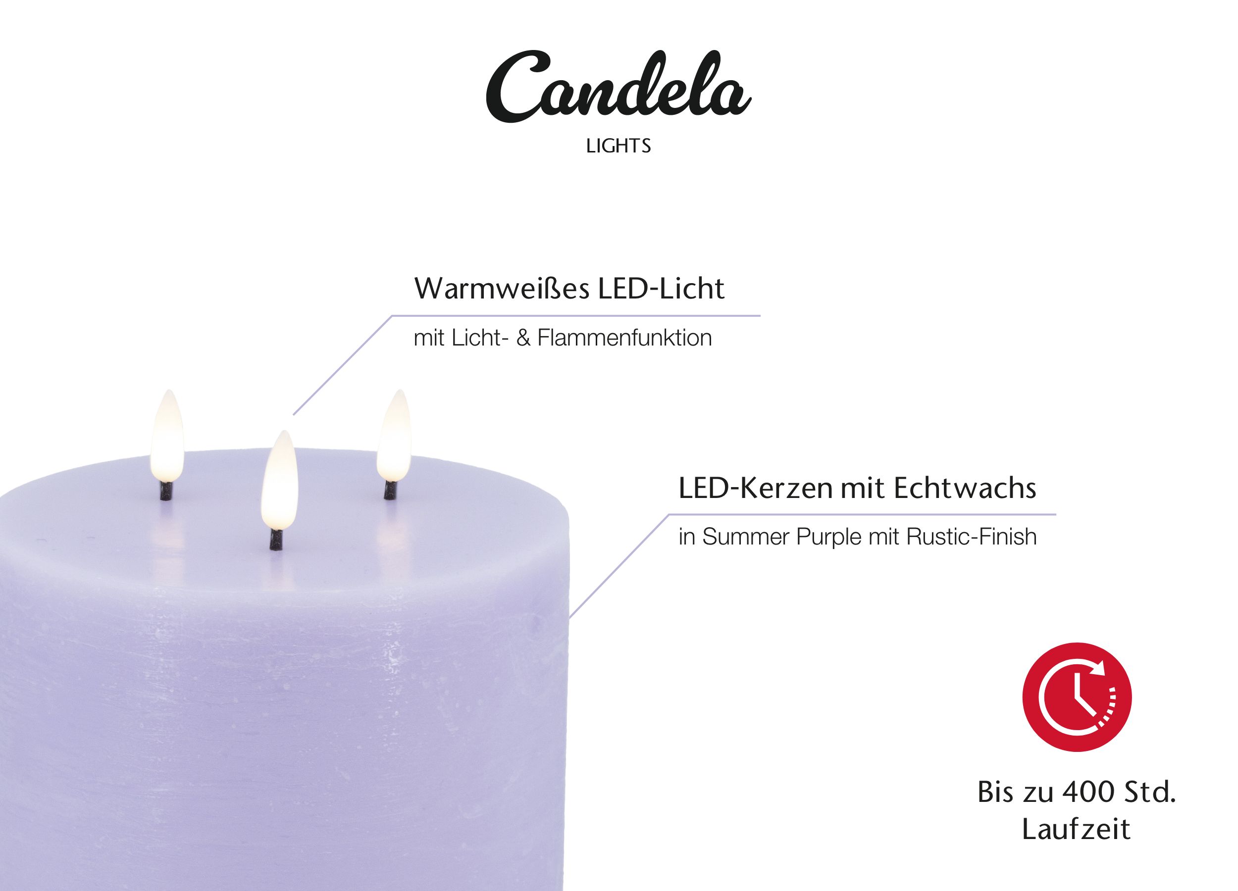 Candela Lights LED Kerze 3-Docht H:15xØ15cm lila rustic Stumpenkerze Echtwachs mit Fernbedienung & Timerfunktion Flammenlose flackernde LED-Kerze mehrstufig dimmbar
