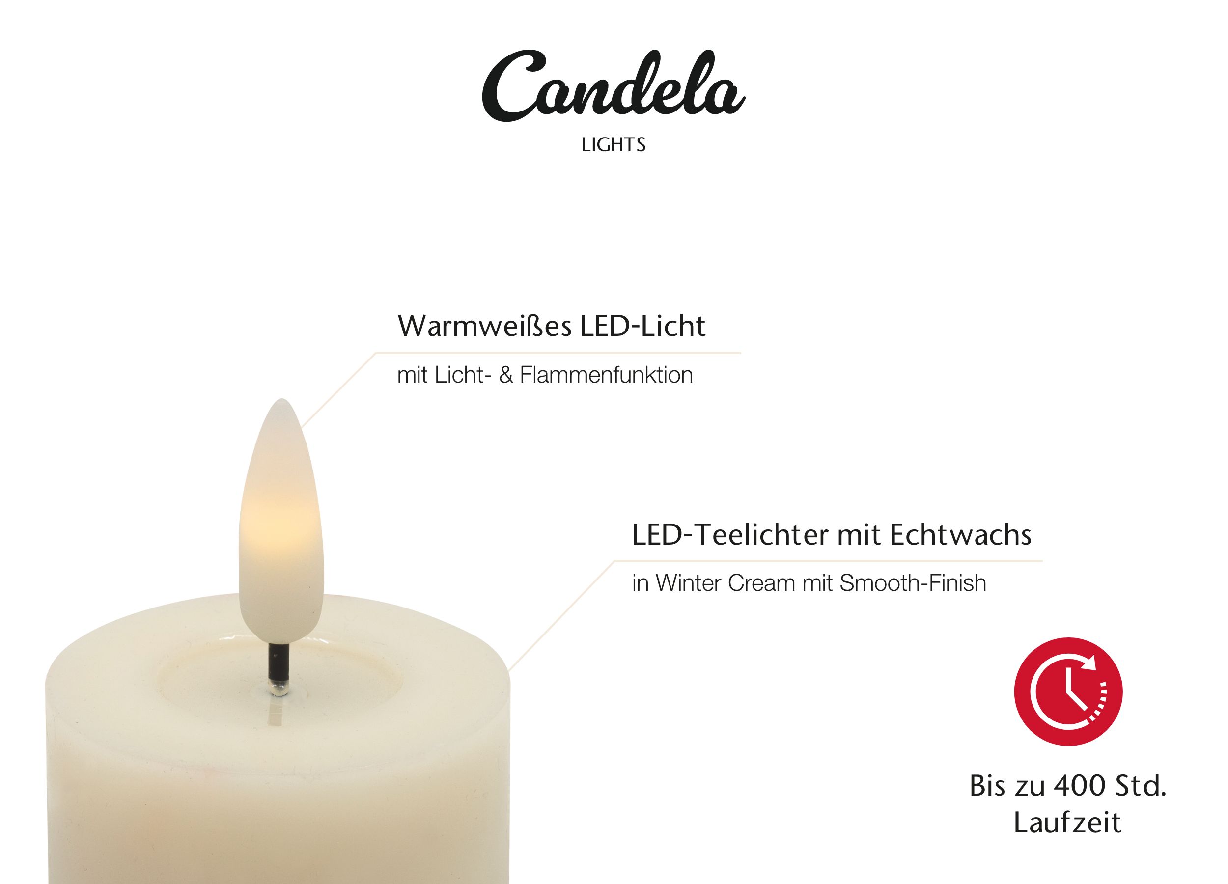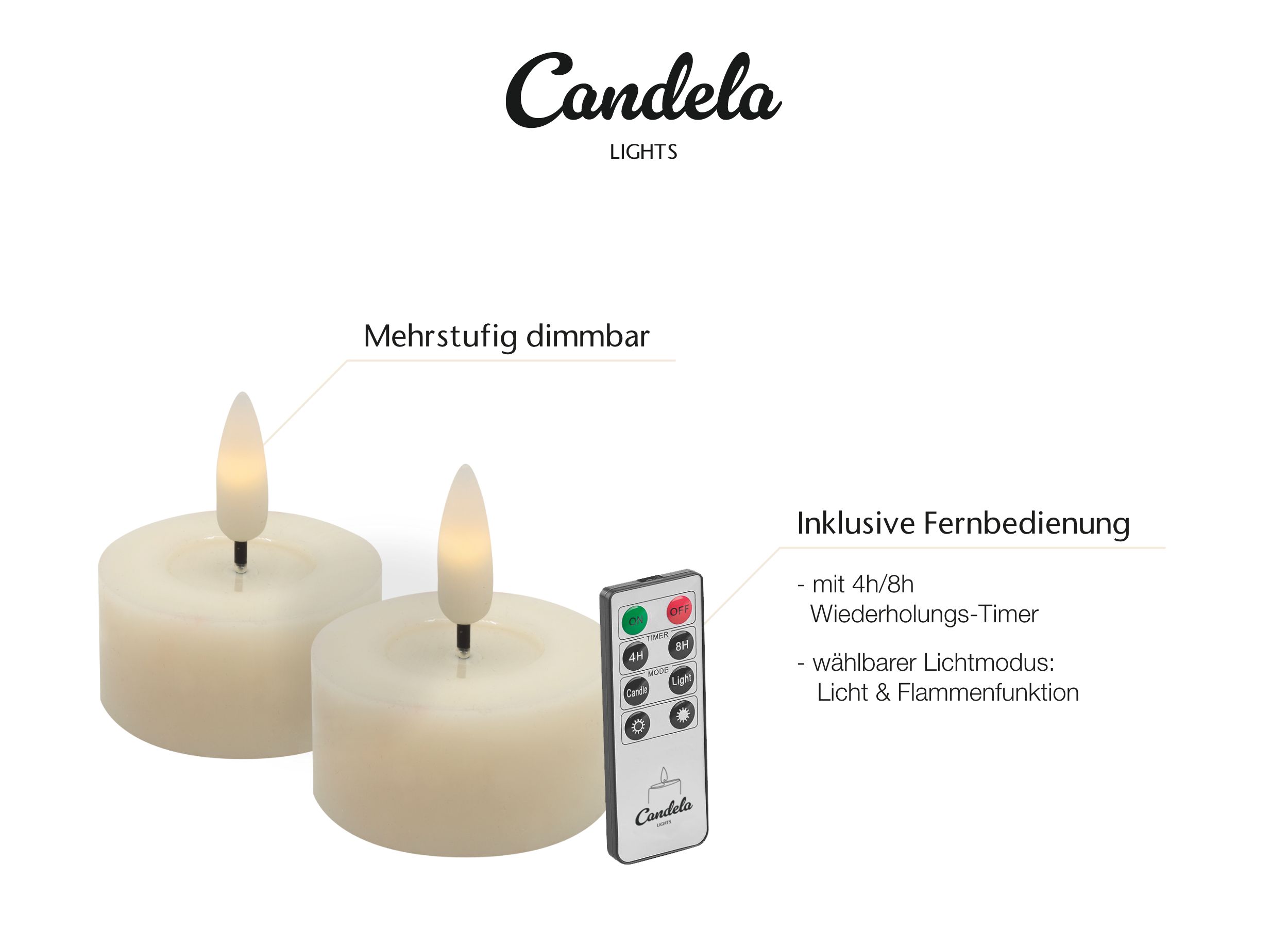 Candela Lights LED Kerzen 12er Set Ø4,5cm Winter creme glatt Echtwachs Teelicht mit Fernbedienung & Timerfunktion Flammenlose flackernde LED-Kerze mehrstufig dimmbar
