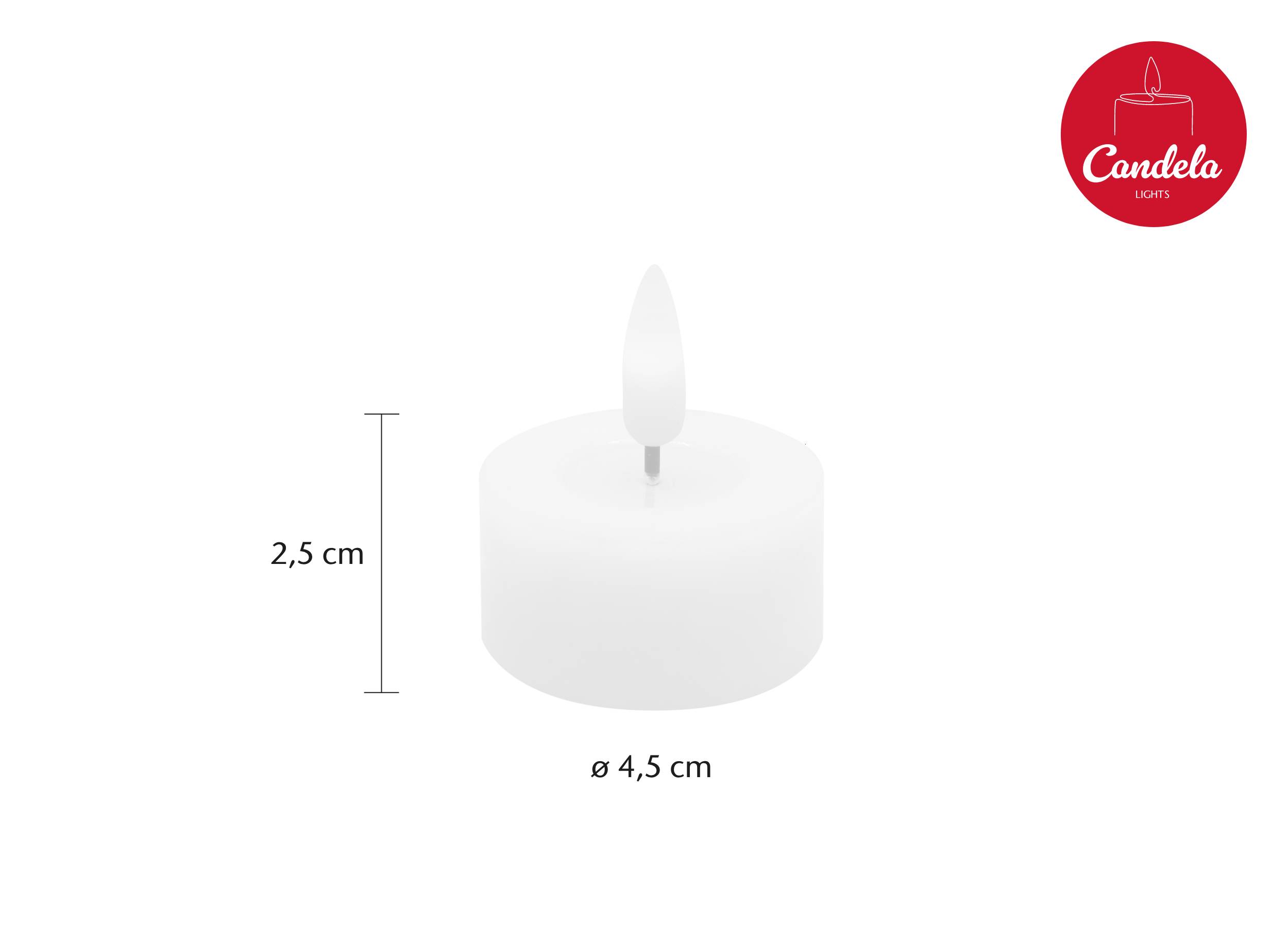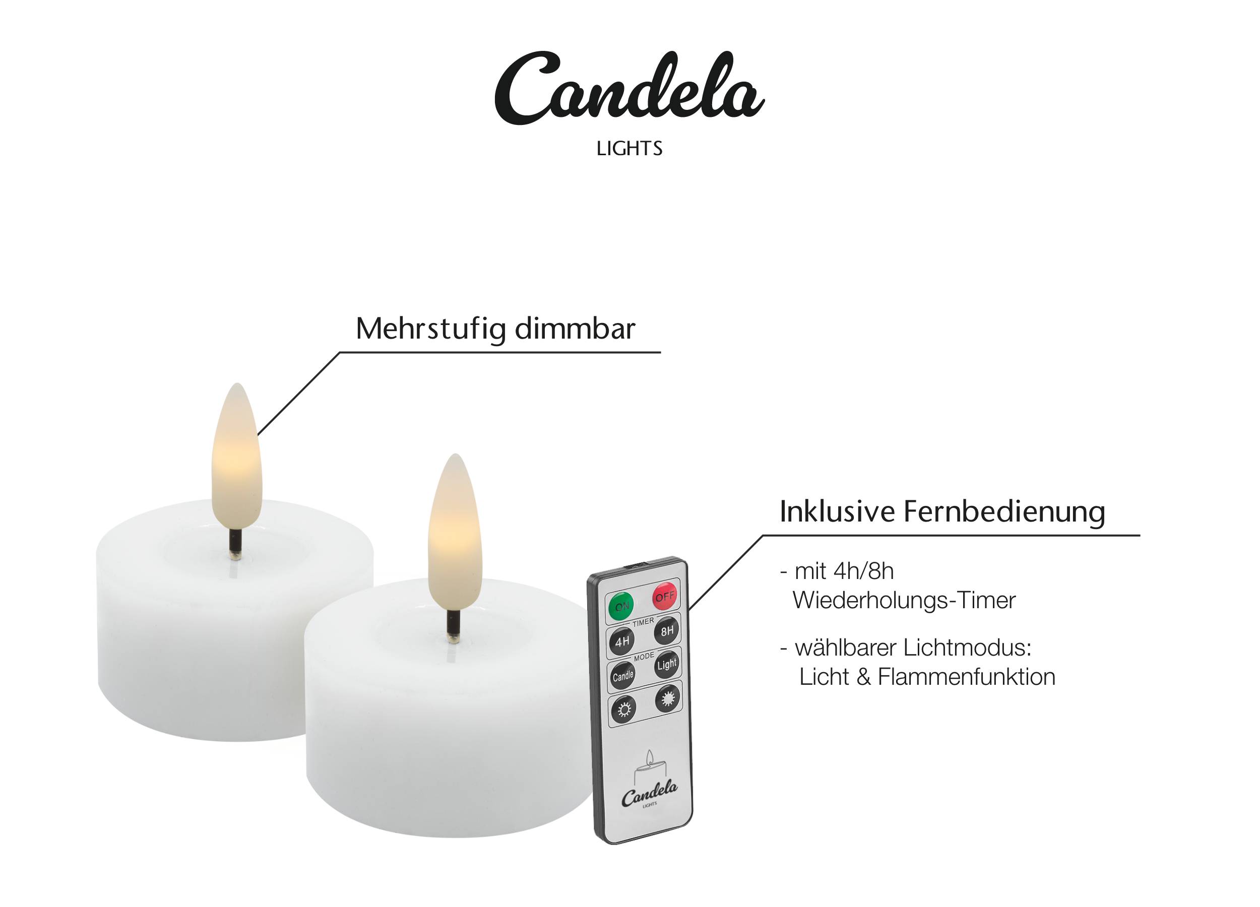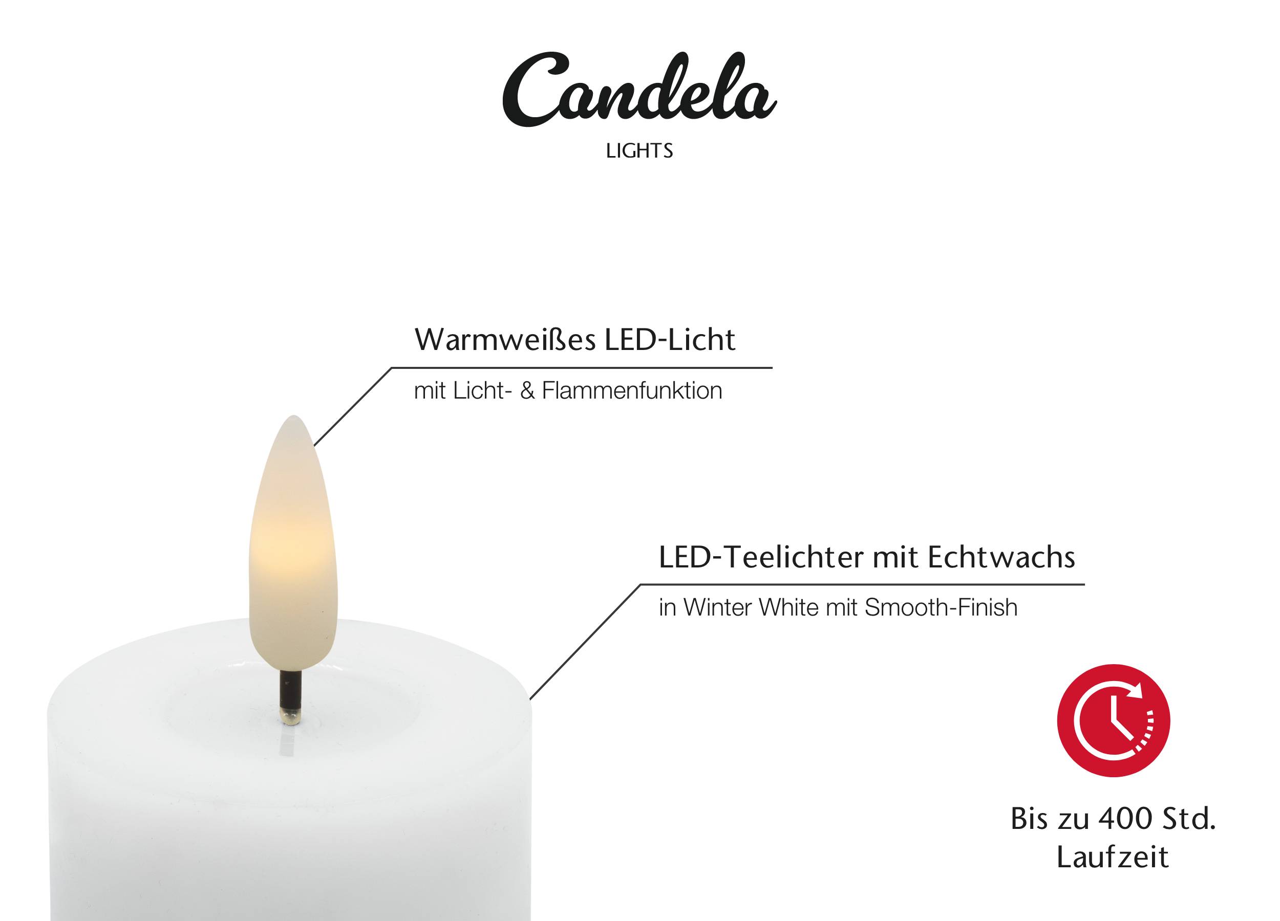 Candela Lights LED Kerzen 12er Set Ø4,5cm Winter weiß glatt Echtwachs Teelicht mit Fernbedienung & Timerfunktion Flammenlose flackernde LED-Kerze mehrstufig dimmbar