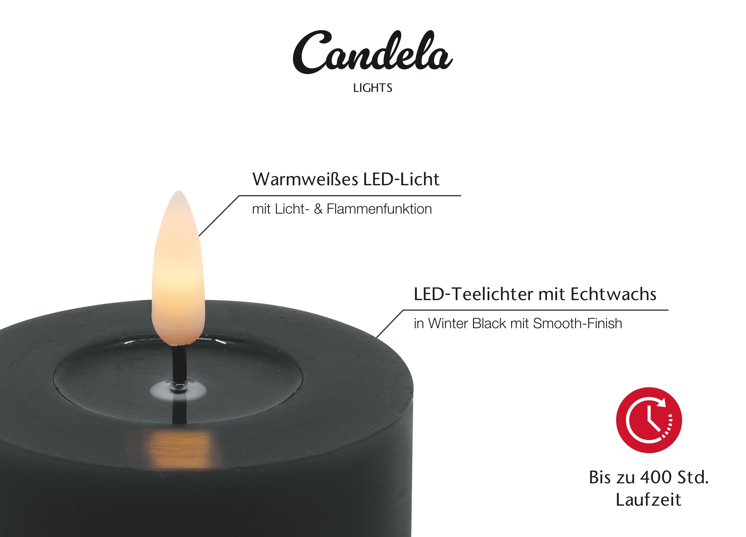 - LED-Technologie: energiesparende LED-Technologie, Flammeneffekt und feste Flamme (Dauerlicht)