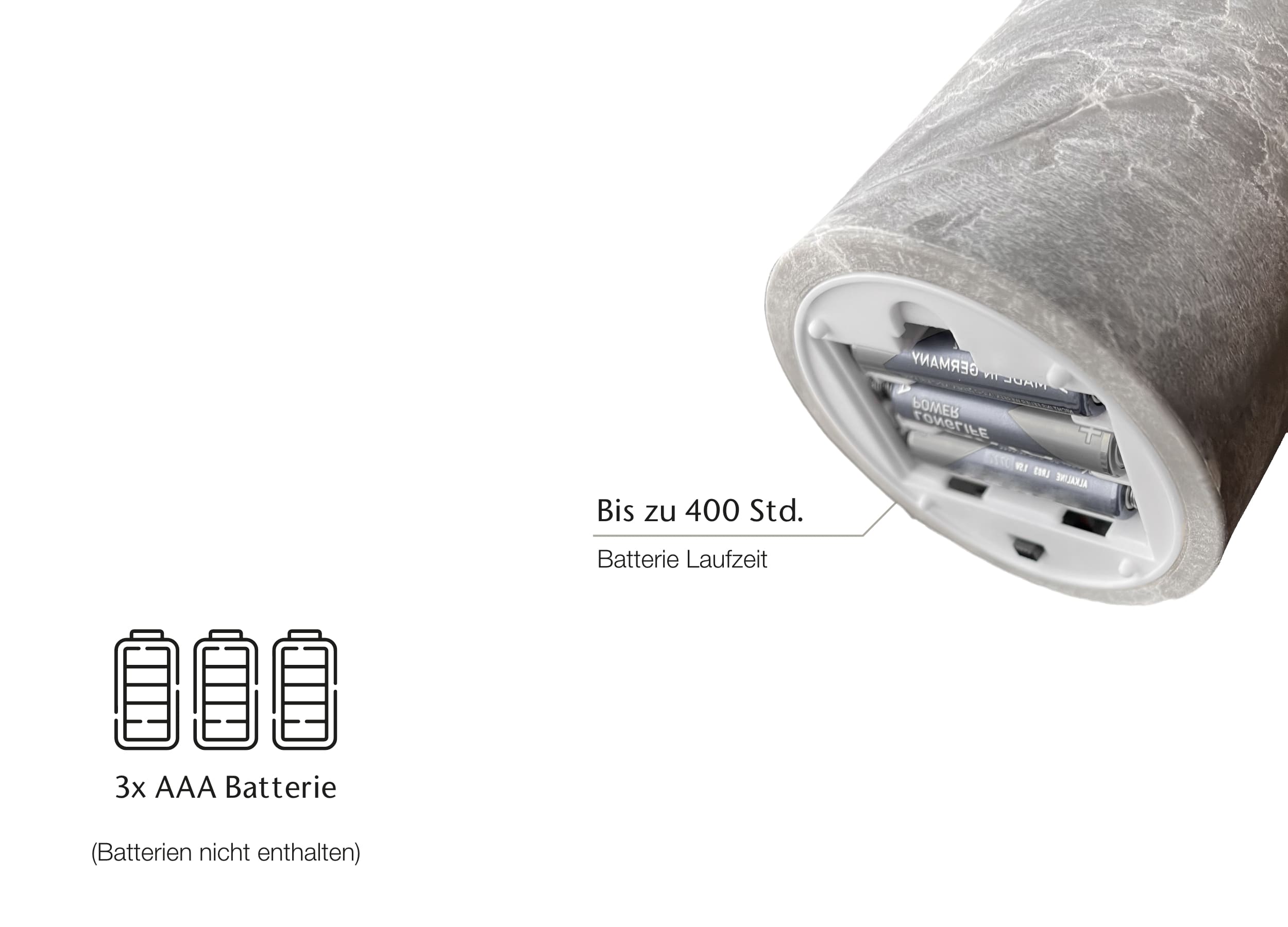 Die Lieferung erfolgt ohne Batterien. Sie benötigen für den Betrieb pro Kerze 3xAAA Batterien. Bitte beachten Sie unsere Batterie-, Entsorgungs- sowie Elektrohinweise für die Produkte von LC Home.
