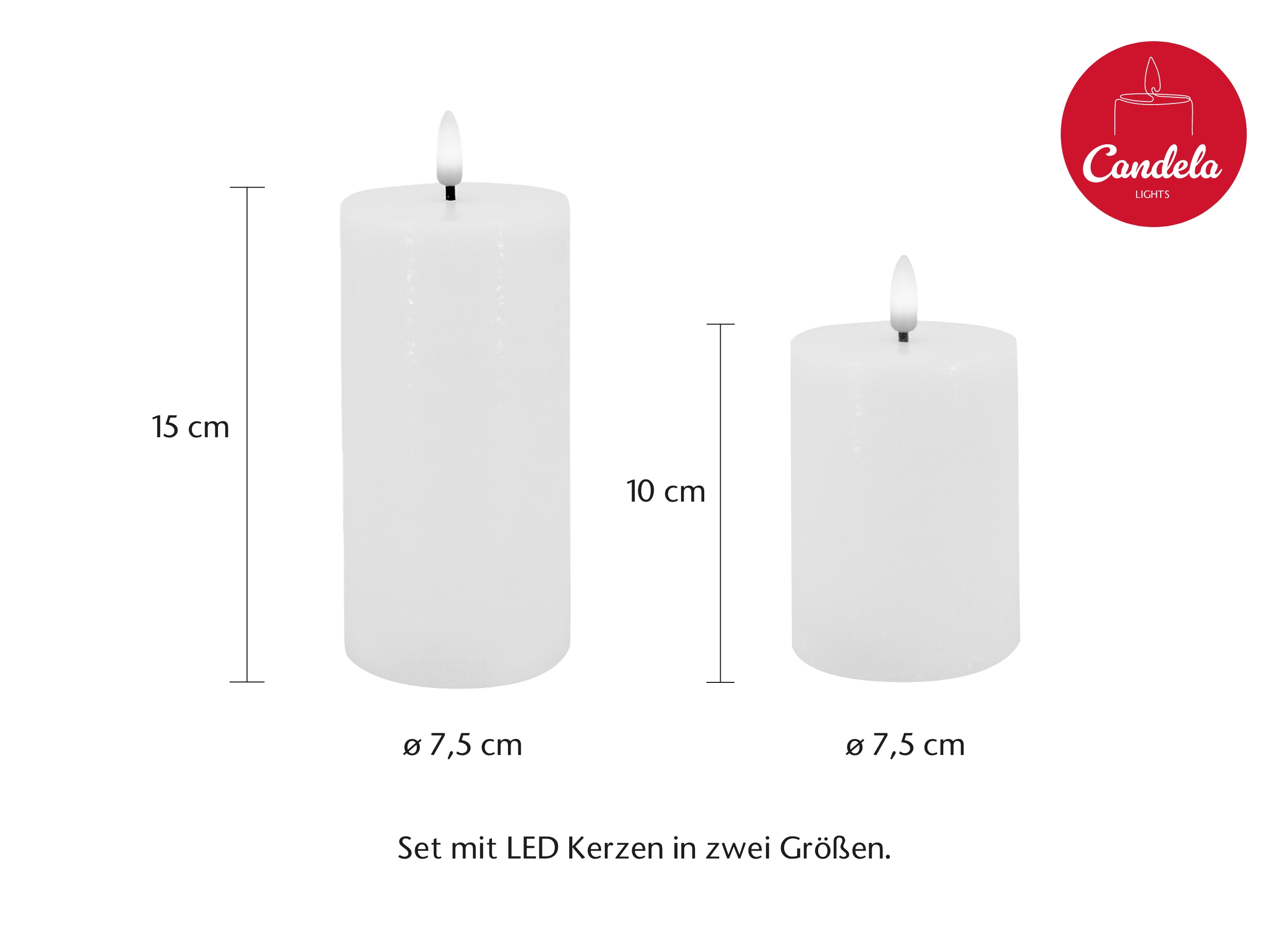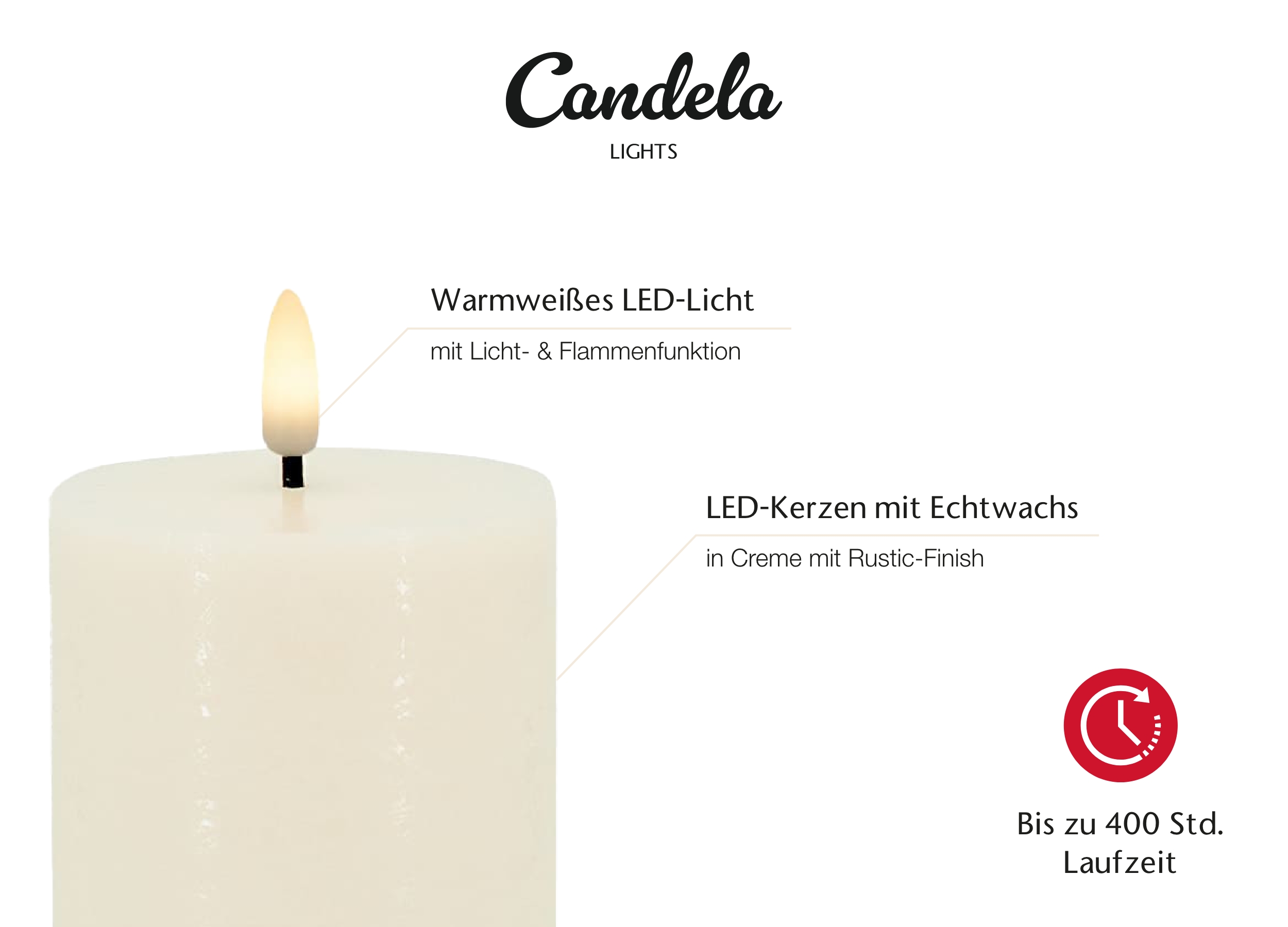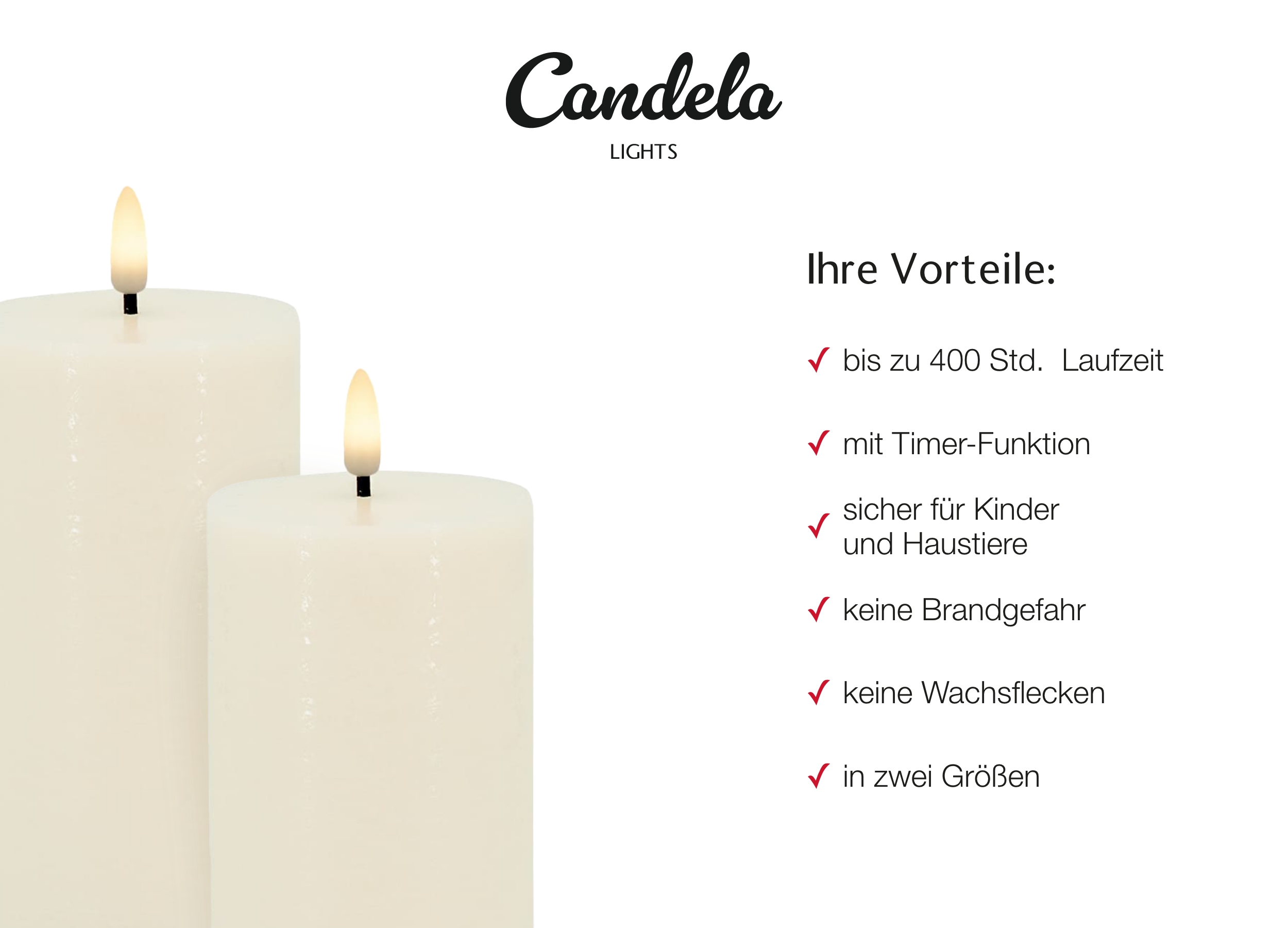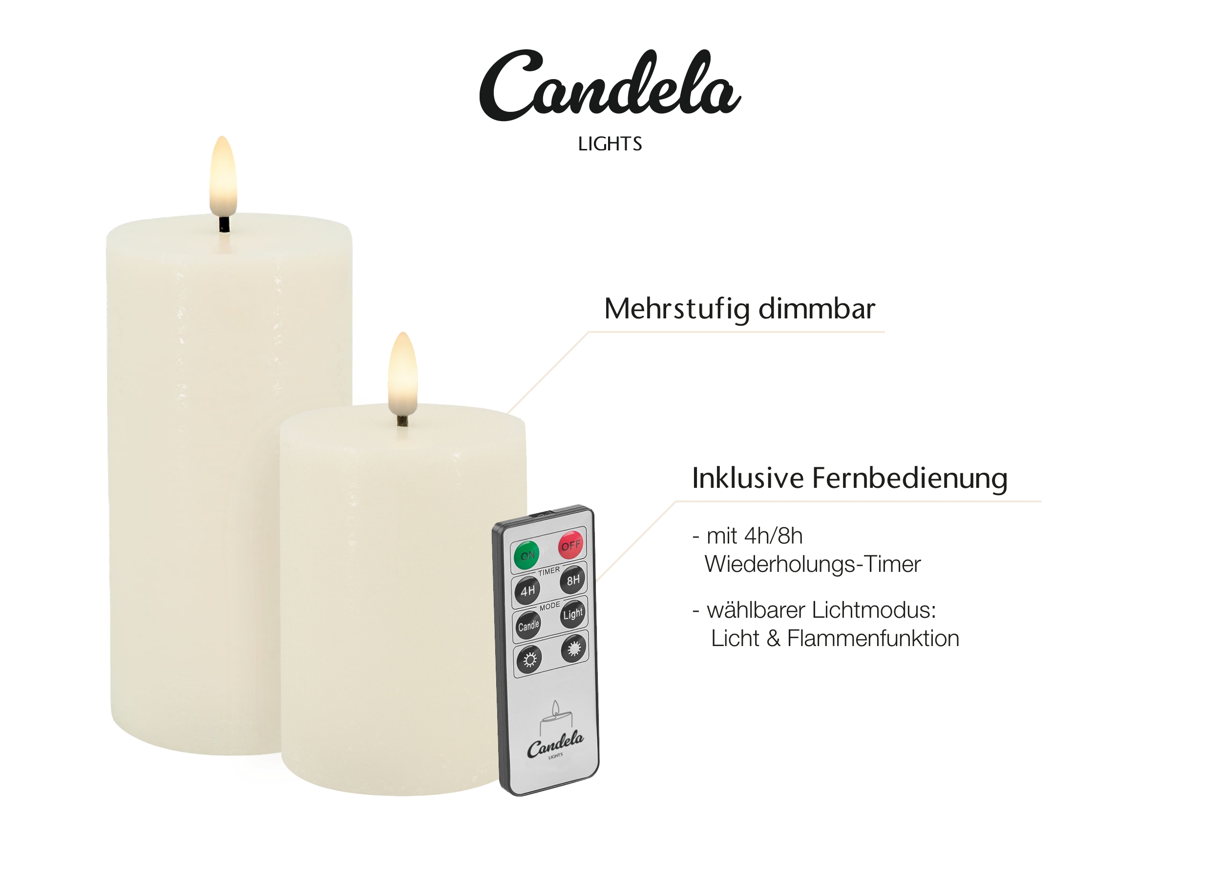 Candela Lights LED Kerzen 2er Set 2 Größen Stumpenkerze creme rustic Echtwachs mit Fernbedienung & Timerfunktion Flammenlose flackernde LED-Kerzen mehrstufig dimmbar