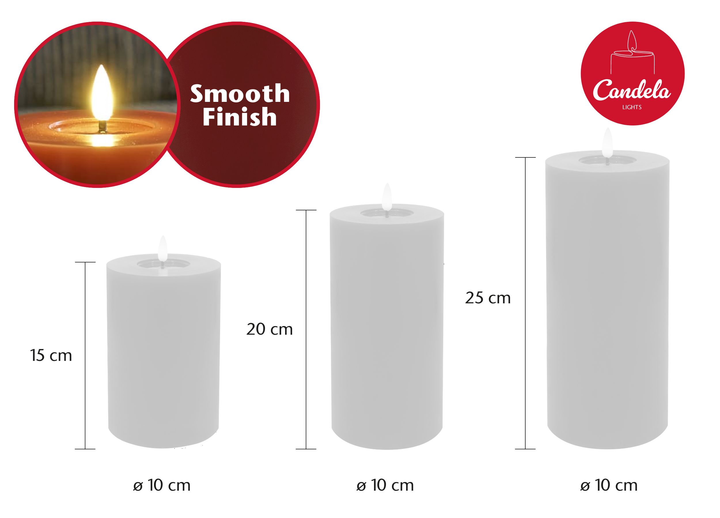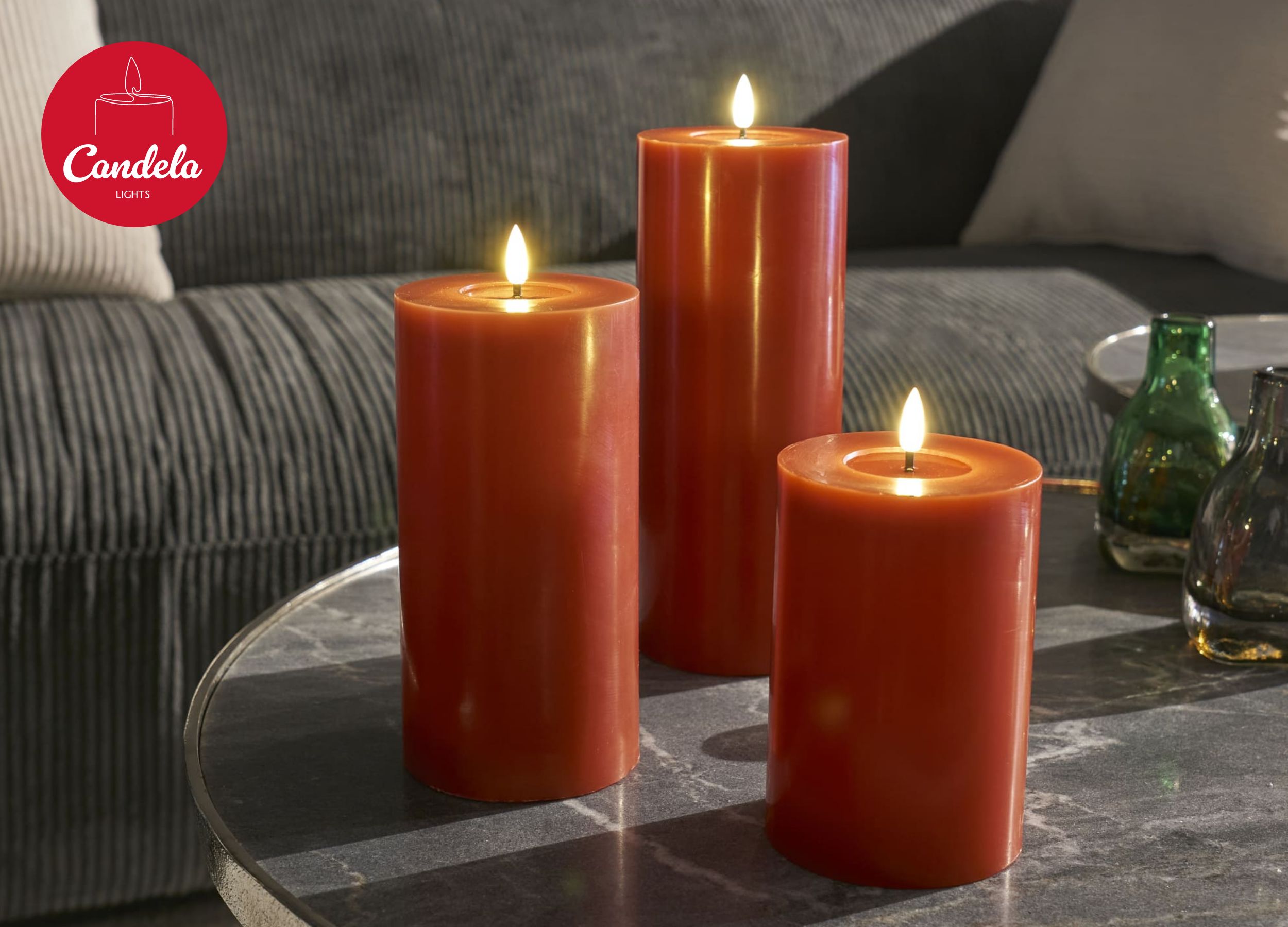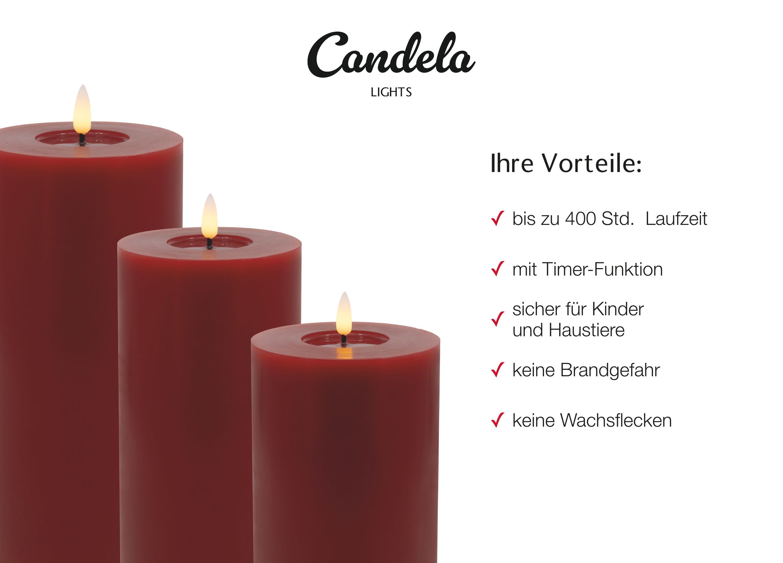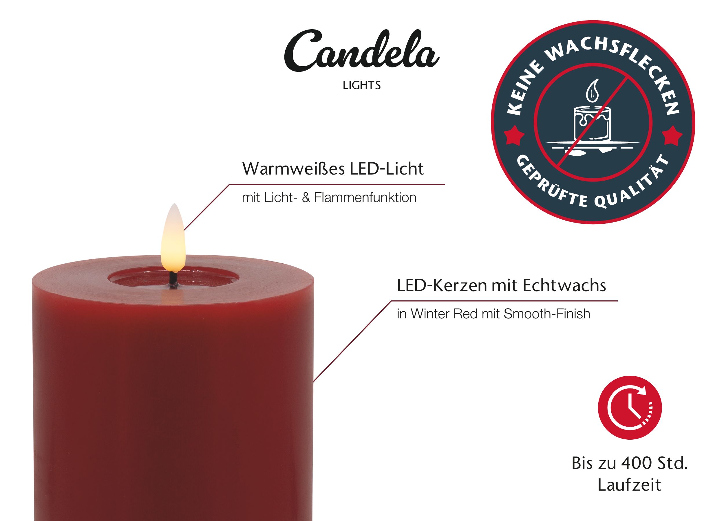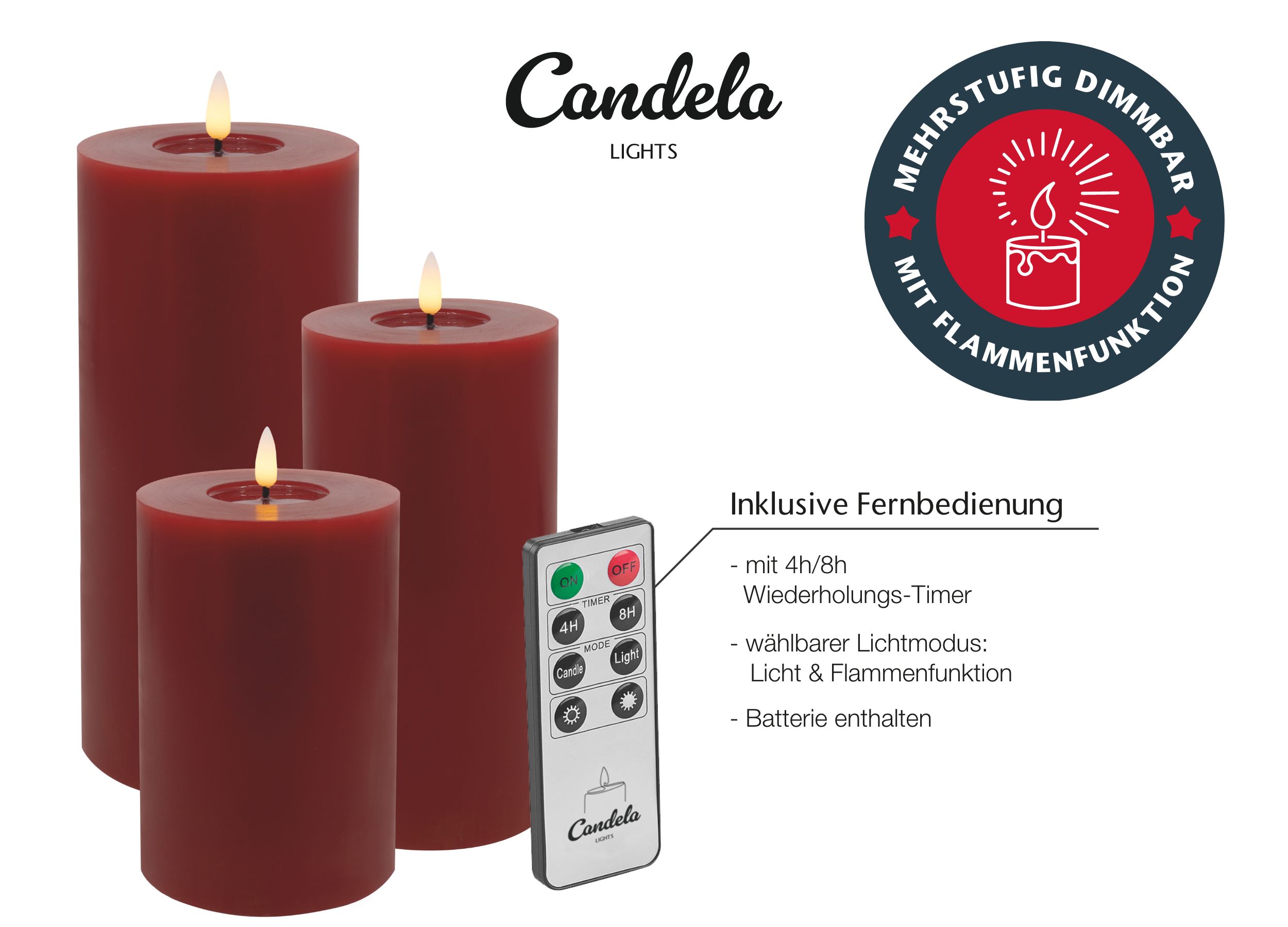Candela Lights LED Kerzen 3er Set Winter Rot glatt Echtwachs inklusive Fernbedienung und 6 Batterien Timer Funktion & mehrstufig dimmbar flammenlos Echtwachskerzen Stumpenkerzen
