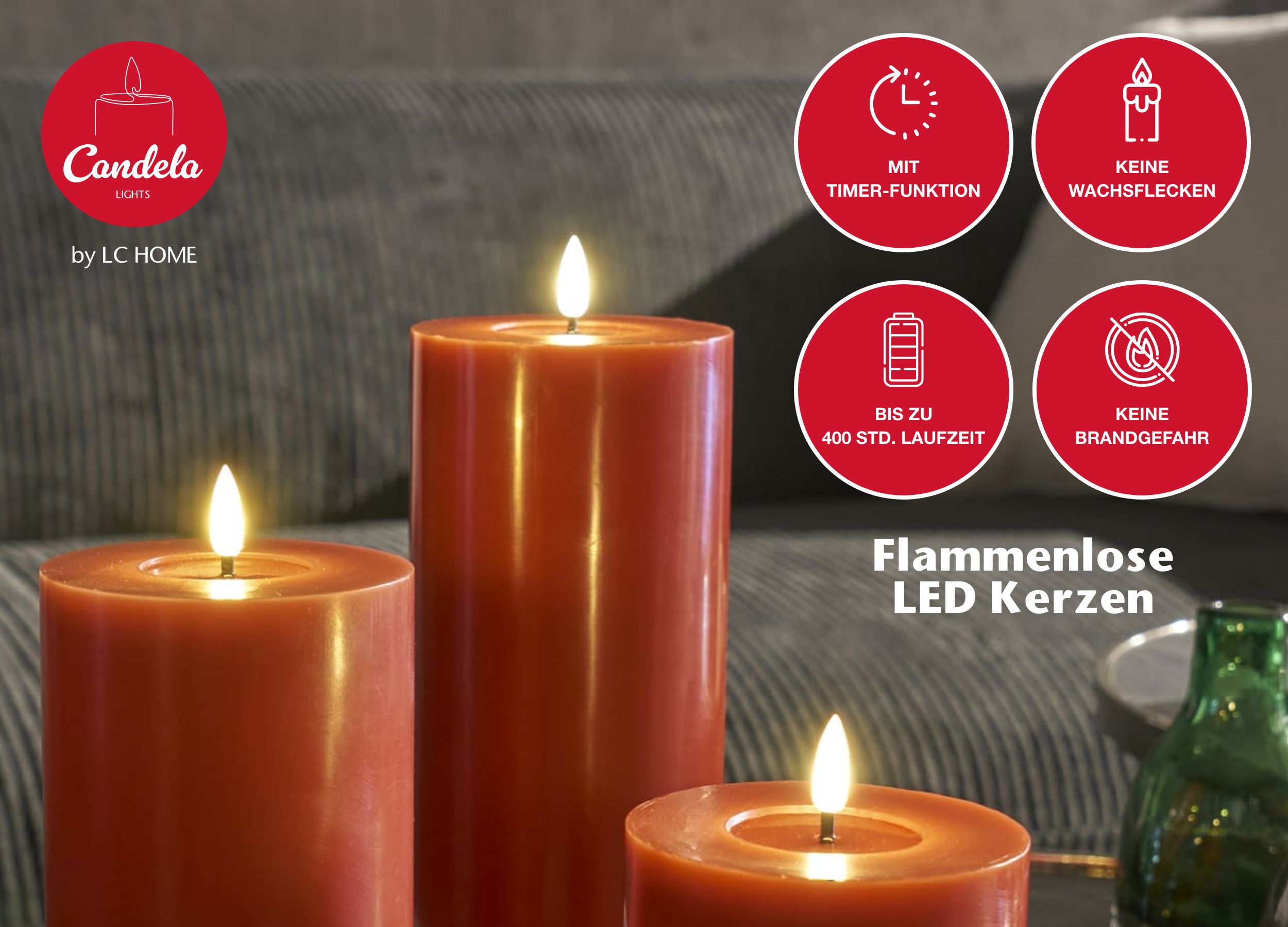 Candela Lights by LC Home sind hochwertige und handgefertigte Echtwachs LED Kerzen, die vor allem durch Ihre Qualität und Funktionalität zu beeindrucken wissen. Diese Echtwachskerzen mit LED Licht sind eine innovative und sichere Alternative zu herkömmlichen Wachskerzen und wirken so realistisch, dass die praktisch nicht von normal brennenden Kerzen zu unterscheiden sind.
