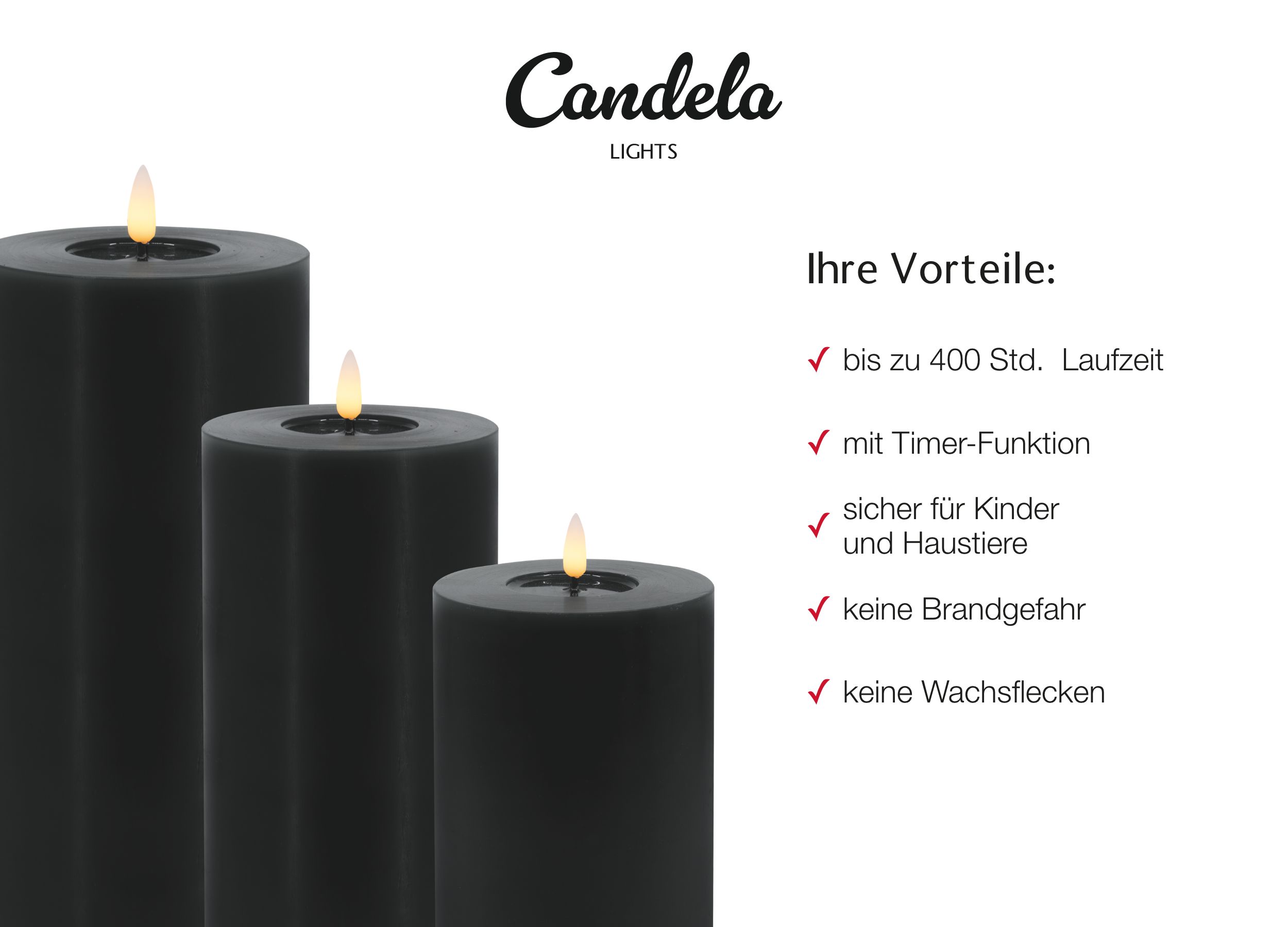 Candela Lights LED Kerzen 3er Set Stumpenkerze schwarz Echtwachs mit Fernbedienung Timer Funktion & mehrstufig dimmbar bewegliche Flamme Echtwachskerzen