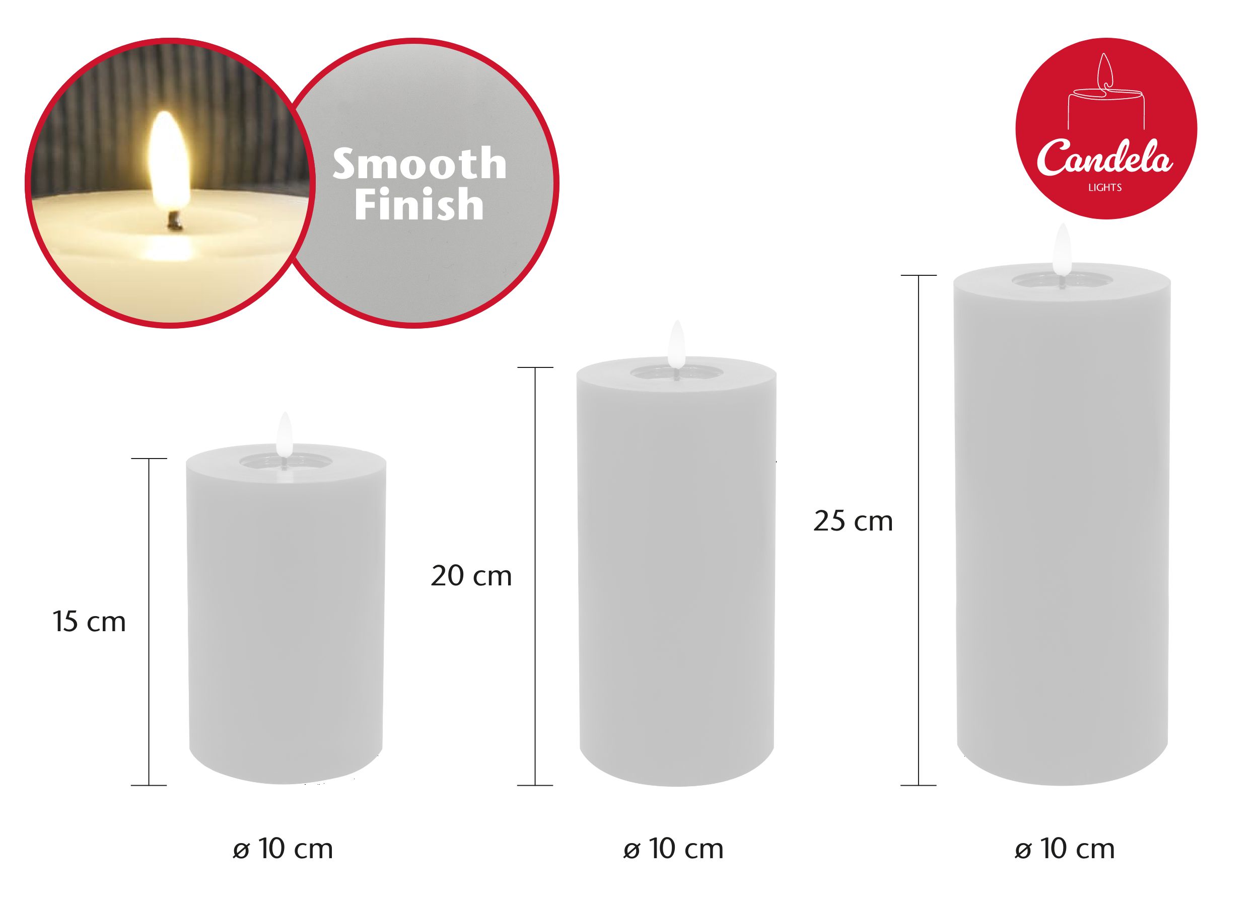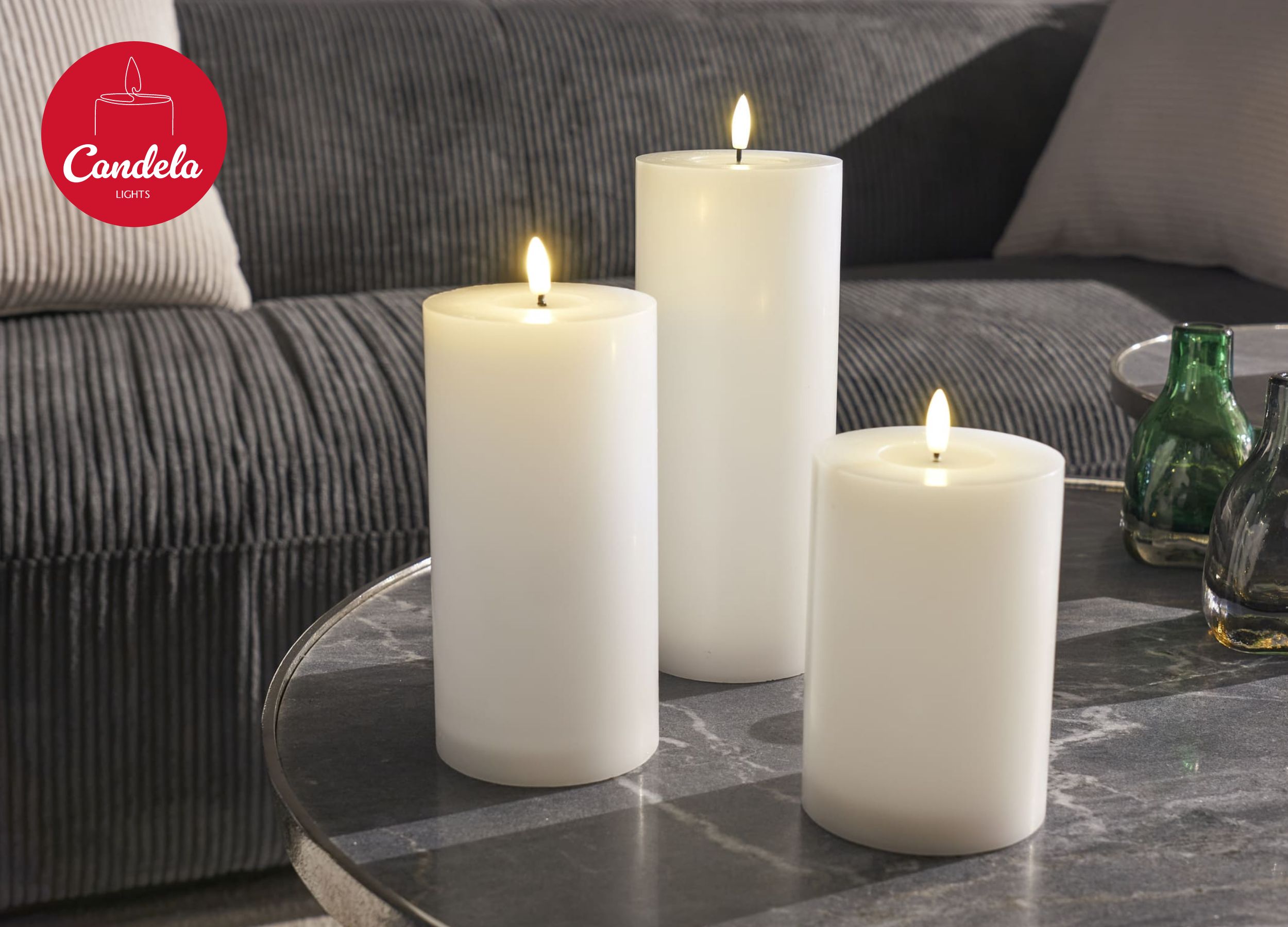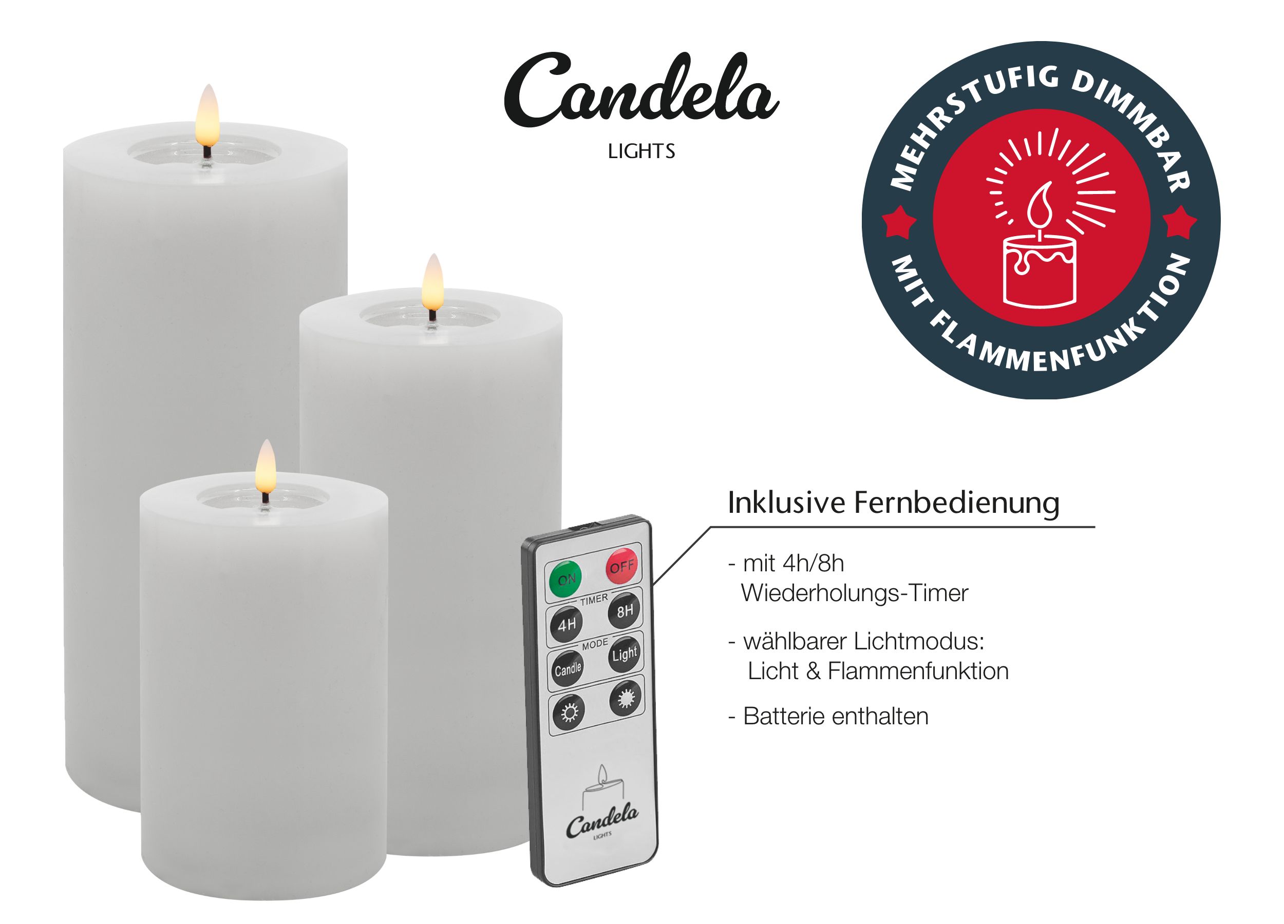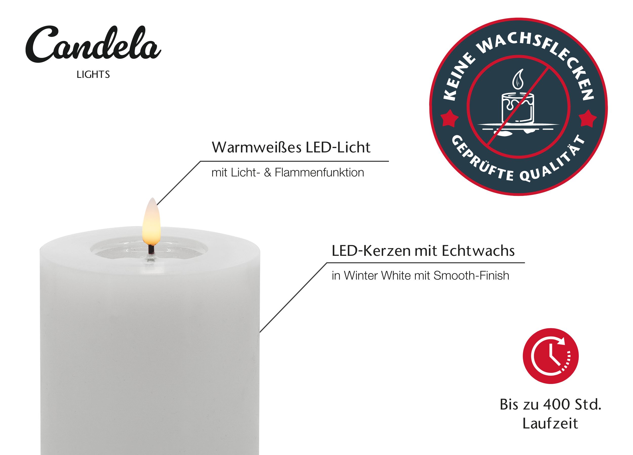 Candela Lights LED Kerzen 3er Set Winter Weiß glatt Echtwachs inklusive Fernbedienung und 6 Batterien Timer Funktion & mehrstufig dimmbar flammenlos Echtwachskerzen Stumpenkerzen