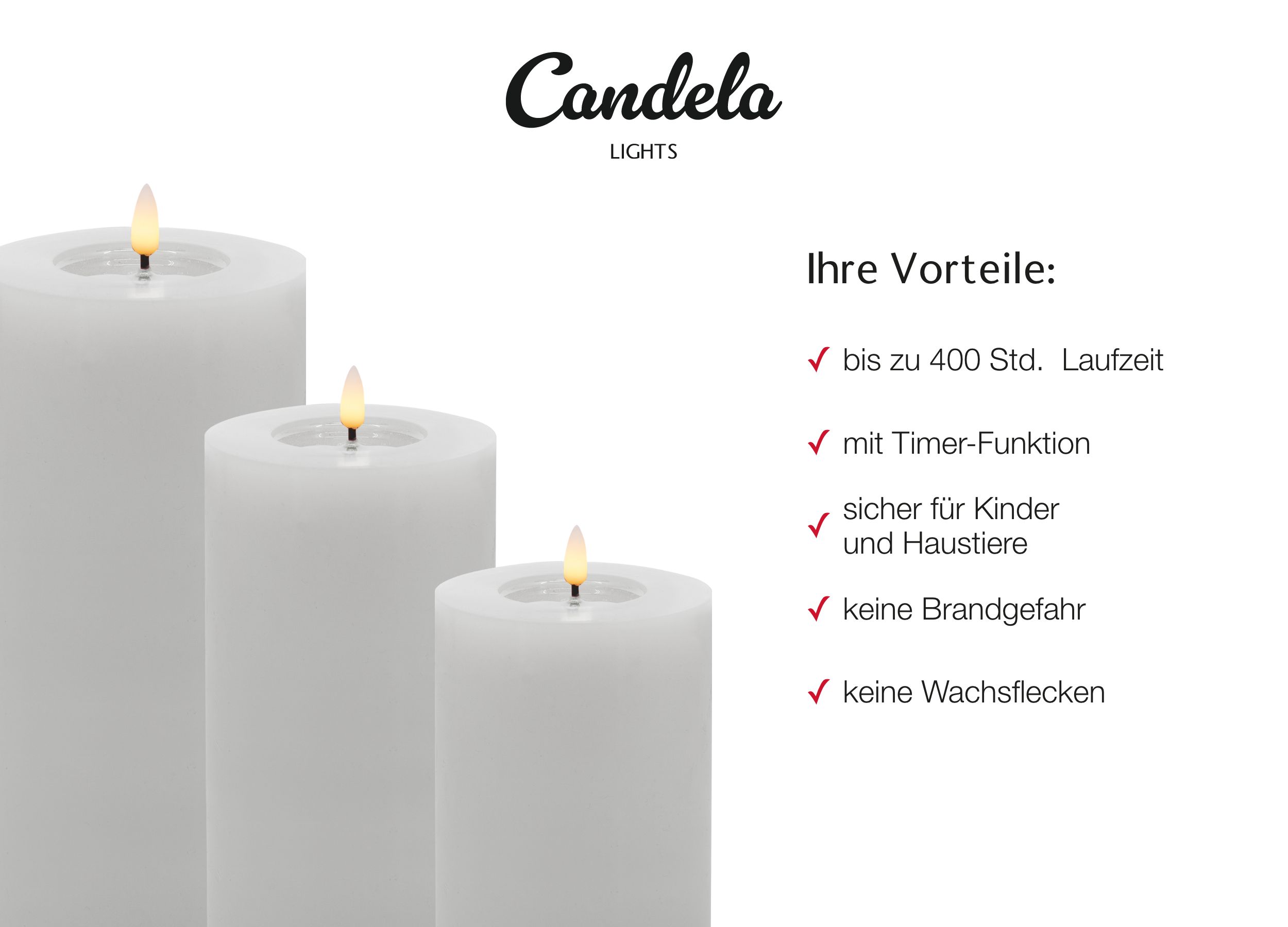 Candela Lights LED Kerzen 3er Set Stumpenkerze weiß Echtwachs mit Fernbedienung Timer Funktion & mehrstufig dimmbar bewegliche Flamme Echtwachskerzen