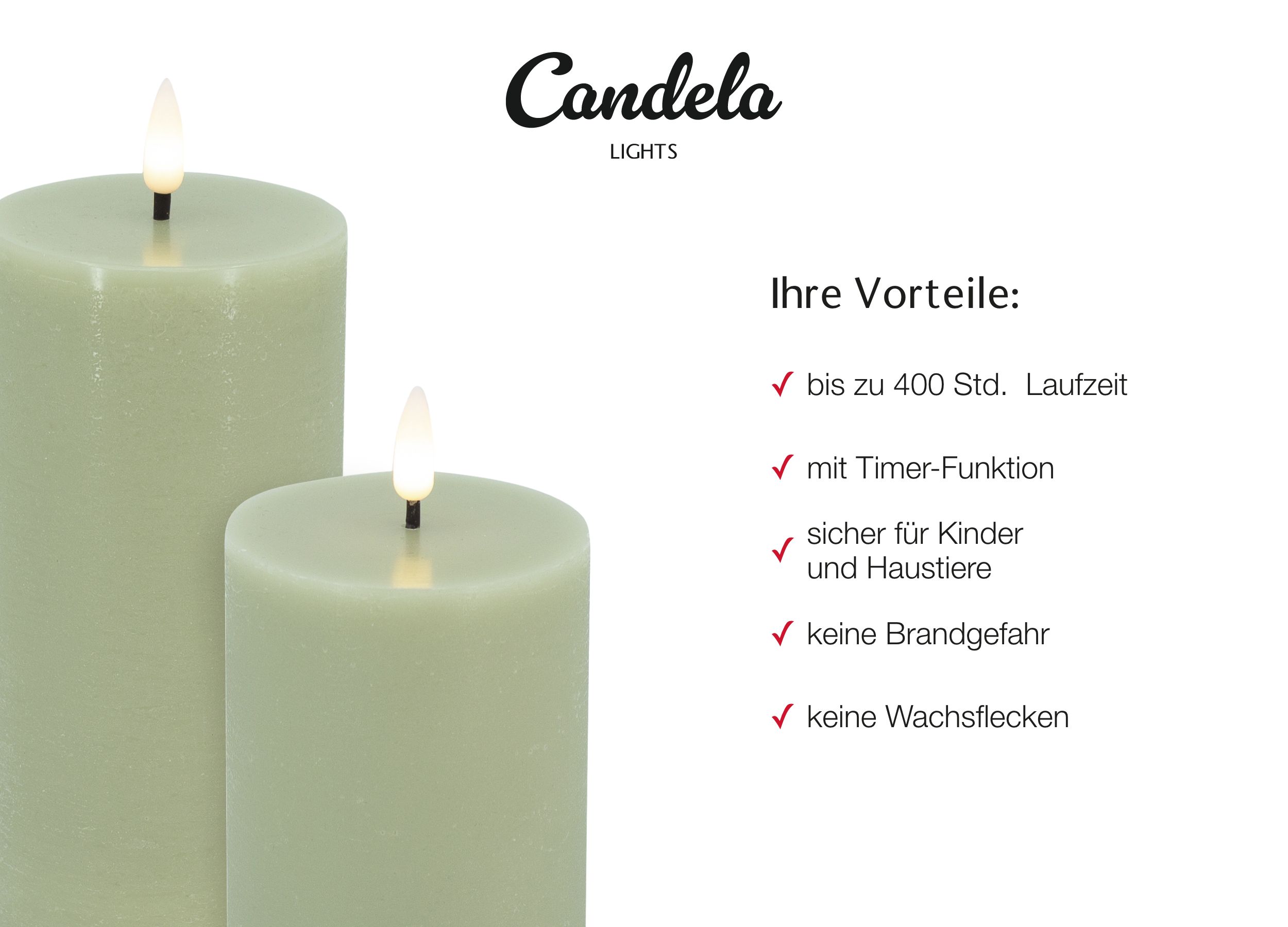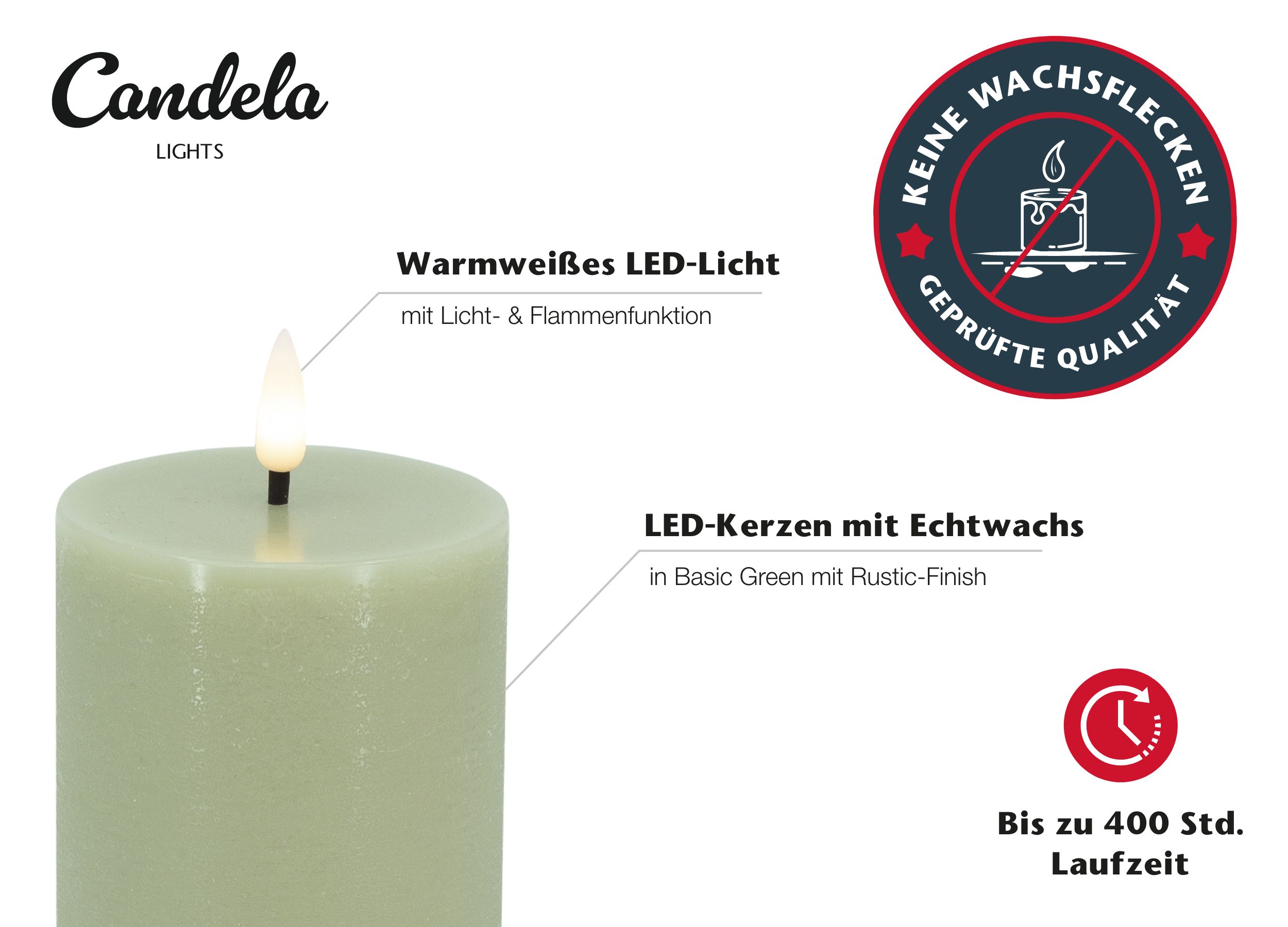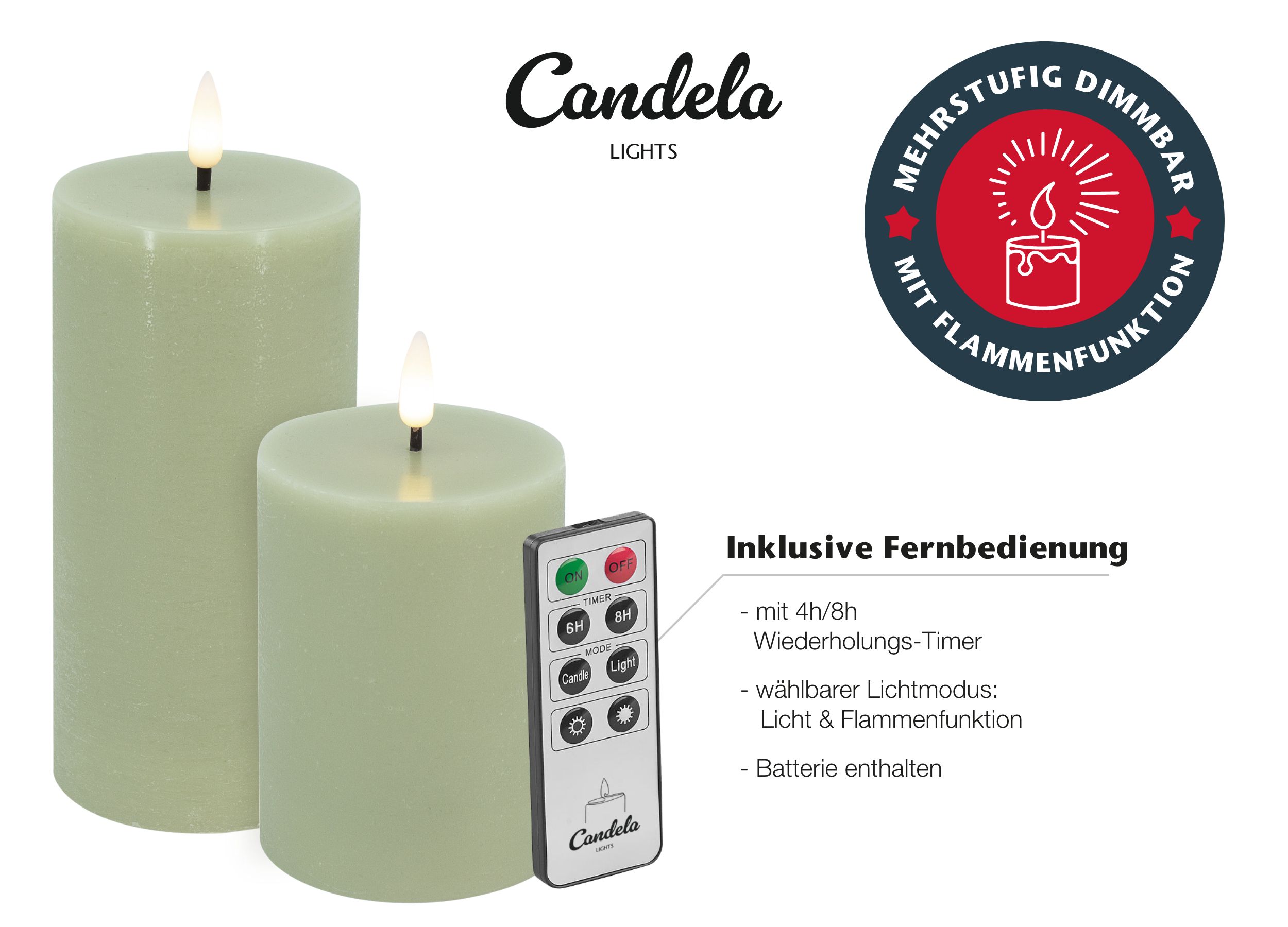 Candela Lights LED Kerzen 4er Set Basic Grün rustic Echtwachs inklusive Fernbedienung und 8 Batterien Timer Funktion & mehrstufig dimmbar flammenlos Echtwachskerzen Stumpenkerzen