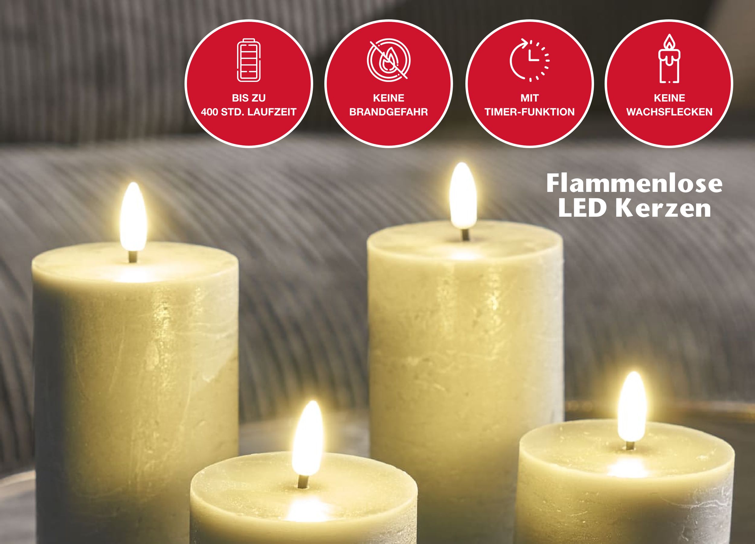 Dank des in sorgfältiger Handarbeit gearbeiteten Echtwachsmantels, ist jede LED-Kerze ein Unikat, welches Ihre Räume auf besondere Weise beleuchten wird. Die Kombination von moderner LED-Technologie und handgefertigtem Echtwachs schafft eine warme und einladende Atmosphäre, ohne dabei auf die Sicherheit und Bequemlichkeit einer LED-Beleuchtung zu verzichten. Diese LED Kerzen wirken so realistisch, sie sind praktisch fast nicht von normal brennenden Kerzen zu unterscheiden.