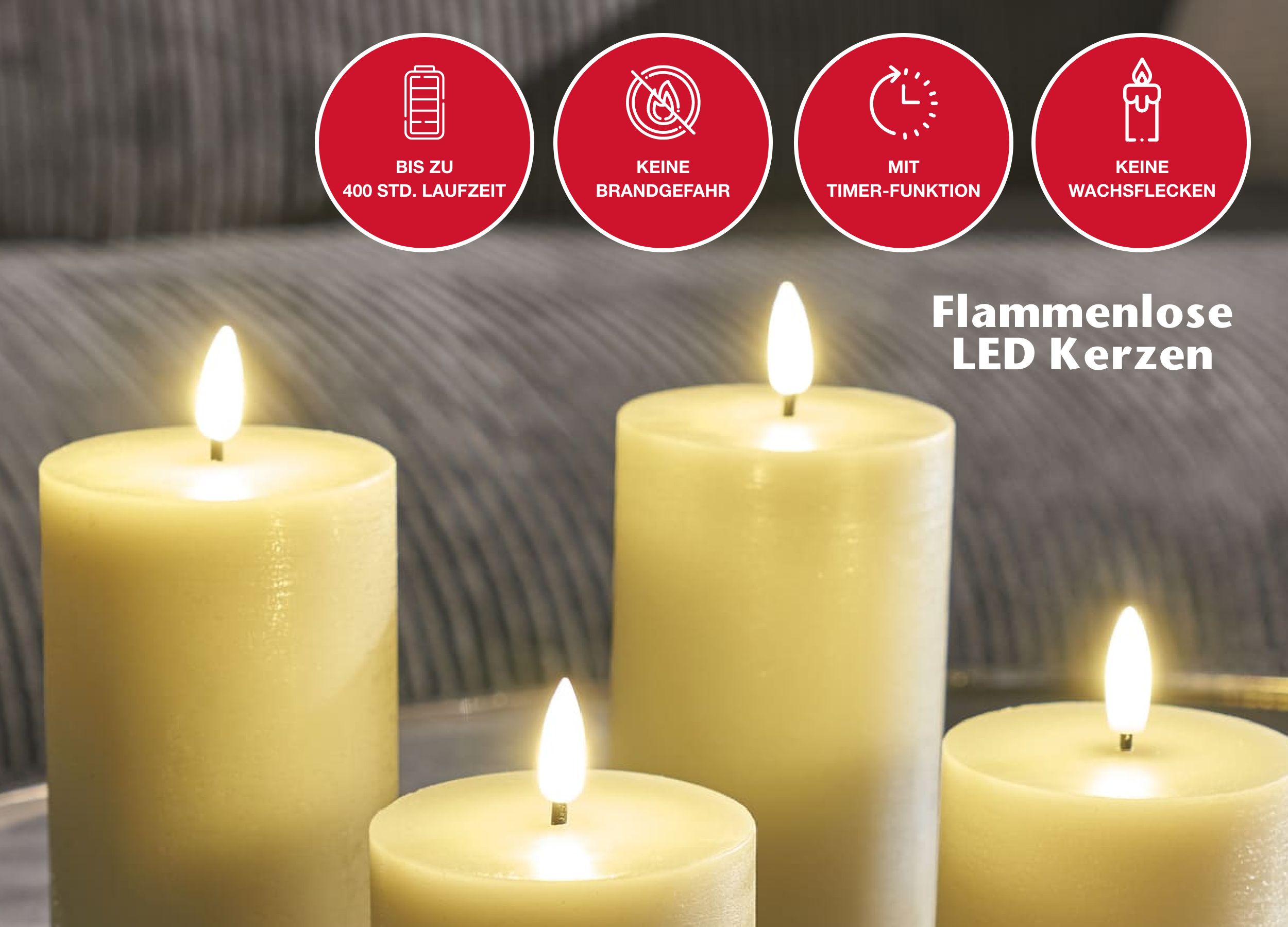 Dank des in sorgfältiger Handarbeit gearbeiteten Echtwachsmantels, ist jede LED-Kerze ein Unikat, welches Ihre Räume auf besondere Weise beleuchten wird. Die Kombination von moderner LED-Technologie und handgefertigtem Echtwachs schafft eine warme und einladende Atmosphäre, ohne dabei auf die Sicherheit und Bequemlichkeit einer LED-Beleuchtung zu verzichten. Diese LED Kerzen wirken so realistisch, sie sind praktisch fast nicht von normal brennenden Kerzen zu unterscheiden.