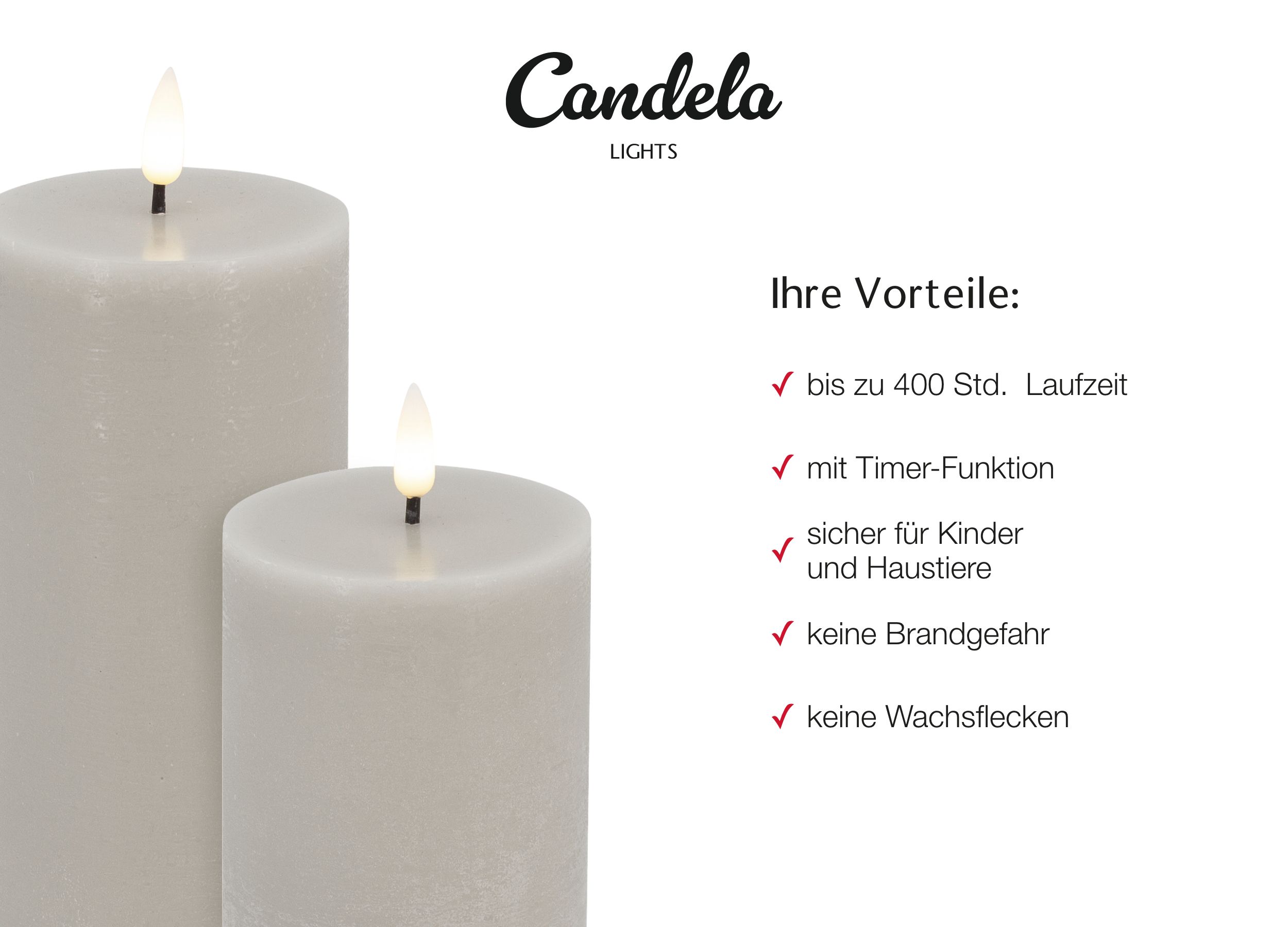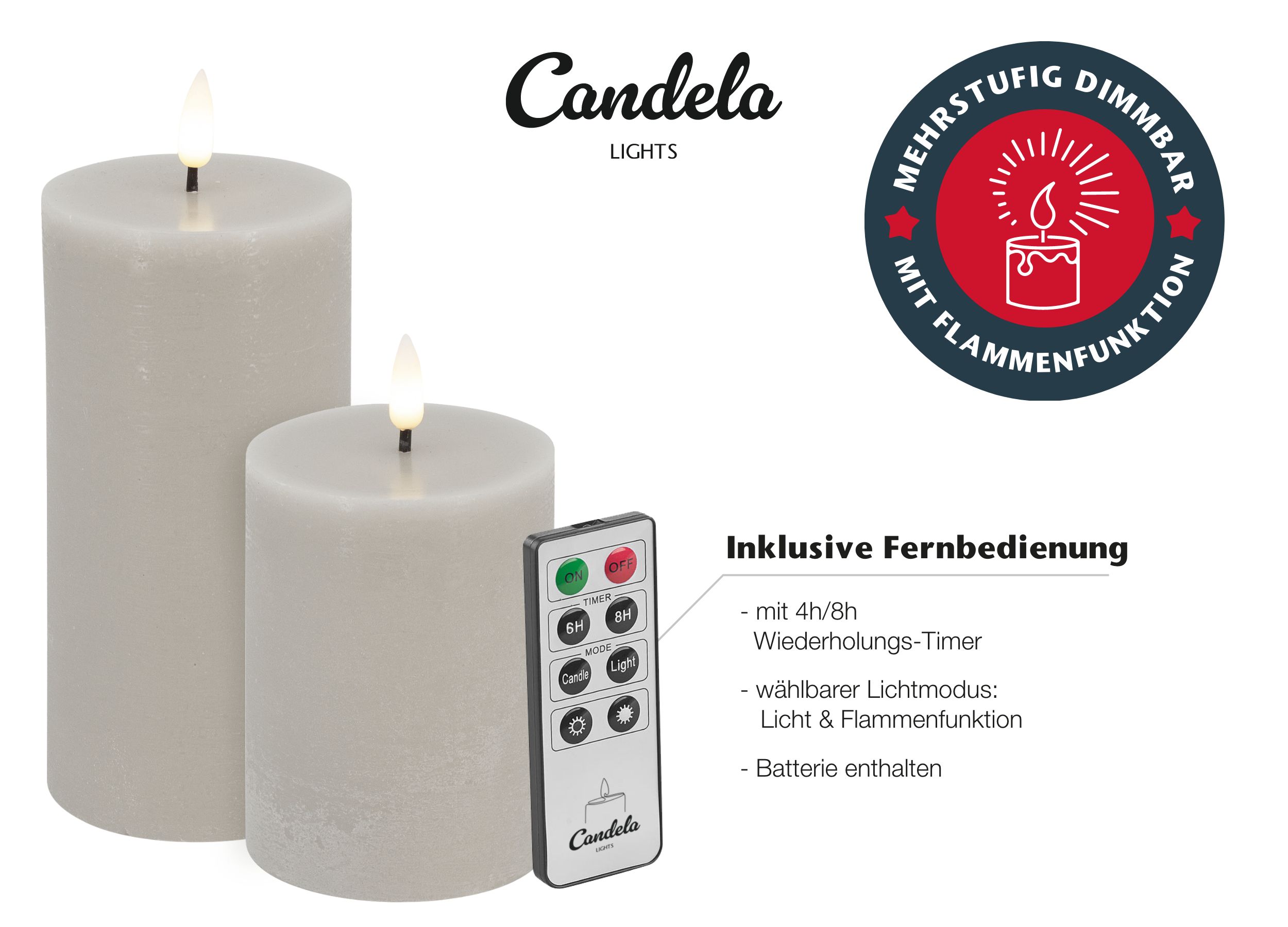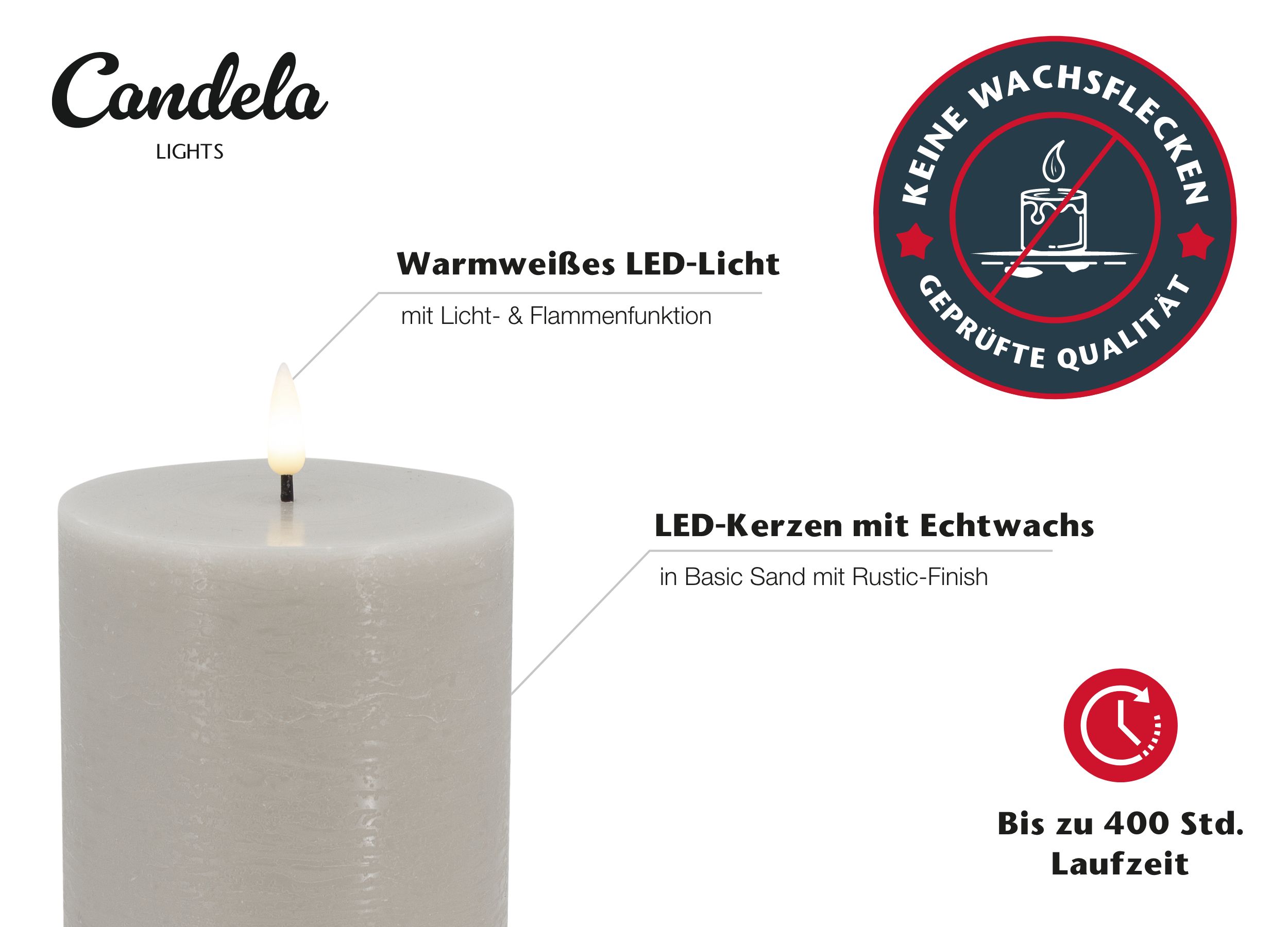 Candela Lights LED Kerzen 4er Set Basic Sand rustic Echtwachs inklusive Fernbedienung und 8 Batterien Timer Funktion & mehrstufig dimmbar flammenlos Echtwachskerzen Stumpenkerzen