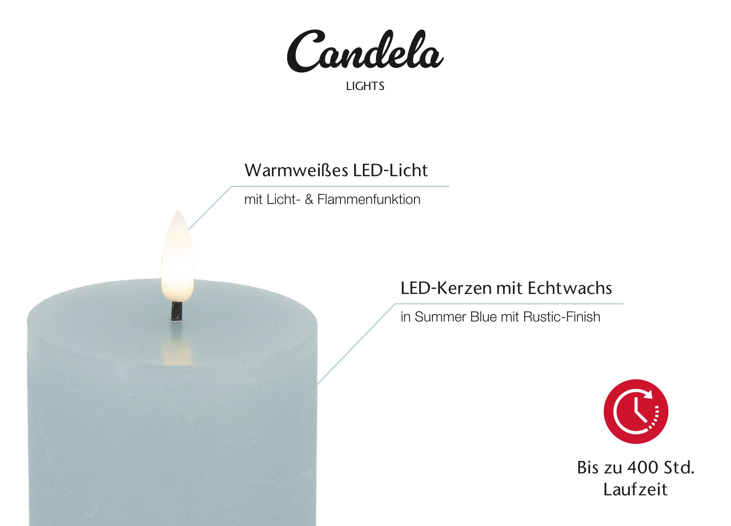 Candela Lights LED Kerzen 4er Set H:20xØ10cm Summer Blue rustic Stumpenkerze Echtwachs mit Fernbedienung & Timerfunktion Flammenlose flackernde LED-Kerze mehrstufig dimmbar