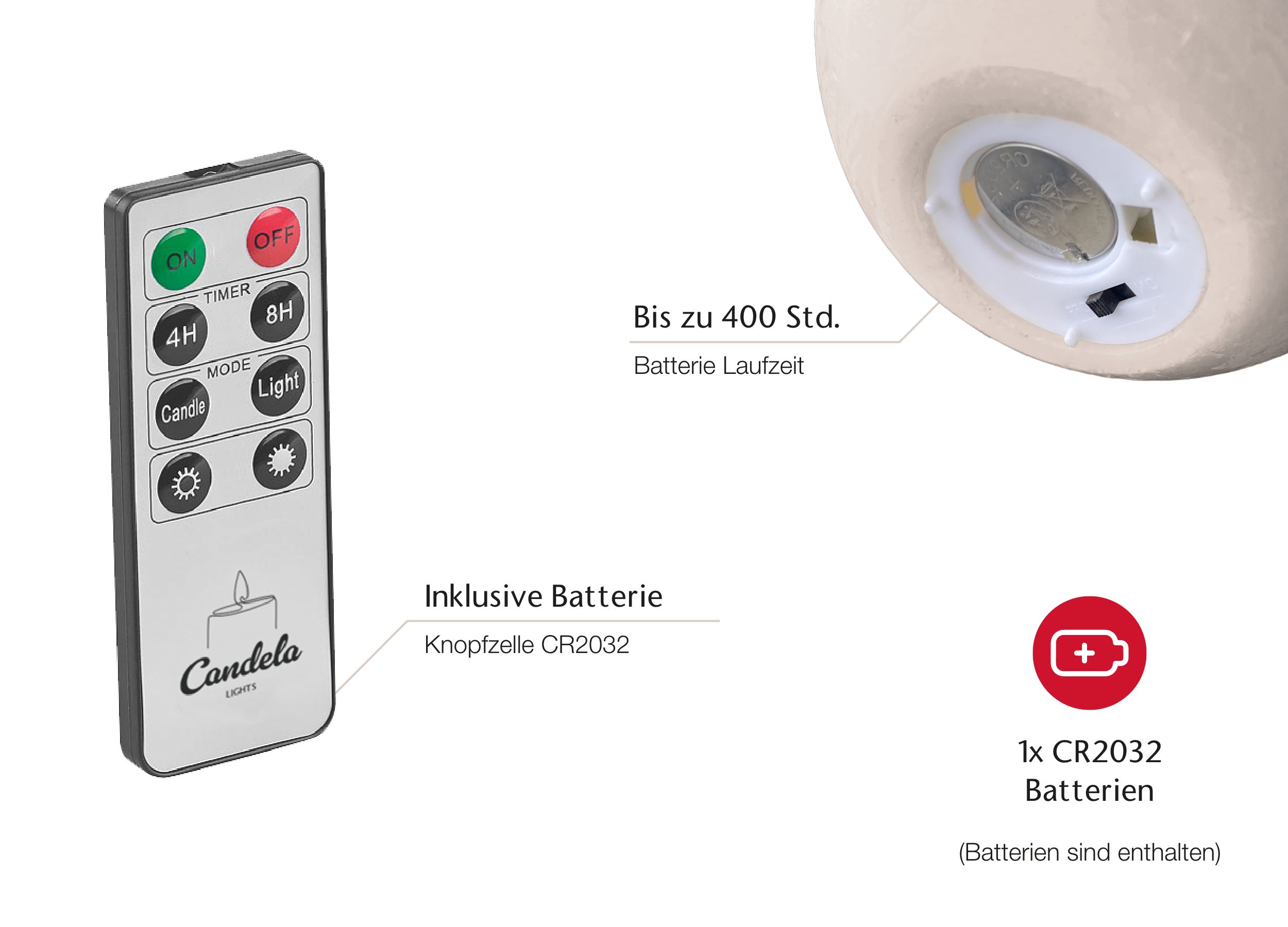 Die Lieferung erfolgt inkl. Batterien. Sie benötigen für den Betrieb CR2032 Batterien. Bitte beachten Sie unsere Batterie-, Entsorgungs- sowie Elektrohinweise für die Produkte von LC Home.